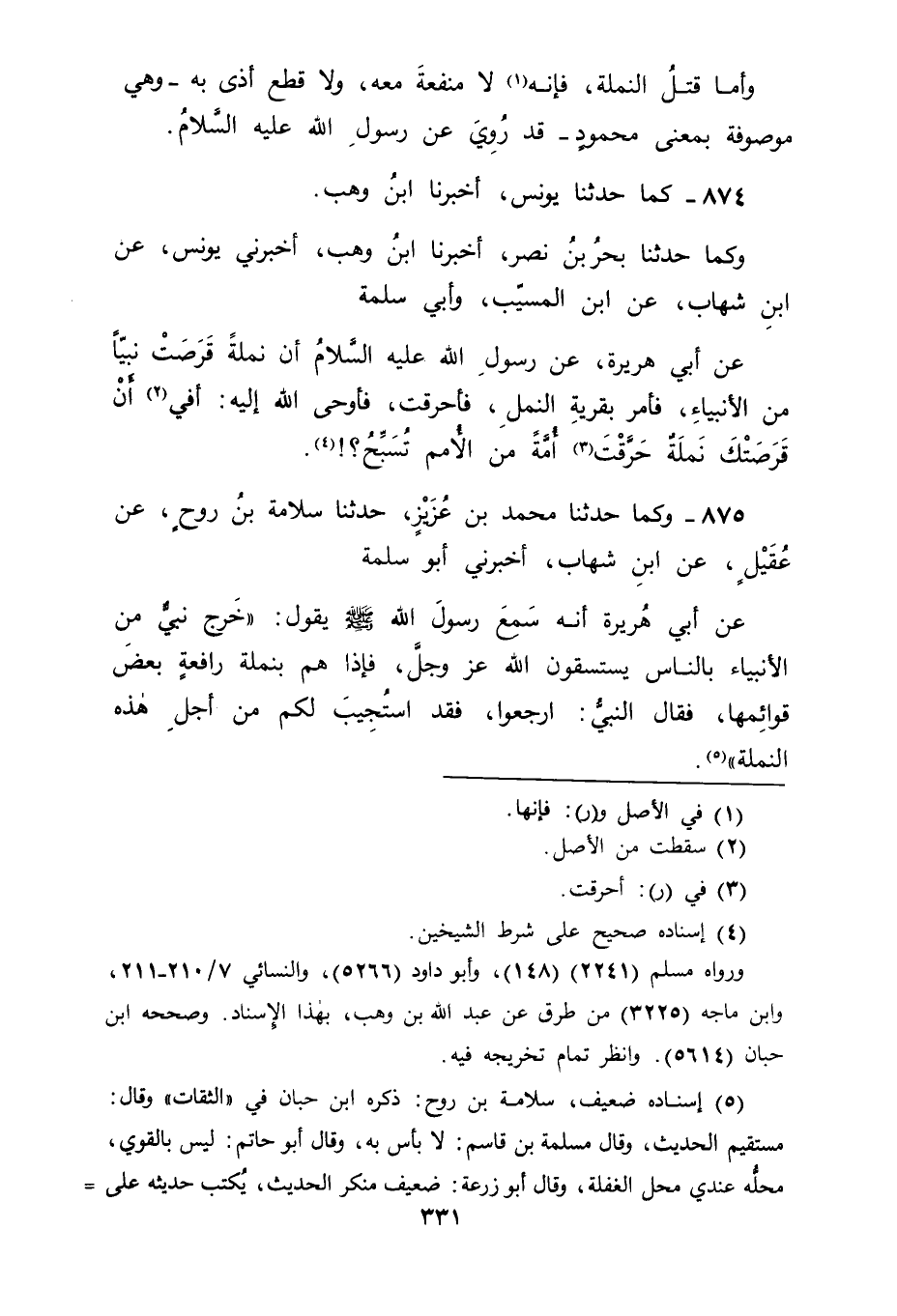874 - كَمَا حَدَّثَنَا يُونُسُ، أَخْبَرَنَا ابْنُ وَهْبٍ، وَكَمَا حَدَّثَنَا بَحْرُ بْنُ نَصْرٍ، أَخْبَرَنَا ابْنُ وَهْبٍ، أَخْبَرَنِي يُونُسُ، عَنِ ابْنِ شِهَابٍ، عَنِ ابْنِ الْمُسَيِّبِ، وَأَبِي سَلَمَةَ عَنْ أَبِي هُرَيْرَةَ، عَنْ رَسُولِ اللهِ عَلَيْهِ السَّلَامُ: " أَنَّ نَمْلَةً قَرَصَتْ نَبِيًّا مِنَ الْأَنْبِيَاءِ، فَأَمَرَ بِقَرْيَةِ النَّمْلِ فَأُحْرِقَتْ، فَأَوْحَى اللهُ إلَيْهِ أَفِي أَنْ قَرَصَتْكَ نَمْلَةٌ حَرَقْتَ أُمَّةً مِنَ الْأُمَمِ تُسَبِّحُ؟ "