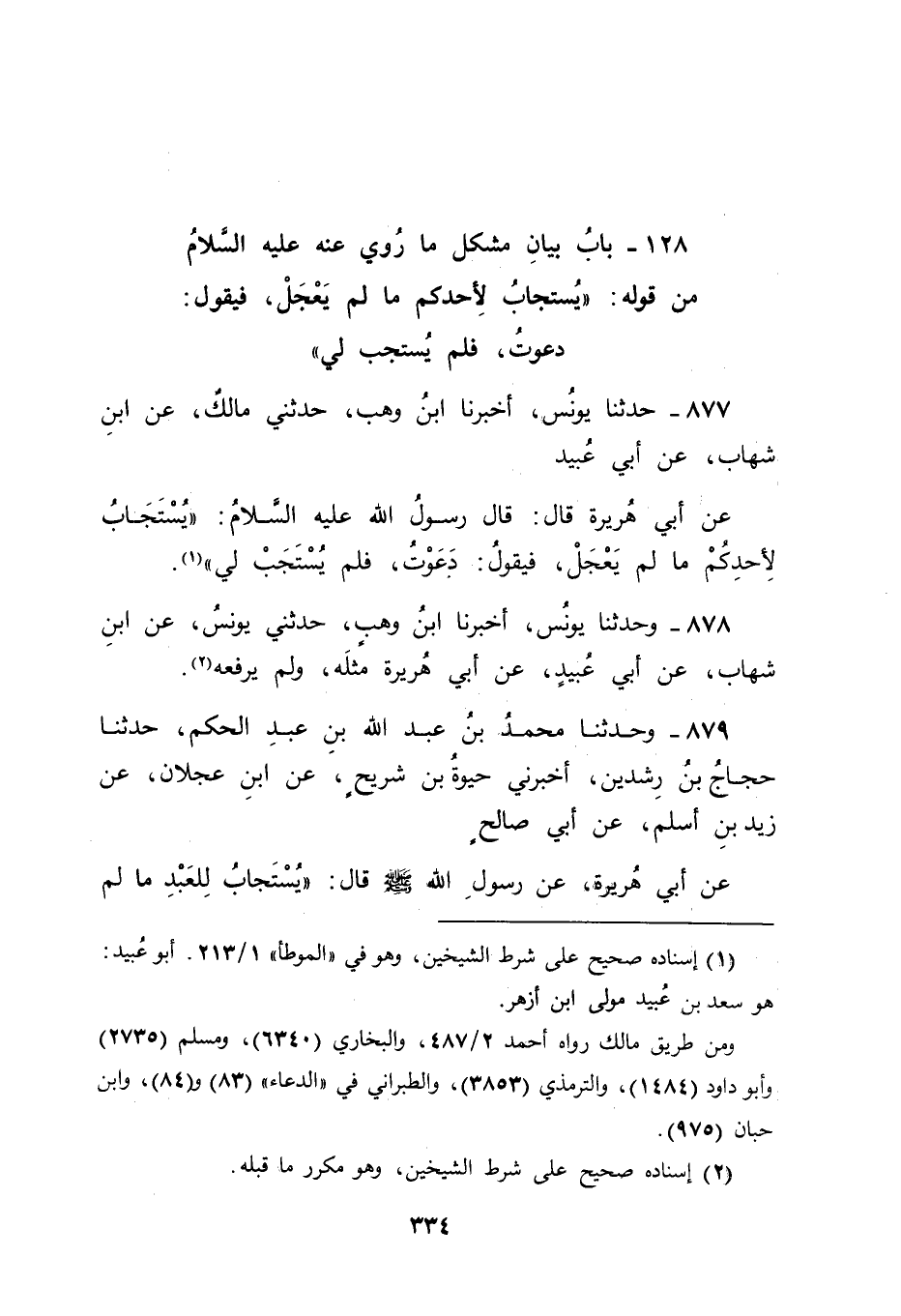 877 - حَدَّثَنَا يُونُسُ، أَخْبَرَنَا ابْنُ وَهْبٍ، حَدَّثَنِي مَالِكٌ، عَنِ ابْنِ شِهَابٍ، عَنْ أَبِي عُبَيْدٍ، عَنْ أَبِي هُرَيْرَةَ قَالَ: قَالَ رَسُولُ اللهِ عَلَيْهِ السَّلَامُ: " يُسْتَجَابُ لِأَحَدِكُمْ مَا لَمْ يَعْجَلْ فَيَقُولُ: دَعَوْتُ فَلَمْ يُسْتَجَبْ لِي "