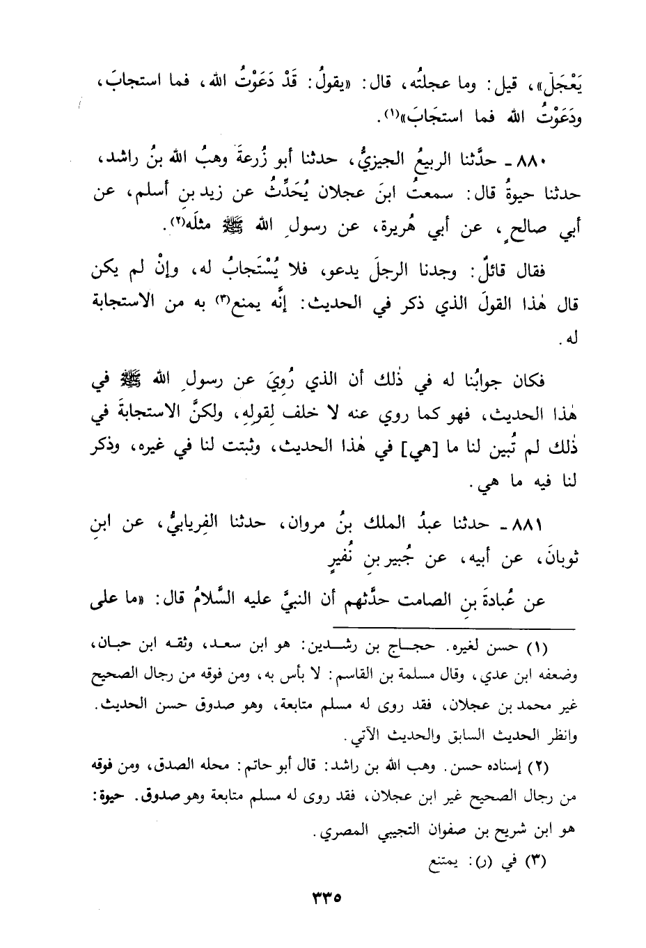 881 - حَدَّثَنَا عَبْدُ الْمَلِكِ بْنُ مَرْوَانَ، حَدَّثَنَا الْفِرْيَابِيُّ، عَنِ ابْنِ ثَوْبَانَ، عَنْ أَبِيهِ، عَنْ جُبَيْرِ بْنِ نُفَيْرٍ، عَنْ عُبَادَةَ بْنِ الصَّامِتِ، حَدَّثَهُمْ أَنَّ النَّبِيَّ عَلَيْهِ السَّلَامُ قَالَ: " مَا عَلَى -[336]- الْأَرْضِ مِنْ رَجُلٍ مُسْلِمٍ يَدْعُو اللهَ عَزَّ وَجَلَّ بِدَعْوَةٍ إلَّا آتَاهُ اللهُ إيَّاهَا، أَوْ صَرَفَ عَنْهُ مِنَ السُّوءِ مِثْلَهَا مَا لَمْ يَدْعُ بِإِثْمٍ، أَوْ قَطِيعَةِ رَحِمٍ " فَقَالَ رَجُلٌ مِنَ الْقَوْمِ: إذًا نُكْثِرُ يَا رَسُولَ اللهِ فَقَالَ: " اللهُ أَكْثَرُ "