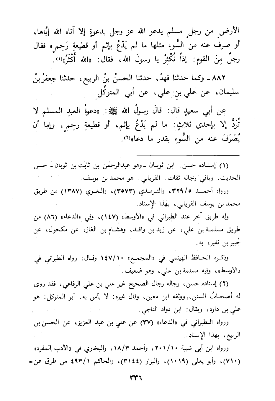 882 - وَكَمَا حَدَّثَنَا فَهْدٌ، حَدَّثَنَا الْحَسَنُ بْنُ الرَّبِيعِ، حَدَّثَنَا جَعْفَرُ بْنُ سُلَيْمَانَ، عَنْ عَلِيِّ بْنِ عَلِيٍّ، عَنْ أَبِي الْمُتَوَكِّلِ، عَنْ أَبِي سَعِيدٍ قَالَ: قَالَ رَسُولُ اللهِ صَلَّى اللَّهُ عَلَيْهِ وَسَلَّمَ: " دَعْوَةُ الْعَبْدِ الْمُسْلِمِ لَا تُرَدُّ إلَّا بِإِحْدَى ثَلَاثٍ، مَا لَمْ يَدْعُ بِإِثْمٍ أَوْ قَطِيعَةِ رَحِمٍ، وَإِمَّا أَنْ يُصْرَفَ عَنْهُ مِنَ السُّوءِ بِقَدْرِ مَا دَعَا " -[337]- فَبَيَّنَ لَنَا رَسُولُ اللهِ صَلَّى اللَّهُ عَلَيْهِ وَسَلَّمَ فِي هَذَيْنِ الْحَدِيثَيْنِ الِاسْتِجَابَةَ مِنَ اللهِ تَعَالَى لِمَنْ يَدْعُوهُ مَا هِيَ بَعْدَ أَنْ يَكُونَ مَا يَدْعُوهُ بِهِ لَيْسَ بِإِثْمٍ وَلَا بِقَطِيعَةِ رَحِمٍ وَأَنَّهَا أَنْ يُعْطِيَ مَنْ دَعَاهُ مَا دَعَا فَيَعْلَمَ ذَلِكَ أَوْ يَصْرِفَ عَنْهُ مِنَ السُّوءِ مَا هُوَ خَيْرٌ لَهُ مِمَّا دَعَا فَلَا يَعْلَمُ ذَلِكَ، فَبَانَ بِمَا ذَكَرْنَا مَعْنَى مَا فِي الْحَدِيثِ الْأَوَّلِ وَأَنَّ الِاسْتِجَابَةَ مِنَ اللهِ لِمَنْ يَدْعُوهُ مِنْ عِبَادِهِ بِمَا يَجُوزُ لَهُ أَنْ يَدْعُوَهُ بِهِ يُعْطَاهَا لَا مَحَالَةَ غَيْرَ أَنَّهَا مِمَّا قَدْ نَعْلَمُهُ بِالْمُوَافَقَةِ الْعَطِيَّةُ الْمَدْعُوَّةُ فَيَعْلَمُ أَنَّهُ قَدِ اسْتُجِيبَ لَهُ أَوْ يُعْطِيهِ مَا سِوَى مَا دَعَا بِهِ مِنْ صَرْفِ مَا يَصْرِفُهُ عَنْهُ فَتَكُونُ الِاسْتِجَابَةُ قَدْ كَانَتْ مِنَ اللهِ عَزَّ وَجَلَّ , وَإِنَّمَا لَمْ يَعْلَمْهَا، فَخَرَجَ بِمَا ذَكَرْنَا بَيَانُ وَجْهِ قَوْلِ رَسُولِ اللهِ صَلَّى اللَّهُ عَلَيْهِ وَسَلَّمَ الَّذِي ذَكَرْنَاهُ عَنْهُ فِي الْحَدِيثِ الَّذِي رَوَيْنَاهُ فِي صَدْرِ هَذَا الْبَابِ