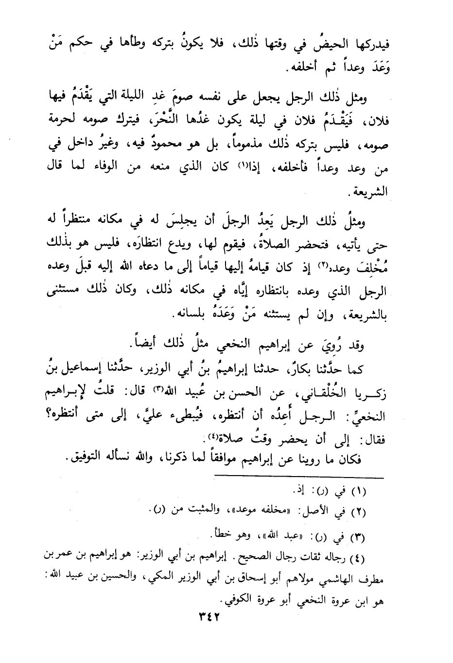 كَمَا حَدَّثَنَا بَكَّارٌ حَدَّثَنَا إبْرَاهِيمُ بْنُ أَبِي الْوَزِيرِ حَدَّثَنَا إسْمَاعِيلُ بْنُ زَكَرِيَّا الْخَلْقَانِيُّ عَنِ الْحَسَنِ بْنِ عُبَيْدِ اللهِ قَالَ: قُلْتُ لِإِبْرَاهِيمَ النَّخَعِيِّ: الرَّجُلُ أَعِدُهُ أَنْ أَنْتَظِرَهُ فَيُبْطِئَ عَلَيَّ إلَى مَتَى أَنْتَظِرُهُ؟ فَقَالَ: " إلَى أَنْ يَحْضُرَ وَقْتُ صَلَاةٍ " فَكَانَ مَا رَوَيْنَا عَنْ إبْرَاهِيمَ مُوَافِقًا لِمَا ذَكَرْنَا، وَاللهَ نَسْأَلُهُ التَّوْفِيقَ
