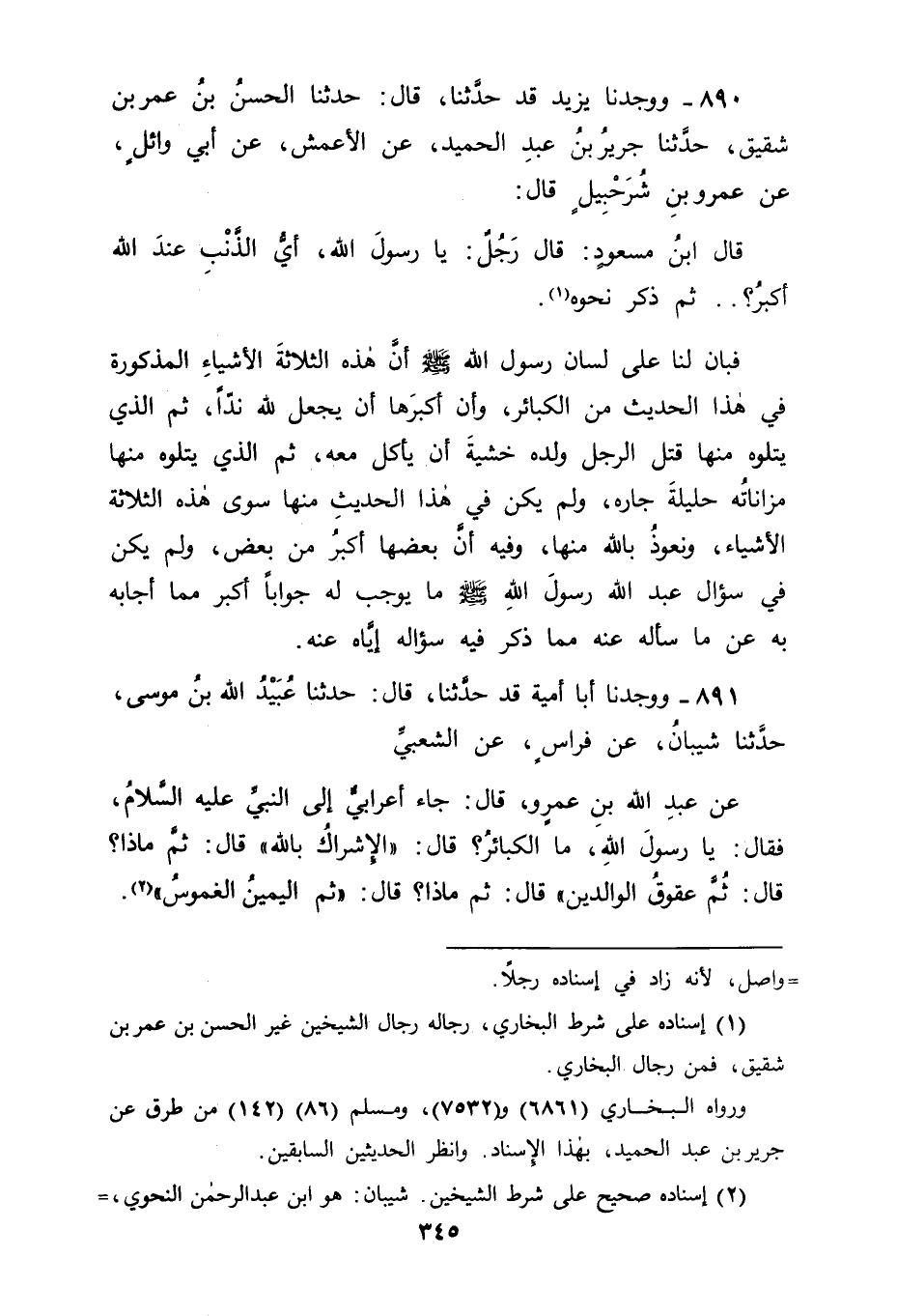 891 - وَوَجَدْنَا أَبَا أُمَيَّةَ قَدْ حَدَّثَنَا قَالَ: حَدَّثَنَا عُبَيْدُ اللهِ بْنُ مُوسَى، حَدَّثَنَا شَيْبَانُ، عَنْ فِرَاسٍ، عَنِ الشَّعْبِيِّ، عَنْ عَبْدِ اللهِ بْنِ عَمْرٍو قَالَ: جَاءَ أَعْرَابِيٌّ إلَى النَّبِيِّ عَلَيْهِ السَّلَامُ فَقَالَ: يَا رَسُولَ اللهِ، مَا الْكَبَائِرُ؟ قَالَ: " الْإِشْرَاكُ بِاللهِ " قَالَ: ثُمَّ مَاذَا؟ قَالَ: " ثُمَّ عُقُوقُ الْوَالِدَيْنِ " قَالَ: ثُمَّ مَاذَا؟ قَالَ: " ثُمَّ الْيَمِينُ الْغَمُوسُ " -[346]- قَالَ لَنَا أَبُو أُمَيَّةَ: فِي كِتَابِي فِي مَوْضِعٍ شَيْبَانُ، وَفِي مَوْضِعٍ آخَرَ سُفْيَانُ فِي إسْنَادِ هَذَا الْحَدِيثِ، فَكَانَ جَوَابُ رَسُولِ اللهِ صَلَّى اللَّهُ عَلَيْهِ وَسَلَّمَ سَائِلَهُ فِي هَذَا عَنَ الْكَبَائِرِ مَا هِيَ؟ أَنَّهَا الْإِشْرَاكُ بِاللهِ كَجَوَابِهِ لِابْنِ مَسْعُودٍ أَنَّ الشِّرْكَ أَكْبَرُ الْكَبَائِرِ، وَأَنَّ الَّذِي يَتْلُوهُ مِنْهَا عُقُوقُ الْوَالِدَيْنِ، وَأَنَّ الَّذِي يَتْلُوهُ مِنْهَا الْيَمِينُ الْغَمُوسُ فَاحْتَمَلَ أَنْ يَكُونَ ذَلِكَ عَلَى أَنَّ قَتْلَ الْوَلَدِ، وَعُقُوقَ الْوَالِدَيْنِ مِنْهَا فِي دَرَجَةٍ وَاحِدَةٍ، وَيَمِينَ الْغَمُوسِ مِنْهَا وَمُزَانَاةَ الرَّجُلِ حَلِيلَةَ جَارِهِ فِي دَرَجَةٍ، تَتْلُوهَا حَتَّى لَا يُخَالِفَ وَاحِدٌ مِنْ حَدِيثَيِ ابْنِ مَسْعُودٍ، وَعَبْدِ اللهِ بْنِ عَمْرٍو الْحَدِيثَ الْآخَرَ، وَيَكُونَ جَوَابُهُ الْأَوَّلُ مِنْ مُسَاءَلَةِ الْمَذْكُورِينَ فِيهِمَا كَمَا أَجَابَهُ بِهِ فِي الْحَدِيثِ الْمَذْكُورِ سُؤَالَهُ إيَّاهُ عَمَّا سَأَلَهُ عَنْهُ، غَيْرَ أَنَّا تَأَمَّلْنَا بَعْدَ ذَلِكَ هَذَيْنِ الْحَدِيثَيْنِ فَوَجَدْنَا فِي تَأْوِيلِهِمَا مَا هُوَ أَوْلَى بِهِمَا مِنْ هَذَا التَّأْوِيلِ الَّذِي ذَكَرْنَا، وَوَجَدْنَا جَائِزًا أَنْ يَكُونَ قَتْلُ الرَّجُلِ وَلَدَهُ خَشْيَةَ أَنْ يَأْكُلَ مَعَهُ، وَعُقُوقُهُ لِوَالِدَيْهِ فِي دَرَجَةٍ وَاحِدَةٍ تَالِيَةٍ لِلشِّرْكِ بِاللهِ تَعَالَى فَأَجَابَ ابْنَ مَسْعُودٍ بِأَحَدِهِمَا، وَأَجَابَ سَائِلَهُ فِي حَدِيثِ ابْنِ عَمْرٍو بِالْآخَرِ مِنْهُمَا، وَمِثْلُ هَذَا مِنَ الْكَلَامِ الصَّحِيحِ أَنْ يُقَالَ لِلرَّجُلِ: مَنْ أَشْجَعُ النَّاسِ؟ فَيَقُولُ: فُلَانٌ، ثُمَّ يُقَالُ لَهُ: ثُمَّ مَنْ؟ فَيَقُولُ: ثُمَّ فُلَانٌ لِرَجُلٍ آخَرَ، هُوَ كَذَلِكَ وَهُنَاكَ آخَرُ مِثْلُهُ قَدْ سَكَتَ عَنَ اسْمِهِ فَلَمْ يَذْكُرْهُ، فَيَكُونُ ذَلِكَ كَلَامًا صَحِيحًا -[347]- فَمِثْلُ ذَلِكَ جَوَابُ رَسُولِ اللهِ صَلَّى اللَّهُ عَلَيْهِ وَسَلَّمَ لِابْنِ مَسْعُودٍ وَجَوَابُهُ فِي حَدِيثِ ابْنِ عَمْرٍو وَفِي ذَلِكَ مَا قَدْ دَلَّ أَنْ لَا تَضَادَّ فِي وَاحِدٍ مِنْهُمَا لِلْآخَرِ، ثُمَّ كَانَ مَنْ فِي الْمَنْزِلَةِ الثَّالِثَةِ فِي حَدِيثِ ابْنِ مَسْعُودٍ، وَابْنِ عَمْرٍو كَمَنْ هُوَ فِي الْمَنْزِلَةِ الثَّانِيَةِ فِي حَدِيثِهِمَا جَمِيعًا عَلَى مَا ذَكَرْنَاهُ فِيهِمَا