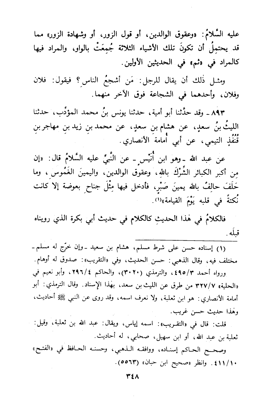 893 - وَقَدْ حَدَّثَنَا أَبُو أُمَيَّةَ، حَدَّثَنَا يُونُسُ بْنُ مُحَمَّدٍ الْمُؤَدِّبُ، حَدَّثَنَا اللَّيْثُ بْنُ سَعْدٍ، عَنْ هِشَامِ بْنِ سَعْدٍ، عَنْ مُحَمَّدِ بْنِ زَيْدِ بْنِ مُهَاجِرِ بْنِ قُنْفُذٍ التَّيْمِيِّ، عَنْ أَبِي أُمَامَةَ الْأَنْصَارِيِّ، عَنْ عَبْدِ اللهِ وَهُوَ ابْنُ أُنَيْسٍ، عَنِ النَّبِيِّ عَلَيْهِ السَّلَامُ قَالَ: " إنَّ مِنْ أَكْبَرِ الْكَبَائِرِ الشِّرْكَ بِاللهِ، وَعُقُوقَ الْوَالِدَيْنِ، وَالْيَمِينَ الْغَمُوسَ وَمَا حَلَفَ حَالِفٌ بِاللهِ يَمِينَ صَبْرٍ فَأَدْخَلَ فِيهَا مِثْلَ جَنَاحِ بَعُوضَةٍ إلَّا كَانَتْ نُكْتَةً فِي قَلْبِهِ يَوْمَ الْقِيَامَةِ " فَالْكَلَامُ فِي هَذَا الْحَدِيثِ كَالْكَلَامِ فِي حَدِيثِ أَبِي بَكْرَةَ الَّذِي رَوَيْنَاهُ قَبْلَهُ