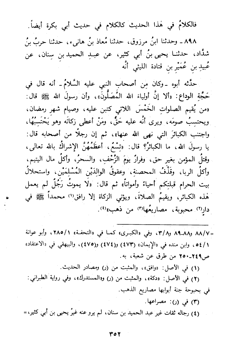 898 - وَحَدَّثَنَا ابْنُ مَرْزُوقٍ، حَدَّثَنَا مُعَاذُ بْنُ هَانِئٍ، حَدَّثَنَا حَرْبُ بْنُ شَدَّادٍ، حَدَّثَنَا يَحْيَى بْنُ أَبِي كَثِيرٍ، عَنْ عَبْدِ الْحَمِيدِ بْنِ سِنَانٍ، عَنْ عُبَيْدِ بْنِ عُمَيْرِ بْنِ قَتَادَةَ اللَّيْثِيِّ أَنَّهُ حَدَّثَهُ أَبُوهُ وَكَانَ مِنْ أَصْحَابِ النَّبِيِّ عَلَيْهِ السَّلَامُ أَنَّهُ قَالَ فِي حَجَّةِ الْوَدَاعِ: " أَلَا إنَّ أَوْلِيَاءَ اللهِ الْمُصَلُّونَ " وَأَنَّ رَسُولَ اللهِ صَلَّى اللَّهُ عَلَيْهِ وَسَلَّمَ قَالَ: " مَنْ يُقِيمُ الصَّلَوَاتِ الْخَمْسَ اللَّاتِي كُتِبْنَ عَلَيْهِ، وَصِيَامَ شَهْرِ رَمَضَانَ وَيَحْتَسِبُ صَوْمَهُ وَيَرَى أَنَّهُ عَلَيْهِ حَقٌّ، وَمَنْ أَعْطَى زَكَاتَهُ وَهُوَ يَحْتَسِبُهَا وَاجْتَنَبَ الْكَبَائِرَ الَّتِي نَهَى الله عَنْهَا " ثُمَّ إنَّ رَجُلًا مِنْ أَصْحَابِهِ قَالَ: يَا رَسُولَ اللهِ مَا الْكَبَائِرُ؟ قَالَ: " تِسْعٌ أَعْظَمُهُنَّ الْإِشْرَاكُ بِاللهِ تَعَالَى، وَقَتْلُ الْمُؤْمِنِ بِغَيْرِ حَقٍّ، وَفِرَارٌ يَوْمَ الزَّحْفِ، وَالسِّحْرُ، وَأَكْلُ مَالِ الْيَتِيمِ، وَأَكْلُ الرِّبَا، وَقَذْفُ الْمُحْصَنَةِ، وَعُقُوقُ الْوَالِدَيْنِ الْمُسْلِمَيْنِ وَاسْتِحْلَالُ الْبَيْتِ الْحَرَامِ قِبْلَتِكُمْ أَحْيَاءً وَأَمْوَاتًا "، ثُمَّ قَالَ: " لَا يَمُوتُ رَجُلٌ لَمْ يَعْمَلْ هَذِهِ الْكَبَائِرَ، وَيُقِيمُ الصَّلَاةَ وَيُؤْتِي الزَّكَاةَ إلَّا رَافَقَ مُحَمَّدًا صَلَّى اللَّهُ عَلَيْهِ وَسَلَّمَ فِي دَارٍ مَحْبُوبَةٍ مَصَارِيعُهَا مِنْ ذَهَبٍ " -[353]- فَكَانَ مَا فِي هَذَا الْحَدِيثِ لَيْسَ فِيهِ تَقْدِيمُ بَعْضِ التِّسْعَةِ الْأَشْيَاءِ الْمَذْكُورَةِ فِيهِ عَلَى بَعْضٍ غَيْرَ أَنَّ فِيهِ أَشْيَاءَ مِمَّا فِي حَدِيثَيِ ابْنِ مَسْعُودٍ، وَابْنِ عَمْرٍو فَمَوْضِعُهَا مِنَ الْكَبَائِرِ مَوْضِعُهَا مِنْهَا فِي ذَيْنِكَ الْحَدِيثَيْنِ