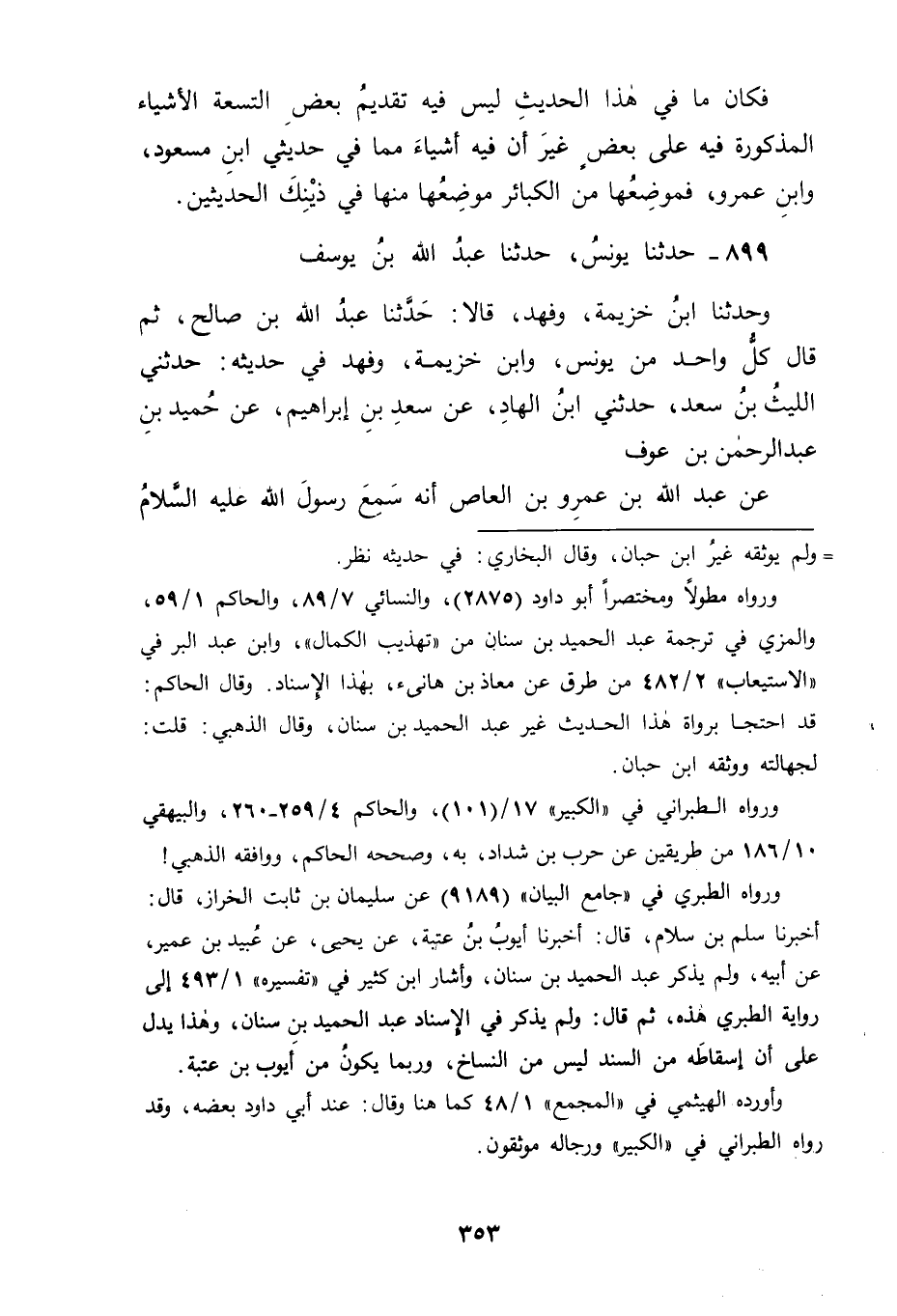 899 - حَدَّثَنَا يُونُسُ، حَدَّثَنَا عَبْدُ اللهِ بْنُ يُوسُفَ، وَحَدَّثَنَا ابْنُ خُزَيْمَةَ، وَفَهْدٌ قَالَا: حَدَّثَنَا عَبْدُ اللهِ بْنُ صَالِحٍ، ثُمَّ قَالَ كُلُّ وَاحِدٍ مِنْ يُونُسَ، وَابْنِ خُزَيْمَةَ، وَفَهْدٍ فِي حَدِيثِهِ: حَدَّثَنِي اللَّيْثُ بْنُ سَعْدٍ، حَدَّثَنِي ابْنُ الْهَادِ، عَنْ سَعْدِ بْنِ إبْرَاهِيمَ، عَنْ حُمَيْدِ بْنِ عَبْدِ الرَّحْمَنِ بْنِ عَوْفٍ، عَنْ عَبْدِ اللهِ بْنِ عَمْرِو بْنِ الْعَاصِ أَنَّهُ سَمِعَ رَسُولَ اللهِ عَلَيْهِ السَّلَامُ -[354]- يَقُولُ: " مِنَ الْكَبَائِرِ شَتْمُ الرَّجُلِ وَالِدَيْهِ " قَالُوا: يَا رَسُولَ اللهِ وَهَلْ يَشْتُمُ الرَّجُلُ وَالِدَيْهِ؟ , قَالَ: " نَعَمْ يَسُبُّ أَبَا الرَّجُلِ فَيَسُبُّ أَبَاهُ، وَيَسُبُّ أُمَّ الرَّجُلِ فَيَسُبُّ أُمَّهُ " مَوْضِعُ هَذَا الْحَدِيثِ هُوَ مَوْضِعُ الْعُقُوقِ مِنْ حَدِيثَيِ ابْنِ مَسْعُودٍ، وَابْنِ عَمْرٍو اللَّذَيْنِ ذَكَرْنَا فِي هَذَا الْبَابِ، فَهَذَا وَجْهُ مَا وَجَدْنَاهُ فِي هَذَا الْبَابِ عَنْ رَسُولِ اللهِ صَلَّى اللَّهُ عَلَيْهِ وَسَلَّمَ فِي عَدَدِ الْكَبَائِرِ. وَقَدْ وَجَدْنَا عَنِ ابْنِ مَسْعُودٍ، وَابْنِ عَبَّاسٍ فِيهَا مِمَّا نَعْلَمُ أَنَّهُمَا لَمْ يَقُولَاهُ رَأْيًا وَلَا اسْتِنْبَاطًا وَلَا اسْتِخْرَاجًا؛ لِأَنَّ مِثْلَهُ لَا يُقَالُ بِذَلِكَ وَأَنَّهُمَا لَمْ يَقُولَاهُ إلَّا تَوْقِيفًا مِنْ رَسُولِ اللهِ صَلَّى اللَّهُ عَلَيْهِ وَسَلَّمَ