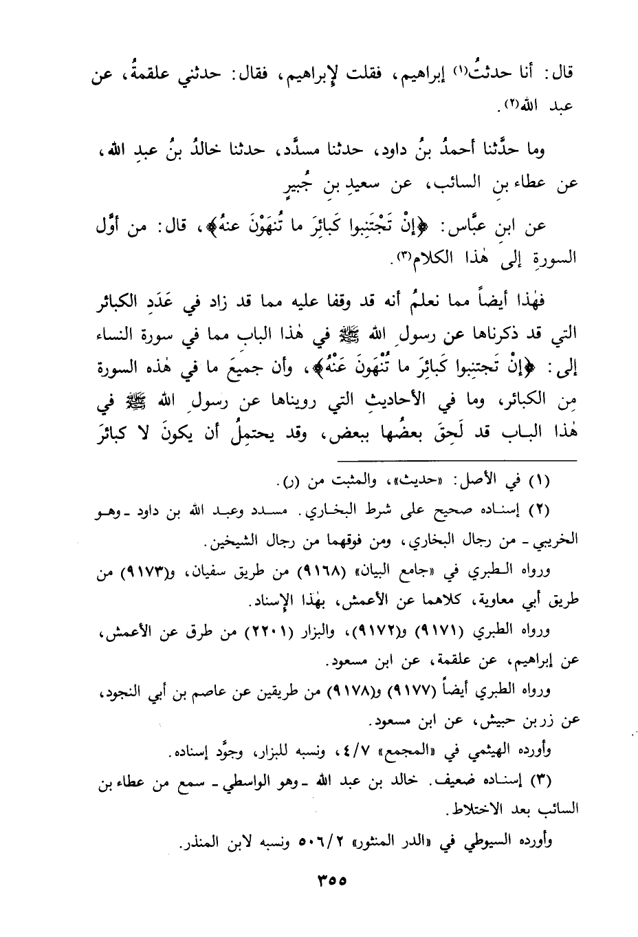 وَمَا حَدَّثَنَا أَحْمَدُ بْنُ دَاوُدَ، حَدَّثَنَا مُسَدَّدٌ، حَدَّثَنَا خَالِدُ بْنُ عَبْدِ اللهِ، عَنْ عَطَاءِ بْنِ السَّائِبِ، عَنْ سَعِيدِ بْنِ جُبَيْرٍ، عَنِ ابْنِ عَبَّاسٍ: {إنْ تَجْتَنِبُوا كَبَائِرَ مَا تُنْهَوْنَ عَنْهُ} [النساء: 31] قَالَ: " مِنْ أَوَّلِ السُّورَةِ إلَى هَذَا الْكَلَامِ " فَهَذَا أَيْضًا مِمَّا نَعْلَمُ أَنَّهُ قَدْ وَقَفَا عَلَيْهِ مِمَّا قَدْ زَادَ فِي عَدَدِ الْكَبَائِرِ الَّتِي قَدْ ذَكَرْنَاهَا عَنْ رَسُولِ اللهِ صَلَّى اللَّهُ عَلَيْهِ وَسَلَّمَ فِي هَذَا الْبَابِ مِمَّا فِي سُورَةِ النِّسَاءِ إلَى: {إنْ تَجْتَنِبُوا كَبَائِرَ مَا تُنْهَوْنَ عَنْهُ} [النساء: 31] وَأَنَّ جَمِيعَ مَا فِي هَذِهِ السُّورَةِ مِنَ الْكَبَائِرِ وَمَا فِي الْأَحَادِيثِ الَّتِي رُوِّيْنَاهَا عَنْ رَسُولِ اللهِ صَلَّى اللَّهُ عَلَيْهِ وَسَلَّمَ فِي هَذَا الْبَابِ قَدْ لَحِقَ بَعْضُهَا بِبَعْضٍ , وَقَدْ يُحْتَمَلُ أَنْ يَكُونَ لَا كَبَائِرَ -[356]- سِوَاهَا، وَقَدْ يُحْتَمَلُ أَنْ يَكُونَ هُنَاكَ كَبَائِرُ سِوَاهَا لَمْ يُطْلِعِ اللهُ عِبَادَهُ عَلَيْهَا؛ لِيَكُونُوا عَلَى حَذَرٍ مِنَ الْوُقُوعِ فِيهَا؛ وَلِيَكُونَ ذَلِكَ زَاجِرًا لَهُمْ عَنَ السَّيِّئَاتِ كُلِّهَا خَوْفًا أَنْ يَكُونَ مَا يَقَعُونَ فِيهِ مِنْهَا مِنْ تِلْكَ الْكَبَائِرِ، فَإِنْ قَالَ قَائِلٌ: وَكَيْفَ يَجُوزُ أَنْ يُمْنَعُوا مِنْ شَيْءٍ لَا يَتَبَيَّنُ لَهُمْ مَا هُوَ حَتَّى يَجْتَنِبُوهُ فَلَا يَقَعُونَ فِيهِ؟، قِيلَ لَهُ: هَذَا عِنْدَنَا، وَاللهُ أَعْلَمُ كَمِثْلِ مَا قَدْ رَوَيْنَاهُ عَنْ رَسُولِ اللهِ صَلَّى اللَّهُ عَلَيْهِ وَسَلَّمَ فِيمَا تَقَدَّمَ مِنَّا فِي كِتَابِنَا هَذَا مِنْ قَوْلِهِ: " الْحَلَالُ بَيِّنٌ، وَالْحَرَامُ بَيِّنٌ، وَبَيْنَ ذَلِكَ أُمُورٌ مُشْتَبِهَاتٌ الْوَاقِعُ فِيهَا كَالرَّاتِعِ إلَى جَانِبِ الْحِمَى يُوشِكُ أَنْ يُوَاقِعَهُ "، فَلَمْ يُبَيِّنْهَا اللهُ لَهُمْ عَلَى لِسَانِ رَسُولِهِ وَلَوْ شَاءَ لَأَبَانَهَا لَهُمْ، وَلَكِنَّهُ قَدْ يَجُوزُ أَنْ يَكُونَ تَرَكَ ذَلِكَ؛ لِيَجْتَنِبُوا الشُّبُهَاتِ كُلَّهَا، وَمِثْلُ ذَلِكَ مَا قَدْ رُوِيَ عَنْهُ فِي لَيْلَةِ الْقَدْرِ أَنَّهَا فِي رَمَضَانَ، ثُمَّ سَأَلُوا فِي أَيِّهَا مِنْهُ؟ فَأَعْلَمَهُمْ أَنَّهَا فِي الْعَشْرِ الْأَوَاخِرِ مِنْهُ وَلَمْ يُخْبِرْهُمْ أَيَّ لَيْلَةٍ هِيَ مِنْ لَيَالِيهِ، وَقَالَ لَهُمْ فِي حَدِيثِ أَبِي ذَرٍّ عَنْهُ فِي ذَلِكَ: " لَوْ شَاءَ أَنْ يُطْلِعَكُمْ عَلَيْهَا لَأَطْلَعَكُمْ عَلَيْهَا " وَسَنَذْكُرُ ذَلِكَ فِي بَابِهِ فِيمَا بَعْدُ مِنْ كِتَابِنَا هَذَا إنْ شَاءَ اللهُ، وَكَانَ تَرْكُ إعْلَامِهِمْ أَيَّ لَيْلَةٍ هِيَ مِنْ لَيَالِي الْعَشْرِ الْأَوَاخِرِ؛ لِيَعْمَلُوا فِيهَا كُلِّهَا عَمَلَ طَالِبِيهَا رَجَاءَ مُوَافَقَتِهَا، فَمِثْلُ ذَلِكَ إنْ كَانَتْ كَبَائِرُ مِنَ السَّيِّئَاتِ سِوَى مَا ذَكَرْنَا فِي هَذَا الْبَابِ فِي الْآثَارِ قَدْ يُحْتَمَلُ أَنْ يَكُونَ تَرَكَ تِبْيَانَهَا؛ لِيَكُونَ ذَلِكَ سَبَبًا لِتَرْكِهِمُ السَّيِّئَاتِ كُلِّهَا؛ لِأَنَّهَا مِنْهَا، وَبِاللهِ التَّوْفِيقُ