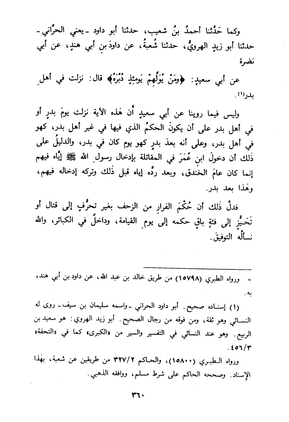 وَكَمَا حَدَّثَنَا أَحْمَدُ بْنُ شُعَيْبٍ حَدَّثَنَا أَبُو دَاوُدَ يَعْنِي الْحَرَّانِيَّ، حَدَّثَنَا أَبُو زَيْدٍ الْهَرَوِيُّ، حَدَّثَنَا شُعْبَةُ، عَنْ دَاوُدَ بْنِ أَبِي هِنْدَ، عَنْ أَبِي نَضْرَةَ، عَنْ أَبِي سَعِيدٍ: {وَمَنْ يُوَلِّهِمْ يَوْمَئِذٍ دُبُرَهُ} [الأنفال: 16] قَالَ: " نَزَلَتْ فِي أَهْلِ بَدْرٍ " وَلَيْسَ فِيمَا رَوَيْنَا عَنْ أَبِي سَعِيدٍ أَنَّ هَذِهِ الْآيَةَ نَزَلَتْ يَوْمَ بَدْرٍ أَوْ فِي أَهْلِ بَدْرٍ عَلَى أَنْ يَكُونَ الْحُكْمُ الَّذِي فِيهَا فِي غَيْرِ أَهْلِ بَدْرٍ كَهُوَ فِي أَهْلِ بَدْرٍ وَعَلَى أَنَّهُ بَعْدَ بَدْرٍ كَهُوَ يَوْمَ كَانَ فِي بَدْرٍ، وَالدَّلِيلُ عَلَى ذَلِكَ أَنَّ دُخُولَ ابْنِ عُمَرَ فِي الْمُقَاتِلَةِ بِإِدْخَالِ رَسُولِ اللهِ صَلَّى اللَّهُ عَلَيْهِ وَسَلَّمَ إيَّاهُ فِيهِمْ إنَّمَا كَانَ عَامَ الْخَنْدَقِ، وَبَعْدَ رَدِّهِ إيَّاهُ قَبْلَ ذَلِكَ وَتَرْكِهِ إدْخَالَهُ فِيهِمْ، وَهَذَا بَعْدَ بَدْرٍ فَدَلَّ ذَلِكَ أَنَّ حُكْمَ الْفِرَارِ مِنَ الزَّحْفِ بِغَيْرِ تَحَرُّفٍ إلَى قِتَالٍ، أَوْ تَحَيُّزٍ إلَى فِئَةٍ بَاقٍ حُكْمُهُ إلَى يَوْمِ الْقِيَامَةِ , وَدَاخِلٌ فِي الْكَبَائِرِ , وَاللهَ نَسْأَلُهُ التَّوْفِيقَ