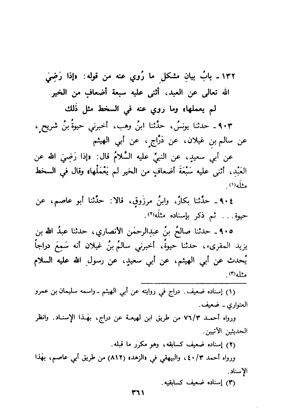 905 - حَدَّثَنَا صَالِحُ بْنُ عَبْدِ الرَّحْمَنِ الْأَنْصَارِيُّ، حَدَّثَنَا عَبْدُ اللهِ بْنُ يَزِيدَ الْمُقْرِئُ، حَدَّثَنَا حَيْوَةُ، أَخْبَرَنِي سَالِمُ بْنُ غَيْلَانَ أَنَّهُ سَمِعَ دَرَّاجًا، يُحَدِّثُ عَنْ أَبِي الْهَيْثَمِ، عَنْ أَبِي سَعِيدٍ، عَنْ رَسُولِ اللهِ عَلَيْهِ السَّلَامُ مِثْلَهُ -[362]- فَتَأَمَّلْنَا مَعْنَى هَذَا الْحَدِيثِ فَوَجَدْنَا مَا فِيهِ مِنْ ذِكْرِ اللهِ ثَنَاءَ اللهِ عَلَى عَبْدِهِ إذَا رَضِيَ اللهُ عَنْهُ سَبْعَةَ أَضْعَافٍ مِنَ الْخَيْرِ لَمْ يَعْمَلْهَا قَدْ يُحْتَمَلُ أَنْ يَكُونَ الْعَبْدُ إذَا رَضِيَ اللهُ عَنْهُ بِأَعْمَالِهِ الصَّالِحَةِ يُثْنِي عَلَيْهِ سَبْعَةَ أَضْعَافٍ مِنَ الْخَيْرِ لَمْ يَعْمَلْهَا مِمَّا قَدْ عَلِمَ تَعَالَى أَنَّهُ سَيَعْمَلُهَا فِي الْمُسْتَأْنَفِ وَإِنْ كَانَ قَدْ يَعْمَلُ فِي الْمُسْتَأْنَفِ مِنَ الْخَيْرِ أَضْعَافَهَا، مِمَّا لَا يُثْنِي بِهِ عَلَيْهِ؛ لِأَنَّهُ لَا يَسْتَوْجِبُ ذَلِكَ إذْ كَانَ لَمْ يَعْمَلْهُ، وَلَكِنَّ اللهَ تَعَالَى بِفَضْلِهِ عَلَيْهِ، وَمَحَبَّتِهِ إيَّاهُ لِلْخَيْرِ الَّذِي هُوَ عَلَيْهِ أَثْنَى عَلَيْهِ بِمَا شَاءَ أَنْ يُثْنِيَ بِهِ عَلَيْهِ مِمَّا، هُوَ عَامِلُهُ فِي الْمُسْتَأْنَفِ وَلَوْ شَاءَ اللهُ عَزَّ وَجَلَّ أَنْ لَا يُثْنِيَ عَلَيْهِ شَيْئًا، مِنْ ذَلِكَ إذْ كَانَ لَمْ يَعْمَلْهُ لَمَا أَثْنَى عَلَيْهِ شَيْئًا مِنْهُ، وَإِذَا كَانَ لَهُ عَزَّ وَجَلَّ أَنْ لَا يُثْنِيَ عَلَيْهِ بِشَيْءٍ مِمَّا ذَكَرْنَا كَانَ لَهُ أَنْ يُثْنِيَ عَلَيْهِ بِمَا شَاءَ مِنْهُ وَيَتْرُكَ الثَّنَاءَ عَلَيْهِ بِنَفْسِهِ، هَذَا فِيمَنْ رَضِيَ عَنْهُ، وَأَمَّا مَنْ سَخِطَ عَلَيْهِ فَقَدْ يَجُوزُ أَيْضًا أَنْ يَكُونَ يُثْنِي عَلَيْهِ بِسَبْعَةِ أَضْعَافٍ مِنَ الشَّرِّ لَمْ يَعْمَلْهَا مِمَّا هُوَ عَامِلُهَا فِي الْمُسْتَأْنَفِ وَلَعَلَّهُ أَنْ يَعْمَلَ فِي الْمُسْتَأْنَفِ مِنَ الشَّرِّ أَضْعَافَهَا، وَلَوْ شَاءَ اللهُ تَعَالَى أَنْ لَا يُثْنِيَ عَلَيْهِ بِذَلِكَ لَفَعَلَ إذْ كَانَ لَمْ يَعْمَلْهُ إلَى ذَلِكَ الْوَقْتِ فَأَثْنَى عَلَيْهِ بِمَا شَاءَ مِمَّا سَيَعْمَلُهُ وَتَرَكَ أَنْ لَا يُثْنِيَ عَلَيْهِ بِمَا سِوَى ذَلِكَ مِمَّا هُوَ كَمِثْلِ مَا أَثْنَى عَلَيْهِ بِهِ جَلَّ وَجَلَّ , وَاللهَ نَسْأَلُهُ التَّوْفِيقَ