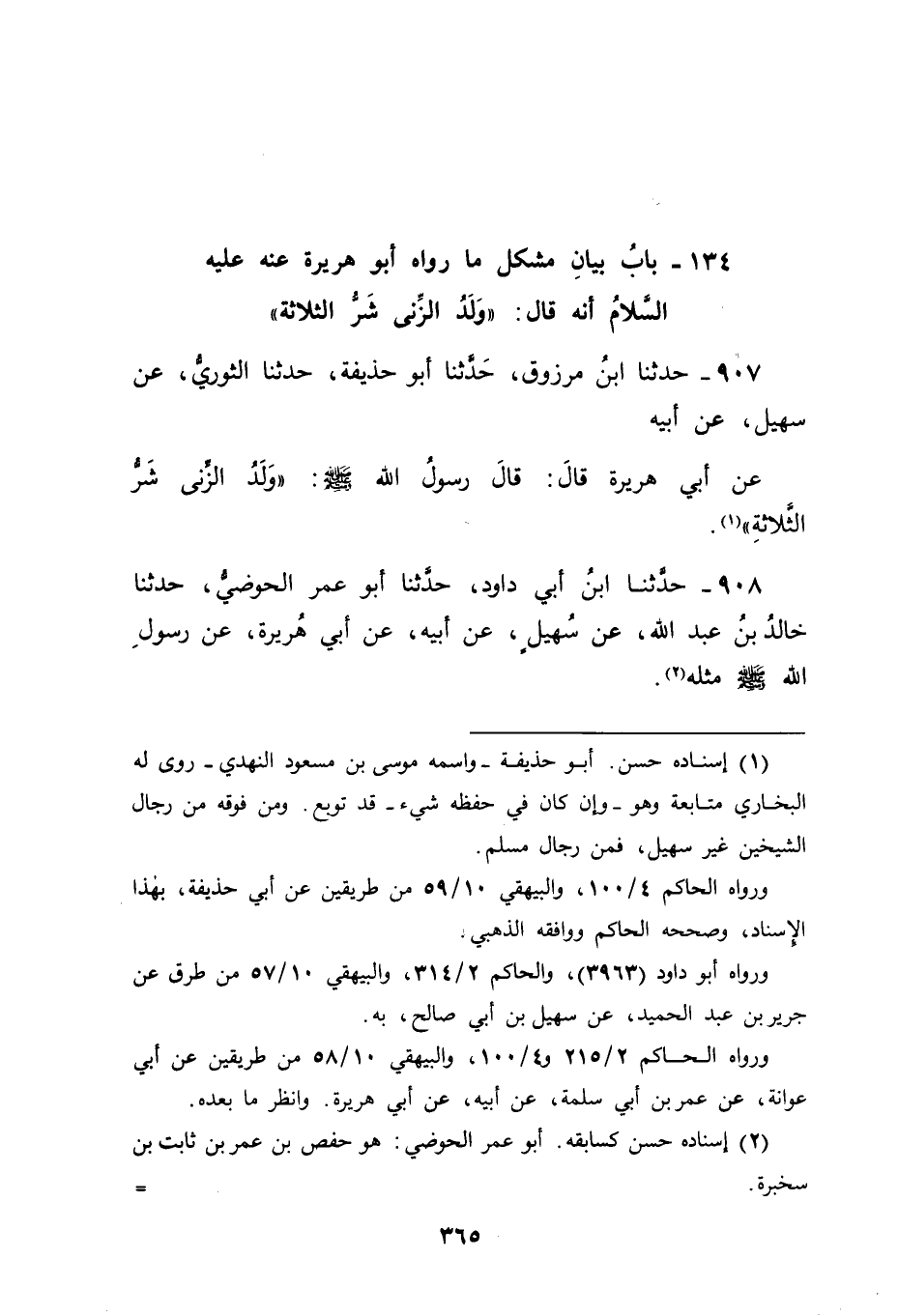 907 - حَدَّثَنَا ابْنُ مَرْزُوقٍ، حَدَّثَنَا أَبُو حُذَيْفَةَ، حَدَّثَنَا الثَّوْرِيُّ، عَنْ سُهَيْلٍ، عَنْ أَبِيهِ، عَنْ أَبِي هُرَيْرَةَ قَالَ: قَالَ رَسُولُ اللهِ صَلَّى اللَّهُ عَلَيْهِ وَسَلَّمَ: " وَلَدُ الزِّنَى شَرُّ الثَّلَاثَةِ "