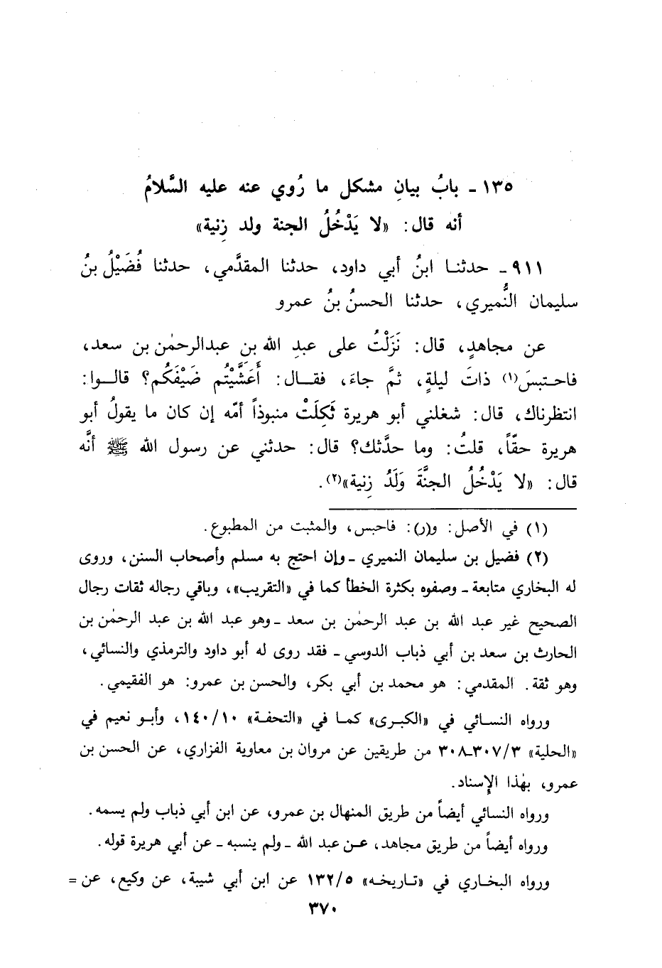 911 - حَدَّثَنَا ابْنُ أَبِي دَاوُدَ، حَدَّثَنَا الْمُقَدَّمِيُّ، حَدَّثَنَا فُضَيْلُ بْنُ سُلَيْمَانَ النُّمَيْرِيُّ، حَدَّثَنَا الْحَسَنُ بْنُ عَمْرٍو، عَنْ مُجَاهِدٍ قَالَ: نَزَلْتُ عَلَى عَبْدِ اللهِ بْنِ عَبْدِ الرَّحْمَنِ بْنِ سَعْدٍ، فَاحْتَبَسَ ذَاتَ لَيْلَةٍ، ثُمَّ جَاءَ فَقَالَ: أَعَشَّيْتُمْ ضَيْفَكُمْ؟، قَالُوا: انْتَظَرْنَاكَ، قَالَ: شَغَلَنِي أَبُو هُرَيْرَةَ ثَكِلَتْ مَنْبُوذًا أُمُّهُ إنْ كَانَ مَا يَقُولُ أَبُو هُرَيْرَةَ حَقًّا، قُلْتُ: وَمَا حَدَّثَكَ؟ قَالَ: حَدَّثَنِي عَنْ رَسُولِ اللهِ صَلَّى اللَّهُ عَلَيْهِ وَسَلَّمَ أَنَّهُ قَالَ: " لَا يَدْخُلُ الْجَنَّةَ وَلَدُ زِنْيَةٍ "
