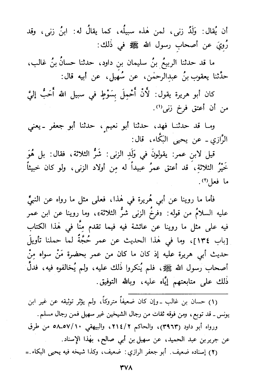 وَقَدْ رُوِيَ عَنْ أَصْحَابِ رَسُولِ اللهِ صَلَّى اللَّهُ عَلَيْهِ وَسَلَّمَ فِي ذَلِكَ مَا قَدْ حَدَّثَنَا الرَّبِيعُ بْنُ سُلَيْمَانَ بْنِ دَاوُدَ، حَدَّثَنَا حَسَّانُ بْنُ غَالِبٍ، حَدَّثَنَا يَعْقُوبُ بْنُ عَبْدِ الرَّحْمَنِ، عَنْ سُهَيْلٍ، عَنْ أَبِيهِ قَالَ: كَانَ أَبُو هُرَيْرَةَ يَقُولُ: " لَأَنْ أَحْمِلَ بِسَوْطٍ فِي سَبِيلِ اللهِ أَحَبُّ إلَيَّ مِنْ أَنْ أُعْتِقَ فَرْخَ زِنًى "