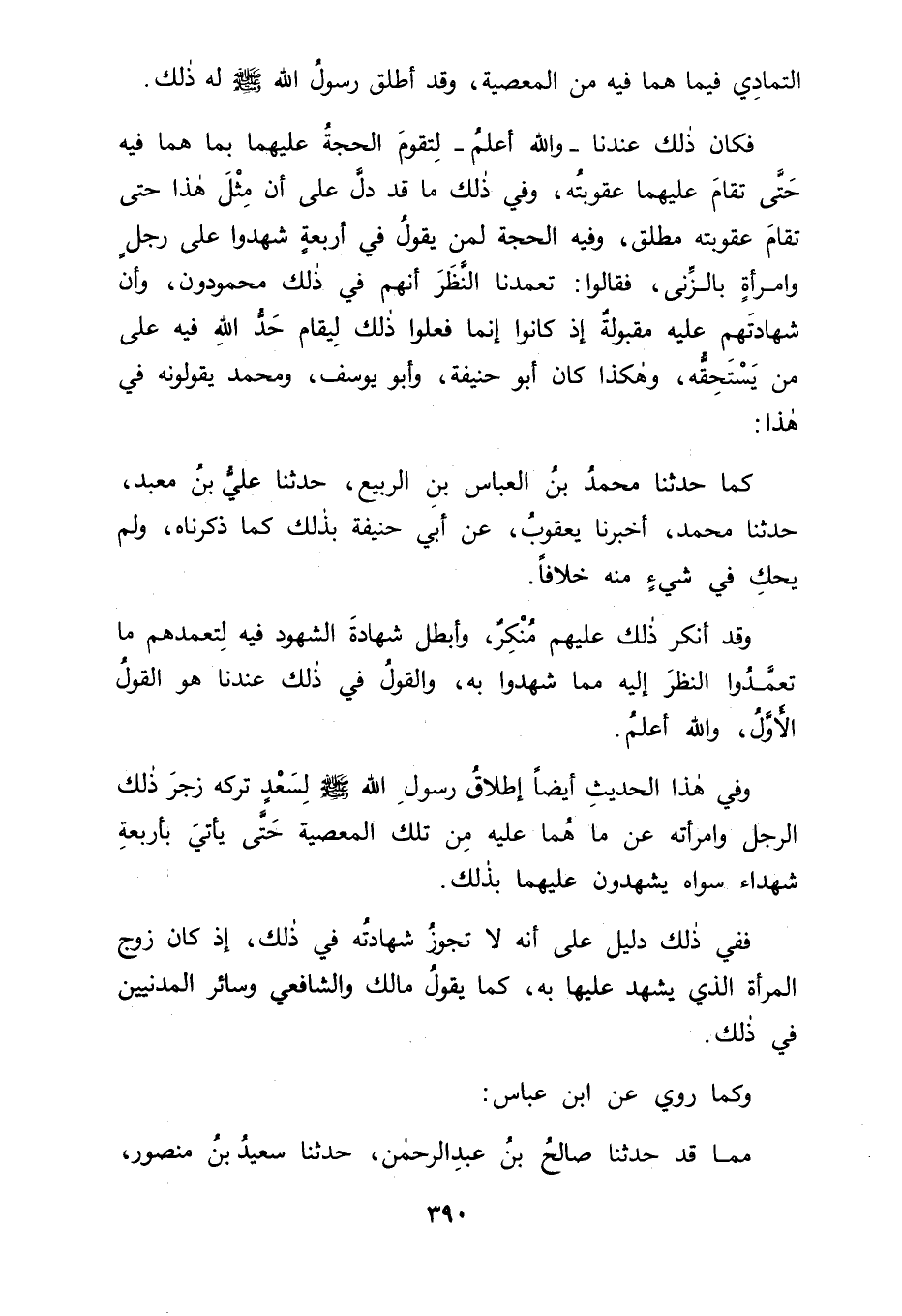 وَكَمَا رُوِيَ عَنِ ابْنِ عَبَّاسٍ مِمَّا قَدْ حَدَّثَنَا صَالِحُ بْنُ عَبْدِ الرَّحْمَنِ، حَدَّثَنَا سَعِيدُ بْنُ مَنْصُورٍ، -[391]- حَدَّثَنَا عَبْدُ الرَّحْمَنِ بْنُ أَبِي الزِّنَادِ، عَنْ أَبِيهِ، عَنْ عُبَيْدِ اللهِ وَهُوَ ابْنُ عَبْدِ اللهِ، عَنِ ابْنِ عَبَّاسٍ فِي أَرْبَعَةٍ شَهِدُوا عَلَى امْرَأَةٍ بِالزِّنَى أَحَدُهُمْ زَوْجٌ قَالَ: " يُلَاعِنُ الزَّوْجُ وَيُجْلَدُ الثَّلَاثَةُ " قَالَ أَبُو الزِّنَادِ وَذَلِكَ رَأْيُ أَهْلِ بَلَدِنَا
