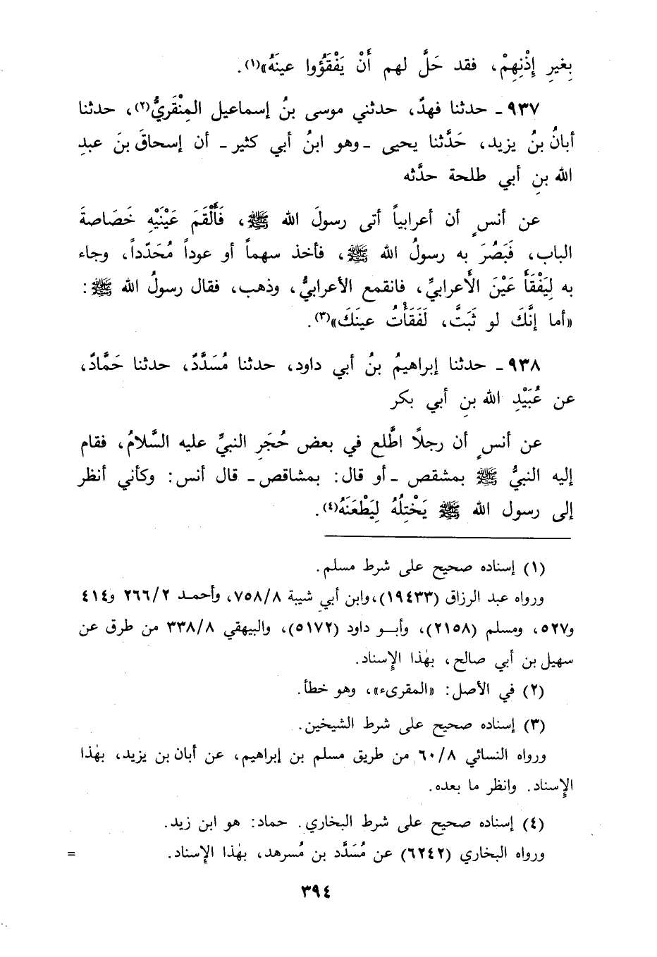 937 - حَدَّثَنَا فَهْدٌ، حَدَّثَنِي مُوسَى بْنُ إسْمَاعِيلَ الْمُنْقِرِيُّ، حَدَّثَنَا أَبَانُ بْنُ يَزِيدَ، حَدَّثَنَا يَحْيَى وَهُوَ ابْنُ أَبِي كَثِيرٍ، أَنَّ إِسْحَاقَ بْنَ عَبْدِ اللهِ بْنِ أَبِي طَلْحَةَ، حَدَّثَهُ عَنْ أَنَسٍ أَنَّ أَعْرَابِيًّا أَتَى رَسُولَ اللهِ صَلَّى اللَّهُ عَلَيْهِ وَسَلَّمَ فَأَلْقَمَ عَيْنَيْهِ خَصَاصَةَ الْبَابِ، فَبَصُرَ بِهِ رَسُولُ اللهِ صَلَّى اللَّهُ عَلَيْهِ وَسَلَّمَ فَأَخَذَ سَهْمًا أَوْ عُودًا مُحَدَّدًا وَجَاءَ بِهِ لِيَفْقَأَ عَيْنَ الْأَعْرَابِيِّ فَانْقَمَعَ الْأَعْرَابِيُّ، وَذَهَبَ فَقَالَ رَسُولُ اللهِ صَلَّى اللَّهُ عَلَيْهِ وَسَلَّمَ: " أَمَا إنَّكَ لَوْ ثَبَتَّ لَفَقَأْتُ عَيْنَكَ "