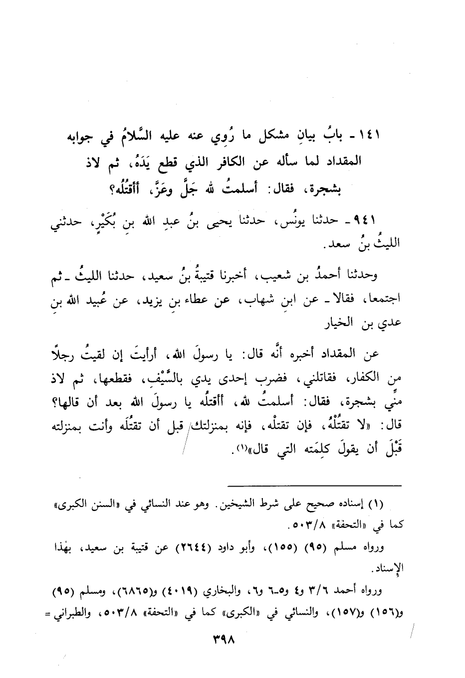 941 - حَدَّثَنَا يُونُسُ، حَدَّثَنَا يَحْيَى بْنُ عَبْدِ اللهِ بْنِ بُكَيْرٍ، حَدَّثَنِي اللَّيْثُ بْنُ سَعْدٍ، وَحَدَّثَنَا أَحْمَدُ بْنُ شُعَيْبٍ، أَخْبَرَنَا قُتَيْبَةُ بْنُ سَعِيدٍ، حَدَّثَنَا اللَّيْثُ، ثُمَّ اجْتَمَعَا فَقَالَا: عَنِ ابْنِ شِهَابٍ، عَنْ عَطَاءِ بْنِ يَزِيدَ، عَنْ عُبَيْدِ اللهِ بْنِ عَدِيِّ بْنِ الْخِيَارِ، عَنِ الْمِقْدَادِ، أَخْبَرَهُ أَنَّهُ قَالَ: يَا رَسُولَ اللهِ أَرَأَيْتَ إنْ لَقِيتُ رَجُلًا مِنَ الْكُفَّارِ فَقَاتَلَنِي فَضَرَبَ إحْدَى يَدَيَّ بِالسَّيْفِ فَقَطَعَهَا، ثُمَّ لَاذَ مِنِّي بِشَجَرَةٍ فَقَالَ: أَسْلَمْتُ لِلَّهِ، أَأَقْتُلُهُ يَا رَسُولَ اللهِ بَعْدَ أَنْ قَالَهَا؟ قَالَ: " لَا تَقْتُلْهُ فَإِنْ تَقْتُلْهُ فَإِنَّهُ بِمَنْزِلَتِكَ قَبْلَ أَنْ تَقْتُلَهُ، وَأَنْتَ بِمَنْزِلَتِهِ قَبْلَ أَنْ يَقُولَ كَلِمَتَهُ الَّتِي قَالَ " -[399]- فَكَانَ مَا فِي هَذَا الْحَدِيثِ منْ ِمَا يَجِبُ كَشْفُهُ وَتَأَمُّلُهُ وَطَلَبُ الْمَعْنَى الْمُرَادِ فِيهِ، فَكَانَ قَوْلُ رَسُولِ اللهِ صَلَّى اللَّهُ عَلَيْهِ وَسَلَّمَ جَوَابًا لِلْمِقْدَادِ لَمَّا سَأَلَهُ بَعْدَ قَطْعِ الْكَافِرِ يَدَهُ أَنْ لَا يَقْتُلَهُ وَأَعْلَمَهُ أَنَّهُ إنْ قَتَلَهُ كَانَ بِمَنْزِلَتِهِ قَبْلَ أَنْ يَقْتُلَهُ أَيْ إنَّهُ يَعُودُ بِإِسْلَامِهِ إلَى أَنْ يَكُونَ بِهِ مُسْلِمًا كَمَا كُنْتَ أَنْتَ مُسْلِمًا، وَأَنْ تَكُونَ أَنْتَ بِمَنْزِلَتِهِ قَبْلَ أَنْ يَقُولَ كَلِمَتَهُ الَّتِي قَالَ، يَعْنِي بِذَلِكَ كَلِمَتَهُ الَّتِي صَارَ بِهَا مُسْلِمًا أَيْ إِنَّكَ تَعُودُ قَاتِلًا لِمَنْ قَدْ صَارَ مُسْلِمًا , فَتَكُونُ بِذَلِكَ مِنْ أَهْلِ النَّارِ كَمَا كَانَ هُوَ قَبْلَ الْكَلِمَةِ الَّتِي قَالَهَا كَافِرًا مِنْ أَهْلِ النَّارِ، وَبِاللهِ التَّوْفِيقُ