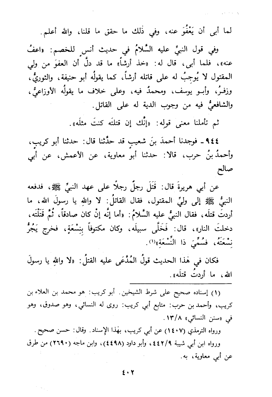 944 - فَوَجَدْنَا أَحْمَدَ بْنِ شُعَيْبٍ قَدْ حَدَّثَنَا قَالَ: حَدَّثَنَا أَبُو كُرَيْبٍ، وَأَحْمَدُ بْنُ حَرْبٍ قَالَا: حَدَّثَنَا أَبُو مُعَاوِيَةَ، عَنِ الْأَعْمَشِ، عَنْ أَبِي صَالِحٍ، عَنْ أَبِي هُرَيْرَةَ قَالَ: قَتَلَ رَجُلٌ رَجُلًا عَلَى عَهْدِ النَّبِيِّ صَلَّى اللَّهُ عَلَيْهِ وَسَلَّمَ، فَدَفَعَهُ النَّبِيُّ صَلَّى اللَّهُ عَلَيْهِ وَسَلَّمَ إلَى وَلِيِّ الْمَقْتُولِ، فَقَالَ الْقَاتِلُ: لَا وَاللهِ يَا رَسُولَ اللهِ مَا أَرَدْتُ قَتْلَهُ، فَقَالَ النَّبِيُّ عَلَيْهِ السَّلَامُ: " أَمَا إنَّهُ إنْ كَانَ صَادِقًا، ثُمَّ قَتَلْتَهُ دَخَلْتَ النَّارَ " قَالَ: فَخَلَّى سَبِيلَهُ، وَكَانَ مَكْتُوفًا بِنِسْعَةٍ فَخَرَجَ يَجُرُّ نِسْعَتَهُ، فَسُمِّيَ ذَا النِّسْعَةِ فَكَانَ فِي هَذَا الْحَدِيثِ قَوْلُ الْمُدَّعَى عَلَيْهِ الْقَتْلُ: لَا وَاللهِ يَا رَسُولَ اللهِ مَا أَرَدْتُ قَتْلَهُ، -[403]- فَكَانَ مَعْنَى ذَلِكَ عِنْدَنَا، وَاللهُ أَعْلَمُ أَنَّ الْبَيِّنَةَ الَّتِي كَانَتْ شَهِدَتْ عَلَيْهِ بِقَتْلِهِ أَخَا خَصْمِهِ شَهِدَتْ بِظَاهِرِ فِعْلِهِ الَّذِي كَانَ عِنْدَهَا أَنَّهُ عَمْدٌ لَهُ لَا شَكَّ عِنْدَهَا فِيهِ، وَكَانَ الْمُدَّعَى عَلَيْهِ أَعْلَمَ بِنَفْسِهِ، وَبِمَا كَانَ مِنْهُ فِي ذَلِكَ، فَادَّعَى بَاطِنًا كَانَ مِنْهُ فِي ذَلِكَ لَا يَجِبُ عَلَيْهِ مَعَهُ فِيمَا كَانَ مِنْهُ فِيهِ قَوَدٌ، فَقَالَ النَّبِيُّ عَلَيْهِ السَّلَامُ لِلْوَلِيِّ عِنْدَ ذَلِكَ: " أَمَا إنَّهُ إنْ كَانَ صَادِقًا، ثُمَّ قَتَلْتَهُ دَخَلْتَ النَّارَ ". فَعَقَلْنَا بِذَلِكَ مَعْنَى قَوْلِهِ فِي الْحَدِيثَيْنِ الْأَوَّلَيْنِ: " أَمَا إنَّكَ إنْ قَتَلْتَهُ كُنْتَ مِثْلَهُ ": أَيْ أَنَّهُ فِي الظَّاهِرِ عِنْدَنَا مِنْ أَهْلِ النَّارِ؛ لِثُبُوتِ الْحُجَّةِ عَلَيْهِ بِقَتْلِهِ مَنْ قَتَلَ، وَإِنْ قَتَلْتَهُ وَهُوَ فِي مَا قَالَ إنَّهُ صَادِقٌ كُنْتَ أَنْتَ أَيْضًا مِنْ أَهْلِ النَّارِ، وَاللهُ أَعْلَمُ. وَوَجَدْنَا حَدِيثَ وَائِلِ بْنِ حُجْرٍ مِنْ غَيْرِ الْجِهَةِ الَّتِي رَوَيْنَاهُ مِنْهَا قَدْ جَاءَ بِمَعْنًى يُخَالِفُ مَعْنَى حَدِيثِهِ الَّذِي حَدَّثَنَا بِهِ فِي صَدْرِ هَذَا الْبَابِ