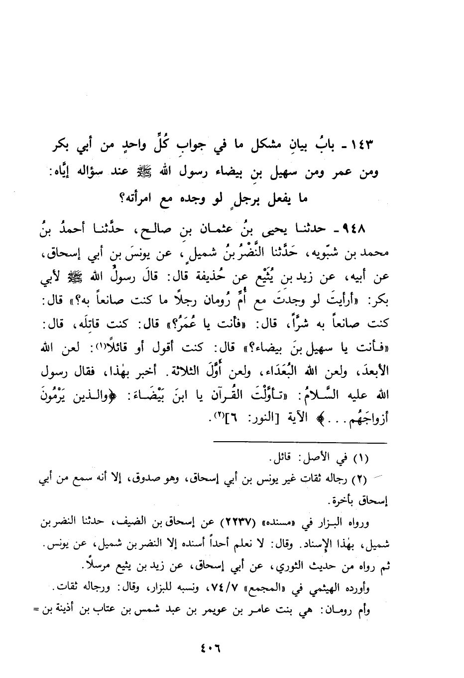 948 - حَدَّثَنَا يَحْيَى بْنُ عُثْمَانَ بْنِ صَالِحٍ، حَدَّثَنَا أَحْمَدُ بْنُ مُحَمَّدِ بْنِ شَبَّوَيْهِ، حَدَّثَنَا النَّضْرُ بْنُ شُمَيْلٍ، عَنْ يُونُسَ بْنِ أَبِي إِسْحَاقَ، عَنْ أَبِيهِ، عَنْ زَيْدِ بْنِ يُثَيْعٍ، عَنْ حُذَيْفَةَ قَالَ: قَالَ رَسُولُ اللهِ صَلَّى اللَّهُ عَلَيْهِ وَسَلَّمَ لِأَبِي بَكْرٍ: " أَرَأَيْتَ لَوْ وَجَدْتَ مَعَ أُمِّ رُومَانَ رَجُلًا مَا كُنْتَ صَانِعًا بِهِ؟ " قَالَ: كُنْتُ صَانِعًا بِهِ شَرًّا قَالَ: " فَأَنْتَ يَا عُمَرُ؟ " قَالَ: كُنْتُ قَاتِلَهُ، قَالَ: " فَأَنْتَ يَا سُهَيْلُ بْنَ بَيْضَاءَ؟ " قَالَ: كُنْتُ أَقُولُ أَوْ قَائِلًا: لَعَنَ اللهُ الْأَبْعَدَ وَلَعَنَ اللهُ الْبَعْدَاءَ وَلَعَنَ أَوَّلَ الثَّلَاثَةِ، أَخْبَرَ بِهَذَا، فَقَالَ رَسُولُ اللهِ عَلَيْهِ السَّلَامُ: " تَأَوَّلْتَ الْقُرْآنَ يَا ابْنَ بَيْضَاءَ: {وَالَّذِينَ يَرْمُونَ أَزْوَاجَهُمْ} [النور: 6] " الْآيَةَ -[407]- فَتَأَمَّلْنَا هَذَا الْحَدِيثَ فَوَجَدْنَا مَا فِيهِ مِنْ جَوَابِ أَبِي بَكْرٍ رَسُولَ اللهِ صَلَّى اللَّهُ عَلَيْهِ وَسَلَّمَ عَنْ سُؤَالِهِ إيَّاهُ الْمَذْكُورِ فِيهِ مَكْشُوفَ الْمَعْنَى، وَوَجَدْنَا مَا فِيهِ مِنْ جَوَابِ عُمَرَ إيَّاهُ عَمَّا سَأَلَهُ عَنْهُ فِيهِ مِمَّا يَحْتَاجُ إلَى تَأَمُّلِهِ وَالْوُقُوفِ عَلَى الْمَعْنَى فِيهِ فَتَأَمَّلْنَاهُ، فَوَجَدْنَا فِيهِ إخْبَارَ عُمَرَ رَسُولَ اللهِ صَلَّى اللَّهُ عَلَيْهِ وَسَلَّمَ أَنَّهُ كَانَ قَاتِلًا مَنْ وَجَدَهُ عَلَى تِلْكَ الْحَالِ، وَتَرْكَ رَسُولِ اللهِ صَلَّى اللَّهُ عَلَيْهِ وَسَلَّمَ الْإِنْكَارَ بِذَلِكَ عَلَيْهِ وَالزَّجْرَ لَهُ عَنْهُ، وَالْمَنْعَ لَهُ مِنْهُ، فَكَانَ فِي ذَلِكَ مَا قَدْ دَلَّ عَلَى إطْلَاقِهِ إيَّاهُ لَهُ عَلَى أَنَّ الشَّرِيعَةَ لَا تَمْنَعُهُ مِنْ ذَلِكَ، وَلَمْ نَعْلَمْ أَحَدًا مِنْ مَنْ دَارَتْ عَلَيْهِ الْفُتْيَا عَلَى هَذَا الْمَذْهَبِ، وَقَدْ يَجُوزُ أَنْ يَكُونَ لَهُ قَائِلُونَ مِنْهُمْ لَمْ نَقِفْ عَلَى قَوْلِهِمْ بِهِ؛ لِأَنَّ مِمَّا قَدْ يَجُوزُ أَنْ نَقِفَ عَلَيْهِ فِي الْمُسْتَأْنَفِ أَوْ مِمَّا قَدْ يَجُوزُ أَنْ لَا نَقِفَ عَلَيْهِ، فَإِنْ كَانَ ذَلِكَ مِمَّا لَا قَائِلَ لَهُ مِنْ أَهْلِ الْعِلْمِ كَانَ تَرْكُهُمُ الْقَوْلَ بِهِ أَوِ الْعُدُولُ عَنْهُ إلَى ضِدِّهِ دَلِيلًا عَلَى نَسْخِهِ؛ لِأَنَّا إنَّمَا نَقُولُ كَمَا يَقُولُ بِهِ لِأَخْذِنَا إيَّاهُ عَنْهُ وَامْتِثَالِ مَا كَانُوا عَلَيْهِ فِيهِ أَوْ فِي مِثْلِهِ مِنْ مَا يَدُلُّ عَلَى أَنْ يَجِبَ الْقَوْلُ بِهِ فِيهِ , وَلَمَّا كَانُوا مَأْمُونِينَ عَلَى مَا ذَكَرْنَا حُجَّةً فِيهِ كَانُوا كَذَلِكَ فِي تَرْكِهِمْ مِثْلَهُ وَالْعَمَلِ بِضِدِّهِ ,، -[408]- وَمِثْلُ ذَلِكَ مَا قَدْ قَالَهُ مُحَمَّدُ بْنُ سِيرِينَ فِي الْمُتْعَةِ فِي الْحَجِّ