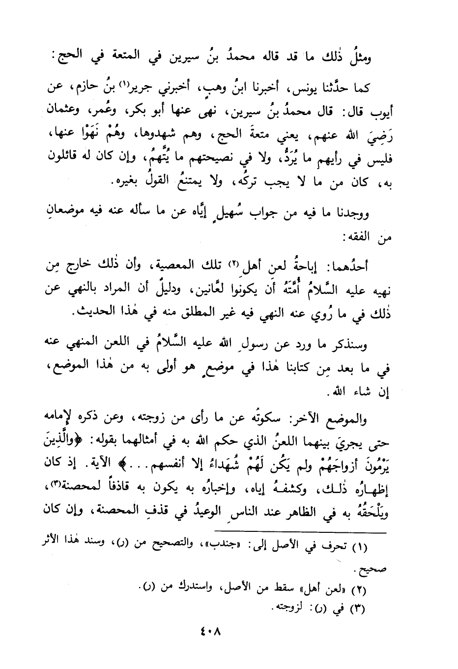 كَمَا حَدَّثَنَا يُونُسُ، أَخْبَرَنَا ابْنُ وَهْبٍ، أَخْبَرَنِي جَرِيرُ بْنُ حَازِمٍ، عَنْ أَيُّوبَ قَالَ: قَالَ مُحَمَّدُ بْنُ سِيرِينَ: " نَهَى عَنْهَا أَبُو بَكْرٍ، وَعُمَرُ، وَعُثْمَانُ رَضِيَ اللهُ عَنْهُمْ، يَعْنِي مُتْعَةَ الْحَجِّ , وَهُمْ شَهِدُوهَا وَهُمْ نَهَوْا عَنْهَا فَلَيْسَ فِي رَأْيِهِمْ مَا يُرَدُّ وَلَا فِي نَصِيحَتِهِمْ مَا يُتَّهَمُ وَإِنْ كَانَ لَهُ قَائِلُونَ بِهِ كَانَ مِنْ مَا لَا يَجِبُ تَرْكُهُ وَلَا يَمْتَنِعُ الْقَوْلُ بِغَيْرِهِ " وَوَجَدْنَا مَا فِيهِ مِنْ جَوَابِ سُهَيْلٍ إيَّاهُ عَنْ مَا سَأَلَهُ عَنْهُ فِيهِ مَوْضِعَانِ مِنَ الْفِقْهِ أَحَدُهُمَا إبَاحَةُ لَعْنِ أَهْلِ تِلْكَ الْمَعْصِيَةِ وَأَنَّ ذَلِكَ خَارِجٌ مِنْ نَهْيِهِ عَلَيْهِ السَّلَامُ أُمَّتَهُ أَنْ يَكُونُوا لَعَّانِينَ وَدَلِيلٌ أَنَّ الْمُرَادَ بِالنَّهْيِ عَنْ ذَلِكَ فِي مَا رُوِيَ عَنْهُ النَّهْيُ فِيهِ غَيْرُ الْمُطْلَقِ مِنْهُ فِي هَذَا الْحَدِيثِ، وَسَنَذْكُرُ مَا وَرَدَ عَنْ رَسُولِ اللهِ عَلَيْهِ السَّلَامُ فِي اللَّعْنِ الْمَنْهِيِّ عَنْهُ فِي مَا بَعْدُ مِنْ كِتَابِنَا هَذَا فِي مَوْضِعٍ هُوَ أَوْلَى بِهِ مِنْ هَذَا الْمَوْضِعِ إنْ شَاءَ اللهُ. وَالْمَوْضِعُ الْآخَرُ سُكُوتُهُ عَنْ مَا رَأَى مِنْ زَوْجَتِهِ، وَعَنْ ذِكْرِهِ لِإِمَامِهِ حَتَّى يُجْرِيَ بَيْنَهُمَا اللَّعْنَ الَّذِي حَكَمَ اللهُ بِهِ فِي أَمْثَالِهِمَا بِقَوْلِهِ: {وَالَّذِينَ يَرْمُونَ أَزْوَاجَهُمْ وَلَمْ يَكُنْ لَهُمْ شُهَدَاءُ إلَّا أَنْفُسُهُمْ} [النور: 6] الْآيَةَ، إذْ كَانَ إظْهَارُهُ ذَلِكَ وَكَشْفُهُ إيَّاهُ وَإِخْبَارُهُ بِهِ يَكُونُ بِهِ قَاذِفًا لِمُحْصَنَةٍ وَيَلْحَقُهُ بِهِ فِي الظَّاهِرِ عِنْدَ النَّاسِ الْوَعِيدُ فِي قَذْفِ الْمُحْصَنَةِ وَإِنْ كَانَ -[409]- فِي الْحَقِيقَةِ بِخِلَافِ ذَلِكَ وَلَكِنَّ اللهَ تَوَلَّى السَّرَائِرَ وَرَدَّ أَحْكَامَ النَّاسِ فِي الدُّنْيَا إلَى الظَّاهِرِ الَّذِي يُدْرِكُهُ بَعْضُهُمْ مِنْ بَعْضٍ، فَكَانَ فِي سُكُوتِهِ عَنْ ذَلِكَ مَحْمُودًا، وَكَانَ اللِّعَانُ الَّذِي يَكُونُ بَيْنَهُ وَبَيْنَ زَوْجَتِهِ لَوْ أَظْهَرَ ذَلِكَ وَطَالَبَتْهُ زَوْجَتُهُ بِالْوَاجِبِ لَهَا عَلَيْهِ فِيهِ لَا يُوصِلُهُ إلَّا إلَى فُرْقَتِهَا، وَهُوَ قَادِرٌ عَلَى فُرْقَتِهَا بِطَلَاقِهِ لَهَا مِنْ غَيْرِ شَيْءٍ يَلْحَقُهُ مِنْ ذَلِكَ فَحَمِدَهُ رَسُولُ اللهِ عَلَيْهِ السَّلَامُ وَأَعْلَمَهُ بِالْمَوْضِعِ الَّذِي أَخَذَ ذَلِكَ مِنْهُ وَأَنَّهُ الْآيَةُ الَّتِي تَلَاهَا عَلَيْهِ , وَاللهَ نَسْأَلُهُ التَّوْفِيقَ