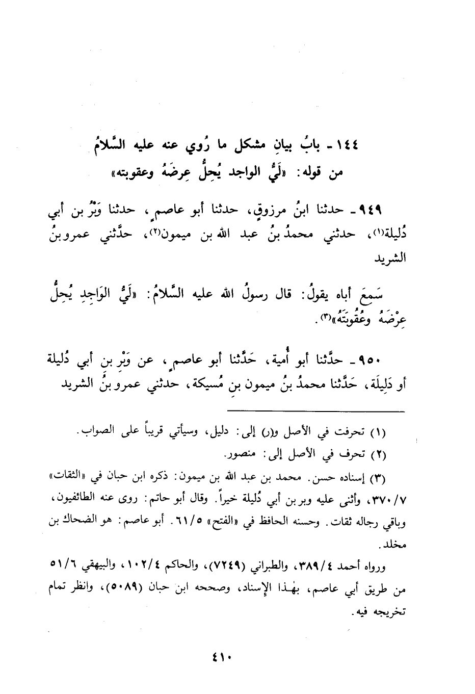 950 - حَدَّثَنَا أَبُو أُمَيَّةَ، حَدَّثَنَا أَبُو عَاصِمٍ، عَنْ وَبْرِ بْنِ أَبِي دُلَيْلَةَ أَوْ دُلَيْلَةَ حَدَّثَنَا مُحَمَّدُ بْنُ مَيْمُونِ بْنِ مُسَيْكَةَ، حَدَّثَنِي عَمْرُو بْنُ الشَّرِيدِ، -[411]- عَنْ أَبِيهِ قَالَ: قَالَ رَسُولُ اللهِ عَلَيْهِ السَّلَامُ: " لَيُّ الْوَاجِدِ يُحِلُّ عِرْضَهُ وَعُقُوبَتَهُ " فَسَأَلَ سَائِلٌ عَنَ الْمُرَادِ بِهَذَا الْحَدِيثِ، فَكَانَ جَوَابُنَا لَهُ فِي ذَلِكَ أَنَّ اللَّيَّ الْمُرَادَ فِيهِ هُوَ الْمَطْلُ وَمِنْهُ قَوْلُ ذِي الرُّمَّةِ: