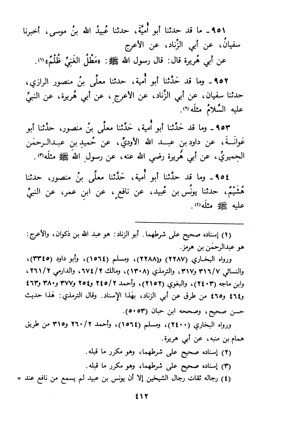 951 - مَا قَدْ حَدَّثَنَا أَبُو أُمَيَّةَ، حَدَّثَنَا عُبَيْدُ اللهِ بْنُ مُوسَى، أَخْبَرَنَا سُفْيَانُ، عَنْ أَبِي الزِّنَادِ، عَنِ الْأَعْرَجِ، عَنْ أَبِي هُرَيْرَةَ قَالَ: قَالَ رَسُولُ اللهِ صَلَّى اللَّهُ عَلَيْهِ وَسَلَّمَ: " مَطْلُ الْغَنِيِّ ظُلْمٌ "