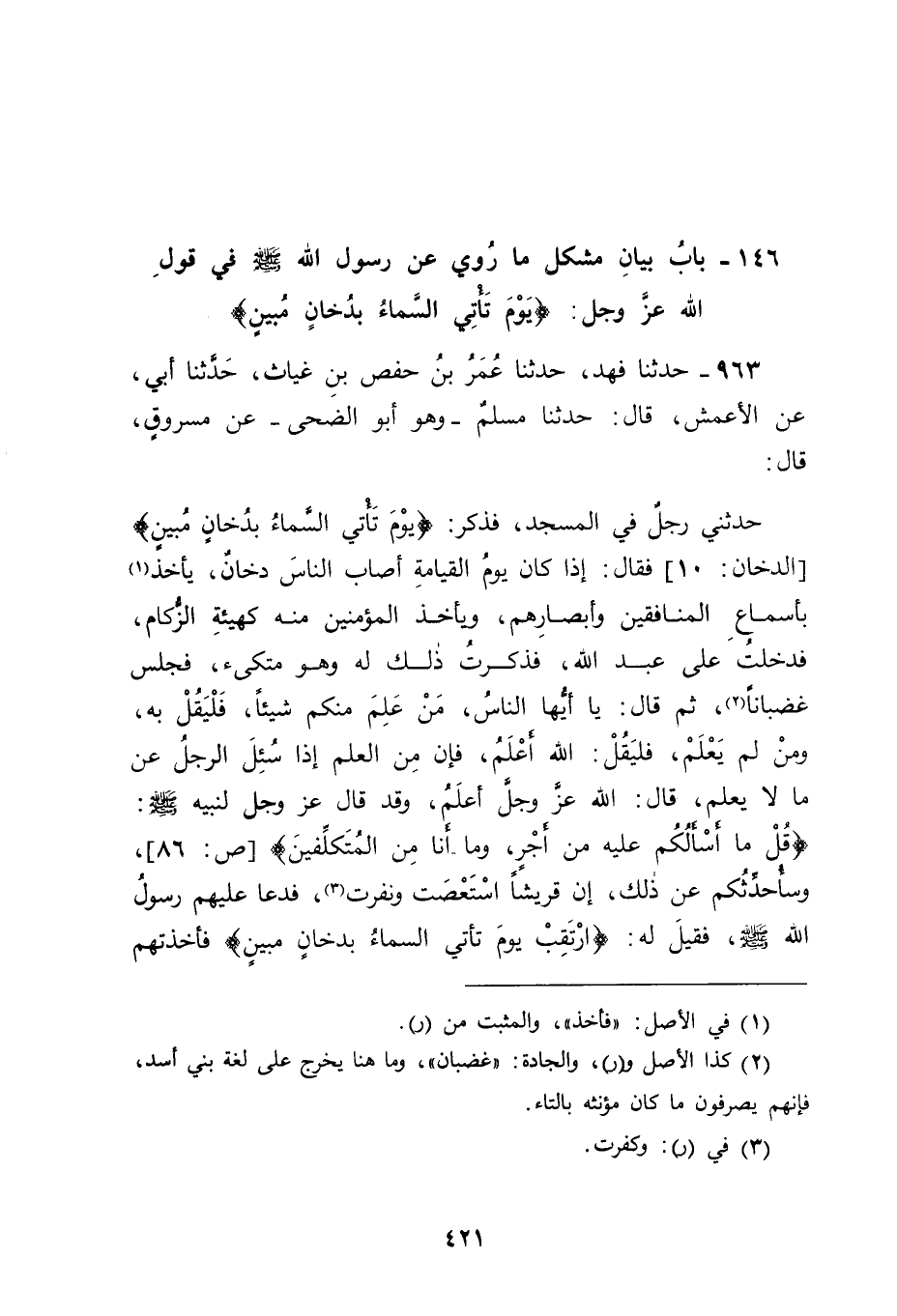 963 - حَدَّثَنَا فَهْدٌ، حَدَّثَنَا عُمَرُ بْنُ حَفْصِ بْنِ غِيَاثٍ، حَدَّثَنَا أَبِي، عَنِ الْأَعْمَشِ قَالَ: حَدَّثَنَا مُسْلِمٌ وَهُوَ أَبُو الضُّحَى عَنْ مَسْرُوقٍ قَالَ: حَدَّثَنِي رَجُلٌ فِي الْمَسْجِدِ، فَذَكَرَ: {يَوْمَ تَأْتِي السَّمَاءُ بِدُخَانٍ مُبِينٍ} [الدخان: 10] فَقَالَ: إذَا كَانَ يَوْمُ الْقِيَامَةِ أَصَابَ النَّاسَ دُخَانٌ يَأْخُذُ بِأَسْمَاعِ الْمُنَافِقِينَ وَأَبْصَارِهِمْ وَيَأْخُذُ الْمُؤْمِنِينَ مِنْهُ كَهَيْئَةِ الزُّكَامِ فَدَخَلْتُ عَلَى عَبْدِ اللهِ فَذَكَرْتُ ذَلِكَ لَهُ، وَهُوَ مُتَّكِئٌ فَجَلَسَ غَضْبَانًا ثُمَّ قَالَ: " يَا أَيُّهَا النَّاسُ مَنْ عَلِمَ مِنْكُمْ شَيْئًا فَلْيَقُلْ بِهِ وَمَنْ لَمْ يَعْلَمْ فَلْيَقُلِ: اللهُ أَعْلَمُ، فَإِنَّ مِنَ الْعِلْمِ إذَا سُئِلَ الرَّجُلُ عَنْ مَا لَا يَعْلَمُ، قَالَ: اللهُ عَزَّ وَجَلَّ أَعْلَمُ، وَقَدْ قَالَ عَزَّ وَجَلَّ لِنَبِيِّهِ صَلَّى اللَّهُ عَلَيْهِ وَسَلَّمَ: {قُلْ مَا أَسْأَلُكُمْ عَلَيْهِ مِنْ أَجْرٍ وَمَا أَنَا مِنَ الْمُتَكَلِّفِينَ} [ص: 86] ، وَسَأُحَدِّثُكُمْ عَنْ ذَلِكَ إنَّ قُرَيْشًا اسْتَعْصَتْ وَنَفَرَتْ فَدَعَا عَلَيْهِمْ رَسُولُ اللهِ صَلَّى اللَّهُ عَلَيْهِ وَسَلَّمَ فَقِيلَ لَهُ {ارْتَقِبْ يَوْمَ تَأْتِي السَّمَاءُ بِدُخَانٍ مُبِينٍ} فَأَخَذَتْهُمْ -[422]- سَنَةٌ عَضَّتْ كُلَّ شَيْءٍ حَتَّى أَكَلُوا الْمَيْتَةَ وَالْعِظَامَ وَحَتَّى كَانَ الرَّجُلُ يَرَى مَا بَيْنَهُ وَبَيْنَ السَّمَاءِ كَهَيْئَةِ الدُّخَانِ مِنَ الْجَهْدِ فَقَالُوا: {رَبَّنَا اكْشِفْ عَنَّا الْعَذَابَ إنَّا مُؤْمِنُونَ} [الدخان: 12] ثُمَّ قَرَأَ: {إنَّا كَاشِفُو الْعَذَابِ قَلِيلًا إنَّكُمْ عَائِدُونَ} [الدخان: 15] فَكُشِفَ عَنْهُمْ فَعَادُوا فِي كُفْرِهِمْ: {يَوْمَ نَبْطِشُ الْبَطْشَةَ الْكُبْرَى إنَّا مُنْتَقِمُونَ} [الدخان: 16] ، فَعَادُوا فِي كُفْرِهِمْ فَأَخَذَهُمُ اللهُ فِي يَوْمِ بَدْرٍ وَلَوْ كَانَ يَوْمَ الْقِيَامَةِ لَمْ يُكْشَفْ عَنْهُمْ "