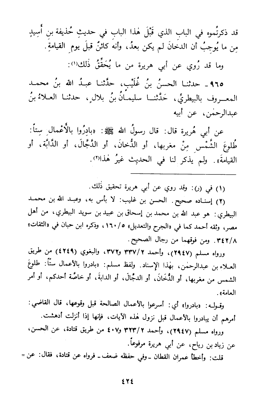 965 - حَدَّثَنَا الْحَسَنُ بْنُ غُلَيْبٍ، حَدَّثَنَا عَبْدُ اللهِ بْنُ مُحَمَّدٍ الْمَعْرُوفُ بِالْبَيْطَرِيِّ، حَدَّثَنَا سُلَيْمَانُ بْنُ بِلَالٍ، حَدَّثَنَا الْعَلَاءُ بْنُ عَبْدِ الرَّحْمَنِ، عَنْ أَبِيهِ، عَنْ أَبِي هُرَيْرَةَ قَالَ: قَالَ رَسُولُ اللهِ صَلَّى اللَّهُ عَلَيْهِ وَسَلَّمَ: " بَادِرُوا بِالْأَعْمَالِ سِتًّا طُلُوعَ الشَّمْسِ مِنْ مَغْرِبِهَا، أَوِ الدُّخَانَ، أَوِ الدَّجَّالَ، أَوِ الدَّابَّةَ، أَوِ الْقِيَامَةَ " وَلَمْ يَذْكُرْ لَنَا فِي الْحَدِيثِ غَيْرَ هَذَا -[425]- فَكَانَ جَوَابُنَا لَهُ بِتَوْفِيقِ اللهِ عَزَّ وَجَلَّ وَعَوْنِهِ أَنَّ الدُّخَانَ الْمَذْكُورَ فِي حَدِيثِ ابْنِ مَسْعُودٍ غَيْرُ الدُّخَانِ الْمَذْكُورِ فِي حَدِيثَيِ حُذَيْفَةَ، وَأَبِي هُرَيْرَةَ وَذَلِكَ أَنَّ اللهَ تَعَالَى قَالَ فِي كِتَابِهِ فِي سُورَةِ الدُّخَانِ: {بَلْ هُمْ فِي شَكٍّ يَلْعَبُونَ} [الدخان: 9] ، ثُمَّ أَتْبَعَ ذَلِكَ قَوْلَهُ تَعَالَى: {فَارْتَقِبْ يَوْمَ تَأْتِي السَّمَاءُ بِدُخَانٍ مُبِينٍ} [الدخان: 10] أَيْ عُقُوبَةٍ لَهُمْ لِمَا هُمْ عَلَيْهِ مِنَ الشَّكِّ وَاللَّعِبِ، وَمُحَالٌ أَنْ تَكُونَ هَاتَانِ الْعُقُوبَتَانِ لِغَيْرِهِمْ، أَوْ يُؤْتَى بِهِمَا بَعْدَ خُرُوجِهِمْ مِنَ الدُّنْيَا وَسَلَامَتِهِمْ مِنْ ذَلِكَ الدُّخَانِ. فَقَالَ هَذَا الْقَائِلُ: قَدْ قَالَ اللهُ عَزَّ وَجَلَّ فِي هَذِهِ السُّورَةِ: {فَارْتَقِبْ يَوْمَ تَأْتِي السَّمَاءُ بِدُخَانٍ مُبِينٍ} [الدخان: 10] وَالَّذِي ذَكَرَهُ ابْنُ مَسْعُودٍ فِي حَدِيثِهِ لَيْسَ هُوَ دُخَانًا حَقِيقِيًّا، وَإِنَّمَا هُوَ شَيْءٌ كَانَتْ قُرَيْشٌ تَتَوَهَّمُهُ أَنَّهُ دُخَانٌ وَلَيْسَ بِدُخَانٍ، وَفِيهَا أَنَّ إتْيَانَهُ يَكُونُ مِنَ السَّمَاءِ، وَلَيْسَ فِي حَدِيثِ ابْنِ مَسْعُودٍ ذَلِكَ، وَإِنَّمَا الَّذِي فِيهِ أَنَّهُمْ كَانُوا يَرَوْنَ مِنَ الْجُوعِ الَّذِي حَلَّ بِهِمْ وَأَصَابَهُمْ فِي الْأَرْضِ أَنَّ بَيْنَهُمْ وَبَيْنَ السَّمَاءِ دُخَانًا فَكَانَ جَوَابُنَا لَهُ فِي ذَلِكَ بِتَوْفِيقِ اللهِ عَزَّ وَجَلَّ وَعَوْنِهِ أَنَّ الْمَذْكُورَ فِي حَدِيثِ ابْنِ مَسْعُودٍ سُمِّيَ دُخَانًا عَلَى الْمَجَازِ؛ لِتَوَهُّمِ قُرَيْشٍ أَنَّهُ دُخَانٌ فِي الْحَقِيقَةِ مِنَ الْجَهْدِ الَّذِي بِهَا، وَإِنْ لَمْ يَكُنْ فِي الْحَقِيقَةِ كَذَلِكَ كَمِثْلِ مَا رُوِيَ عَنِ النَّبِيِّ صَلَّى اللَّهُ عَلَيْهِ وَسَلَّمَ فِي قِصَّةِ الدَّجَّالِ " أَنَّهُ يَأْمُرُ السَّمَاءَ فَتُمْطِرُ، وَيَأْمُرُ الْأَرْضَ فَتُنْبِتُ " فِي حَدِيثِ النَّوَّاسِ بْنِ سَمْعَانَ مُطْلَقًا هَكَذَا، وَفِي حَدِيثِ جَابِرِ بْنِ عَبْدِ اللهِ عَنِ النَّبِيِّ صَلَّى اللَّهُ عَلَيْهِ وَسَلَّمَ كَذَلِكَ وَفِيهِ " -[426]- وَمَعَهُ نَهْرَانِ أَنَا أَعْلَمُ بِهِمَا مِنْهُ " وَفِيهِ: " وَيَأْمُرُ السَّمَاءَ فَتُمْطِرُ فِيمَا يَرَى النَّاسُ " فَدَلَّ ذَلِكَ أَنَّ الْمَذْكُورَ فِي حَدِيثِ النَّوَّاسِ إنَّمَا هُوَ مِنْ سِحْرِ الدَّجَّالِ لَا مِنْ حَقِيقَةٍ لَهُ وَسَنَذْكُرُ هَذَا فِيمَا بَعْدُ مِنْ كِتَابِنَا هَذَا فِيمَا رُوِيَ فِي الدَّجَّالِ عَنْ رَسُولِ اللهِ صَلَّى اللَّهُ عَلَيْهِ وَسَلَّمَ إنْ شَاءَ اللهُ فَيَحْتَمِلُ ذَلِكَ مَا كَانَتْ قُرَيْشٌ تَرَاهُ مِمَّا تَرَاهُ دُخَانًا جَازَ أَنْ يُقَالَ إنَّهُ دُخَانٌ عَلَى الْمَجَازِ، وَإِنْ كَانَ فِي الْحَقِيقَةِ بِخِلَافِ ذَلِكَ، وَأَمَّا قَوْلُ اللهِ عَزَّ وَجَلَّ: {يَوْمَ تَأْتِي السَّمَاءُ بِدُخَانٍ مُبِينٍ} [الدخان: 10] فَهُوَ مَا رُوِيَ فِيهِ عَنِ ابْنِ مَسْعُودٍ مِمَّا قَدْ ذُكِرَ فِي أَحَادِيثِهِ الَّتِي رَوَيْنَاهَا عَنْهُ، وَوُجِّهَ بِأَنَّ الْإِضَافَةَ إلَى السَّمَاءِ إنَّمَا كَانَتْ وَاللهُ أَعْلَمُ لِأَنَّ ا