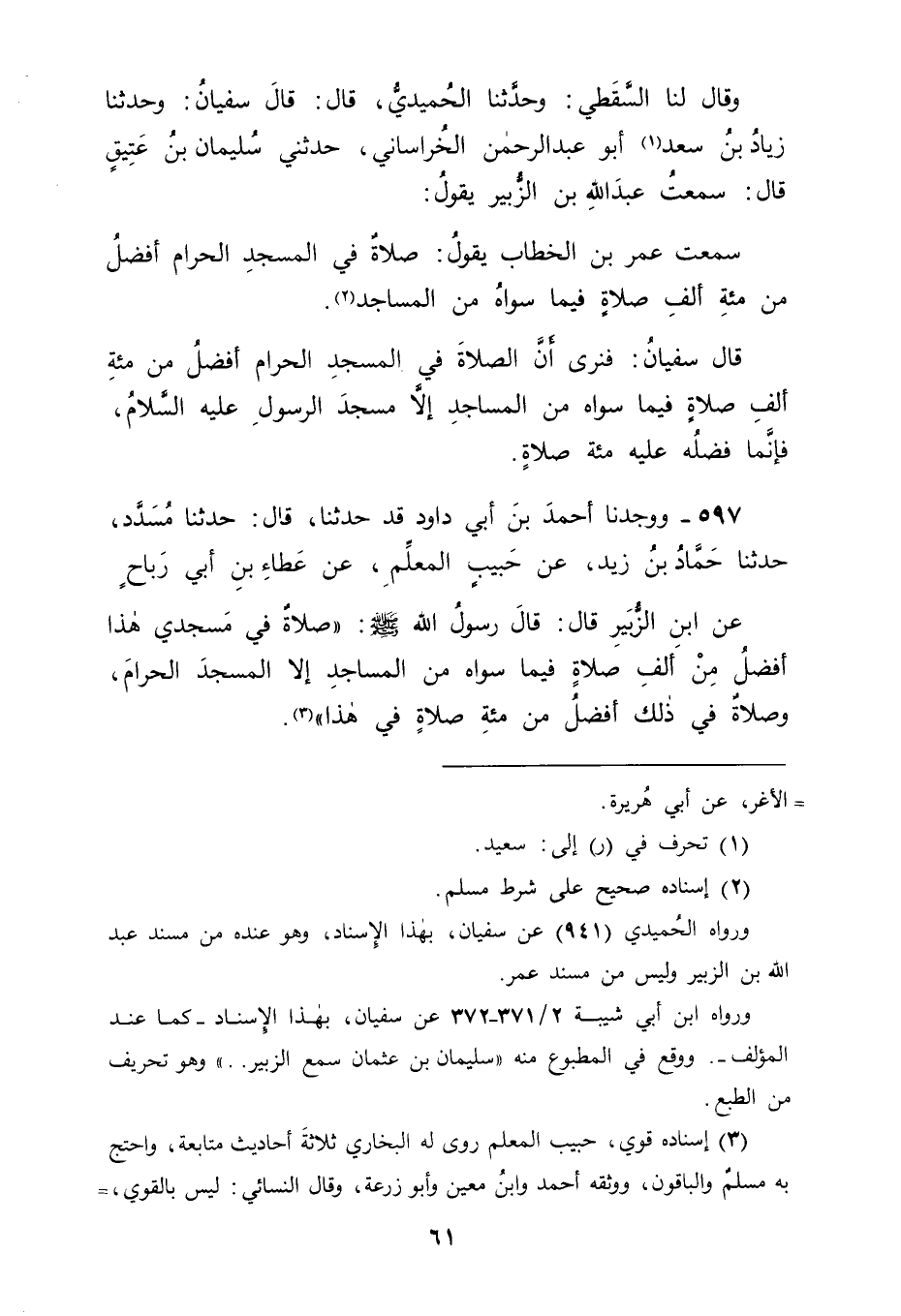 وَقَالَ لَنَا السَّقَطِيُّ: وَحَدَّثَنَا الْحُمَيْدِيُّ قَالَ: قَالَ سُفْيَانُ: وَحَدَّثَنَا زِيَادُ بْنُ سَعْدٍ أَبُو عَبْدِ الرَّحْمَنِ الْخُرَاسَانِيُّ حَدَّثَنِي سُلَيْمَانُ بْنُ عَتِيقٍ قَالَ: سَمِعْتُ عَبْدَ اللهِ بْنَ الزُّبَيْرِ يَقُولُ: سَمِعْتُ عُمَرَ بْنَ الْخَطَّابِ يَقُولُ: " صَلَاةٌ فِي الْمَسْجِدِ الْحَرَامِ أَفْضَلُ مِنْ مِائَةِ أَلْفِ صَلَاةٍ فِيمَا سِوَاهُ مِنَ الْمَسَاجِدِ " قَالَ سُفْيَانُ فَنَرَى أَنَّ الصَّلَاةَ فِي الْمَسْجِدِ الْحَرَامِ أَفْضَلُ مِنْ مِائَةِ أَلْفِ صَلَاةٍ فِيمَا سِوَاهُ مِنَ الْمَسَاجِدِ إلَّا مَسْجِدَ الرَّسُولِ عَلَيْهِ السَّلَامُ، فَإِنَّمَا فَضْلُهُ عَلَيْهِ مِائَةُ صَلَاةٍ
