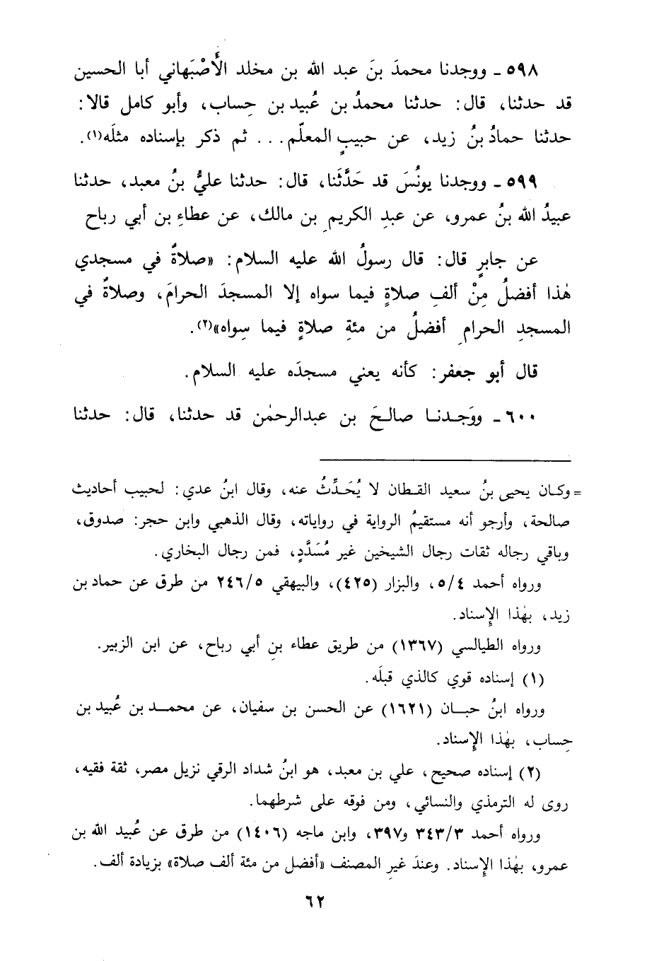 600 - وَوَجَدْنَا صَالِحَ بْنَ عَبْدِ الرَّحْمَنِ قَدْ حَدَّثَنَا قَالَ: حَدَّثَنَا -[63]- يُوسُفُ بْنُ عَدِيٍّ، حَدَّثَنَا أَبُو الْأَحْوَصِ، عَنْ حُصَيْنٍ، عَنْ مُحَمَّدِ بْنِ طَلْحَةَ، عَنْ جُبَيْرِ بْنِ مُطْعِمٍ قَالَ: قَالَ رَسُولُ اللهِ عَلَيْهِ السَّلَامُ: " صَلَاةٌ فِي مَسْجِدِي هَذَا أَفْضَلُ مِنْ أَلْفِ صَلَاةٍ فِي غَيْرِهِ إلَّا الْمَسْجِدَ الْحَرَامَ "