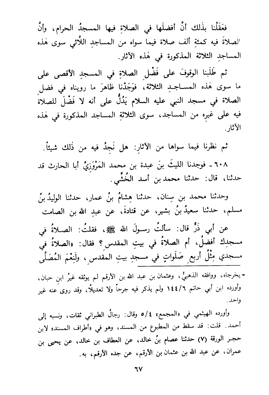 608 - فَوَجَدْنَا اللَّيْثَ بْنَ عَبْدَةَ بْنِ مُحَمَّدٍ الْمَرْوَزِيَّ أَبَا الْحَارِثِ قَدْ حَدَّثَنَا قَالَ: حَدَّثَنَا مُحَمَّدُ بْنُ أَسَدٍ الْخُشِّيُّ، وَثَنَا مُحَمَّدُ بْنُ سِنَانٍ، حَدَّثَنَا هِشَامُ بْنُ عَمَّارٍ، حَدَّثَنَا الْوَلِيدُ بْنُ مُسْلِمٍ، حَدَّثَنَا سَعِيدُ بْنُ بَشِيرٍ، عَنْ قَتَادَةَ، عَنْ عَبْدِ اللهِ بْنِ الصَّامِتِ، عَنْ أَبِي ذَرٍّ قَالَ: سَأَلْتُ رَسُولَ اللهِ صَلَّى اللَّهُ عَلَيْهِ وَسَلَّمَ فَقُلْتُ: الصَّلَاةُ فِي مَسْجِدِكَ أَفْضَلُ أَمِ الصَّلَاةُ فِي بَيْتِ الْمَقْدِسِ؟ فَقَالَ: " الصَّلَاةُ فِي مَسْجِدِي مِثْلُ أَرْبَعِ صَلَوَاتٍ فِي مَسْجِدِ بَيْتِ الْمَقْدِسِ وَلَنِعْمَ الْمُصَلَّى -[68]- هُوَ أَرْضُ الْمَحْشَرِ، وَأَرْضُ الْمَنْشَرِ " ثُمَّ طَلَبْنَا الْوُقُوفَ عَلَى مِقْدَارِ سَعِيدِ بْنِ بَشِيرٍ فِي الرِّوَايَةِ فَوَجَدْنَا أَبَا زُرْعَةَ الدِّمَشْقِيَّ قَدْ حَدَّثَنَا قَالَ: حَدَّثَنَا حَيْوَةُ بْنُ شُرَيْحٍ الْحَضْرَمِيُّ قَالَ: سَمِعْتُ بَقِيَّةَ يَقُولُ: سَأَلْتُ شُعْبَةَ عَنْ سَعِيدِ بْنِ بَشِيرٍ فَقَالَ: إنَّ ذَاكَ لَصَدُوقٌ، قَالَ لَنَا أَبُو زُرْعَةَ: وَسَأَلْتُ أَنَا عَنْهُ أَحْمَدَ بْنَ حَنْبَلٍ فَقَالَ: ثِقَةٌ قَدْ رَوَى عَنْهُ شُيُوخُنَا وَكِيعٌ، وَابْنُ مَهْدِيٍّ فَكَانَ مَا فِي هَذَا الْحَدِيثِ يَدُلُّ عَلَى أَنَّ الصَّلَاةَ فِي مَسْجِدِ النَّبِيِّ صَلَّى اللَّهُ عَلَيْهِ وَسَلَّمَ -[69]- كَمِائَتَيْ صَلَاةٍ وَخَمْسِينَ صَلَاةً فِي الْمَسْجِدِ الْأَقْصَى