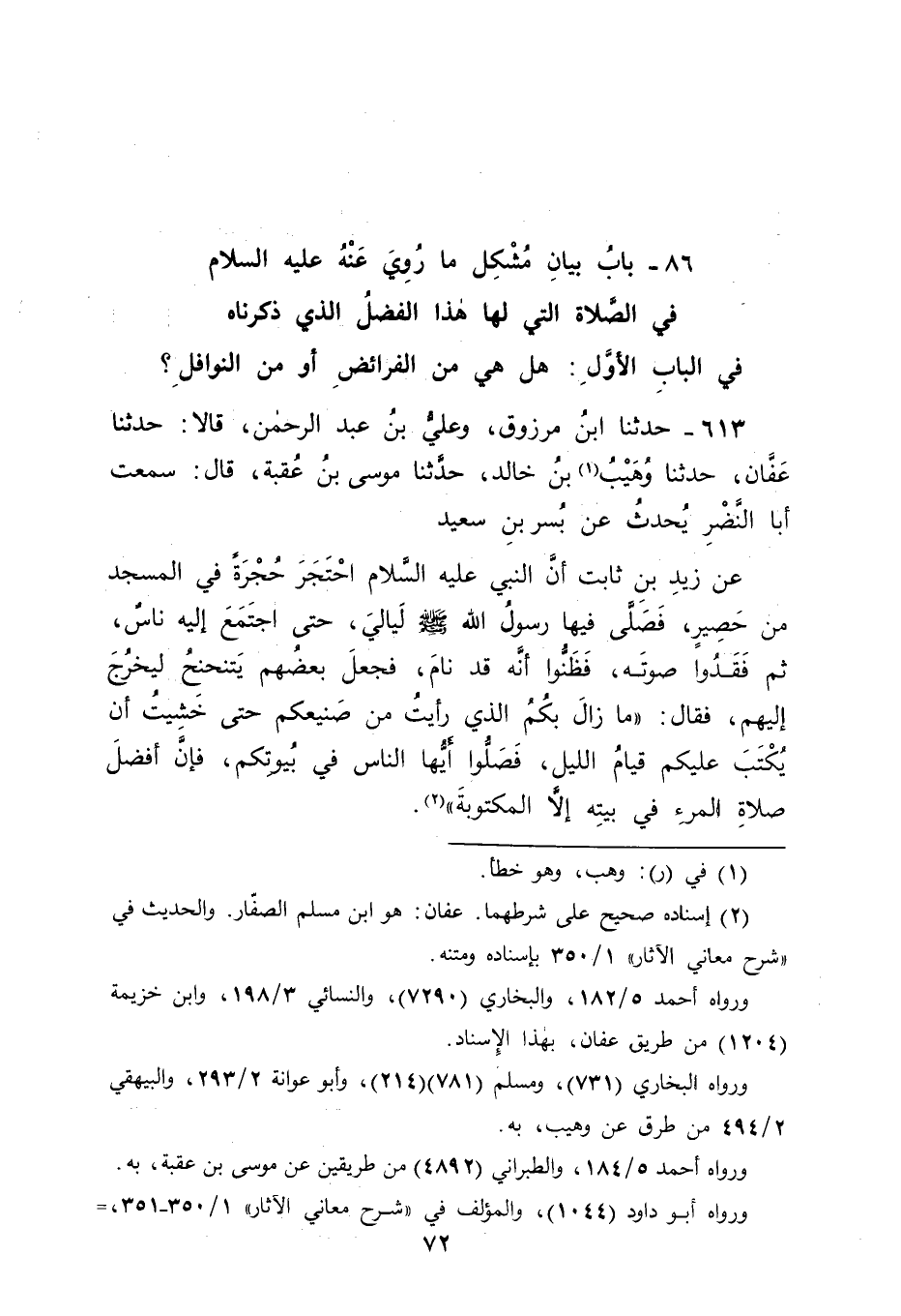613 - حَدَّثَنَا ابْنُ مَرْزُوقٍ، وَعَلِيُّ بْنُ عَبْدِ الرَّحْمَنِ قَالَا: حَدَّثَنَا عَفَّانَ، حَدَّثَنَا وُهَيْبُ بْنُ خَالِدٍ، حَدَّثَنَا مُوسَى بْنُ عُقْبَةَ قَالَ: سَمِعْتُ أَبَا النَّضْرِ يُحَدِّثُ عَنْ بُسْرِ بْنِ سَعِيدٍ، عَنْ زَيْدِ بْنِ ثَابِتٍ أَنَّ النَّبِيَّ عَلَيْهِ السَّلَامُ احْتَجَرَ حُجْرَةً فِي الْمَسْجِدِ مِنْ حَصِيرٍ، فَصَلَّى فِيهَا رَسُولُ اللهِ صَلَّى اللَّهُ عَلَيْهِ وَسَلَّمَ لَيَالِيَ حَتَّى اجْتَمَعَ إلَيْهِ نَاسٌ , ثُمَّ فَقَدُوا صَوْتَهُ فَظَنُّوا أَنَّهُ قَدْ نَامَ فَجَعَلَ بَعْضُهُمْ يَتَنَحْنَحُ؛ لِيَخْرُجَ إلَيْهِمْ، فَقَالَ: " مَا زَالَ بِكُمُ الَّذِي رَأَيْتُ مِنْ صَنِيعِكُمْ حَتَّى خَشِيتُ أَنْ يُكْتَبَ عَلَيْكُمْ قِيَامُ اللَّيْلِ فَصَلُّوا أَيُّهَا النَّاسُ فِي بُيُوتِكُمْ، فَإِنَّ أَفْضَلَ صَلَاةِ الْمَرْءِ فِي بَيْتِهِ إلَّا الْمَكْتُوبَةَ "