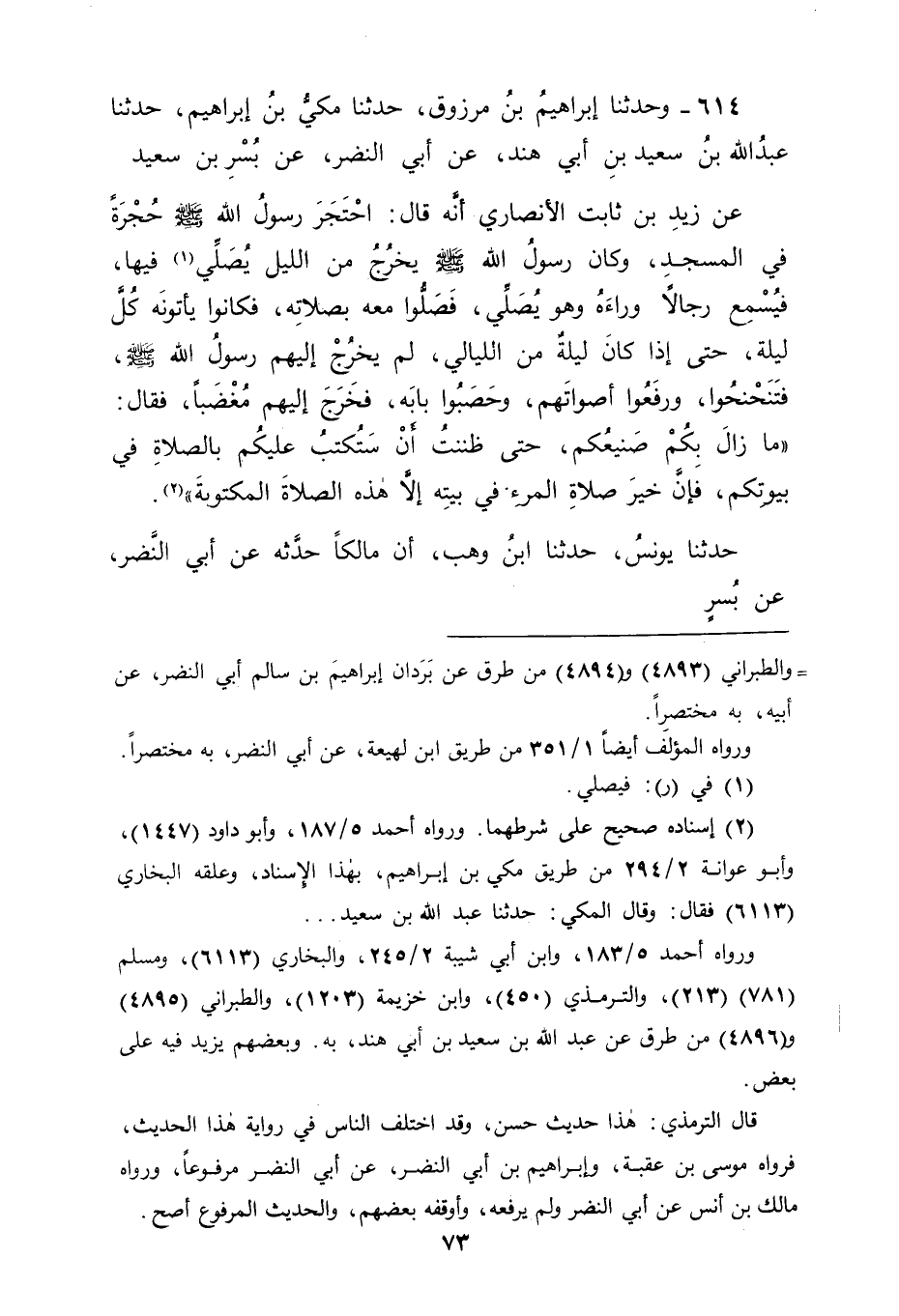 614 - وَحَدَّثَنَا إبْرَاهِيمُ بْنُ مَرْزُوقٍ، حَدَّثَنَا مَكِّيُّ بْنُ إبْرَاهِيمَ، حَدَّثَنَا عَبْدُ اللهِ بْنُ سَعِيدِ بْنِ أَبِي هِنْدَ، عَنْ أَبِي النَّضْرِ، عَنْ بُسْرِ بْنِ سَعِيدٍ، عَنْ زَيْدِ بْنِ ثَابِتٍ الْأَنْصَارِيِّ أَنَّهُ قَالَ: احْتَجَرَ رَسُولُ اللهِ صَلَّى اللَّهُ عَلَيْهِ وَسَلَّمَ حُجْرَةً فِي الْمَسْجِدِ، وَكَانَ رَسُولُ اللهِ صَلَّى اللَّهُ عَلَيْهِ وَسَلَّمَ يَخْرُجُ مِنَ اللَّيْلِ يُصَلِّي فِيهَا فَيَسْمَعُ رِجَالًا وَرَاءَهُ , وَهُوَ يُصَلِّي فَصَلَّوْا مَعَهُ بِصَلَاتِهِ، فَكَانُوا يَأْتُونَهُ كُلَّ لَيْلَةٍ حَتَّى إذَا كَانَ لَيْلَةً مِنَ اللَّيَالِي لَمْ يَخْرُجْ إلَيْهِمْ رَسُولُ اللهِ صَلَّى اللَّهُ عَلَيْهِ وَسَلَّمَ فَتَنَحْنَحُوا وَرَفَعُوا أَصْوَاتَهُمْ وَحَصَبُوا بَابَهُ، فَخَرَجَ إلَيْهِمْ مُغْضَبًا، فَقَالَ: " مَا زَالَ بِكُمْ صَنِيعُكُمْ حَتَّى ظَنَنْتُ أَنْ سَتُكْتَبُ، عَلَيْكُمْ بِالصَّلَاةِ فِي بُيُوتِكُمْ، فَإِنَّ خَيْرَ صَلَاةِ الْمَرْءِ فِي بَيْتِهِ إلَّا هَذِهِ الصَّلَاةَ الْمَكْتُوبَةَ "