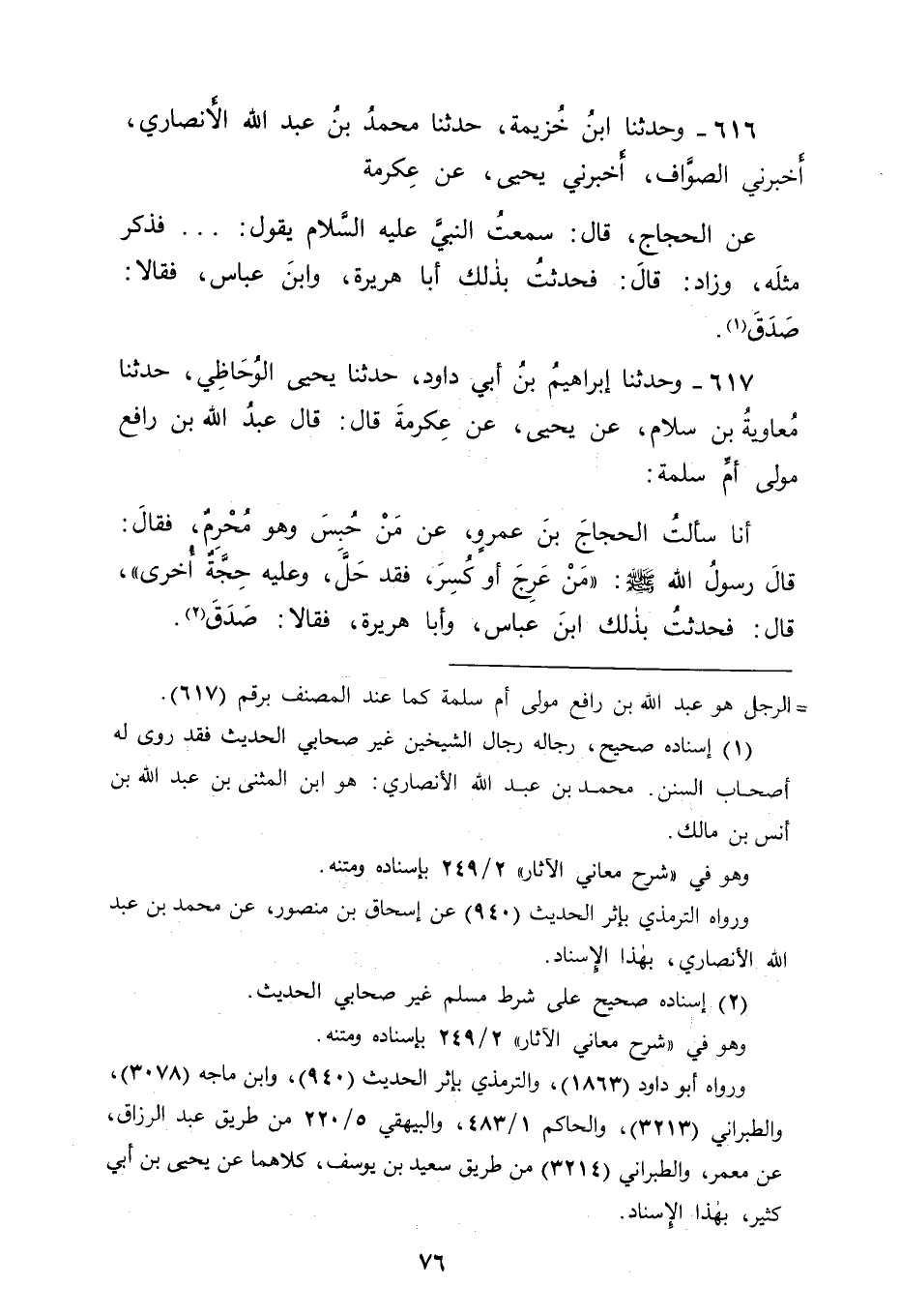 617 - وَحَدَّثَنَا إبْرَاهِيمُ بْنُ أَبِي دَاوُدَ، حَدَّثَنَا يَحْيَى الْوُحَاظِيُّ، حَدَّثَنَا مُعَاوِيَةُ بْنُ سَلَامٍ، عَنْ يَحْيَى، عَنْ عِكْرِمَةَ قَالَ: قَالَ عَبْدُ اللهِ بْنُ رَافِعٍ مَوْلَى أُمِّ سَلَمَةَ أَنَا سَأَلْتُ الْحَجَّاجَ بْنَ عَمْرٍو، عَنْ مَنْ حُبِسَ , وَهُوَ مُحْرِمٌ فَقَالَ: قَالَ رَسُولُ اللهِ صَلَّى اللَّهُ عَلَيْهِ وَسَلَّمَ " مَنْ عَرِجَ، أَوْ كُسِرَ فَقَدْ حَلَّ، وَعَلَيْهِ حَجَّةٌ أُخْرَى " قَالَ: فَحَدَّثْتُ بِذَلِكَ ابْنَ عَبَّاسٍ، وَأَبَا هُرَيْرَةَ فَقَالَا: صَدَقَ -[77]- فَقَالَ قَائِلٌ: كَيْفَ تَقْبَلُونَ هَذَا عَنْ رَسُولِ اللهِ صَلَّى اللَّهُ عَلَيْهِ وَسَلَّمَ؟ وَمَنْ كُسِرَ أَوْ عَرِجَ لَا يَخْلُو مِنْ أَحَدِ وَجْهَيْنِ أَنْ يَكُونَ مُحْصَرًا بِذَلِكَ، أَوْ غَيْرَ مُحْصَرٍ بِهِ، فَإِنْ كَانَ مُحْصَرًا بِهِ فَحُكْمُ الْمُحْصَرِ هُوَ كَمَا قَالَ اللهُ تَعَالَى: {فَإِنْ أُحْصِرْتُمْ فَمَا اسْتَيْسَرَ مِنَ الْهَدْيِ} [البقرة: 196] " إلَى قَوْلِهِ {أَوْ نُسُكٍ} [البقرة: 196] , وَإِنْ كَانَ بِذَلِكَ غَيْرَ مُحْصَرٍ بَقِيَ عَلَى حِرْمِهِ وَلَمْ يَحِلَّ مِنْ شَيْءٍ مِنْ ذَلِكَ، فَهَذَا الْحَدِيثُ أَهْلُ الْعِلْمِ جَمِيعًا عَلَى خِلَافِهِ. فَكَانَ جَوَابُنَا لَهُ فِي ذَلِكَ أَنَّ هَذَا الْحَدِيثَ لَيْسَ أَهْلُ الْعِلْمِ جَمِيعًا عَلَى خِلَافِهِ كَمَا ذَكَرَ، إذْ كَانَ أَهْلُ الْعِلْمِ فِي الْإِحْصَارِ الَّذِي لَهُ حُكْمُ الْإِحْصَارِ الْمَذْكُورِ فِي كِتَابِ اللهِ تَعَالَى عَلَى مَذْهَبَيْنِ، وَأَحَدُهُمَا أَنَّ ذَلِكَ الْإِحْصَارَ هُوَ بِكُلِّ حَابِسٍ يَحْبِسُ عَلَى النُّفُوذِ إلَى الْبَيْتِ وَمِمَّنْ كَانَ يَذْهَبُ إلَى ذَلِكَ مِنْهُمُ ابْنُ مَسْعُودٍ، وَابْنُ عَبَّاسٍ، وَابْنُ الزُّبَيْرِ