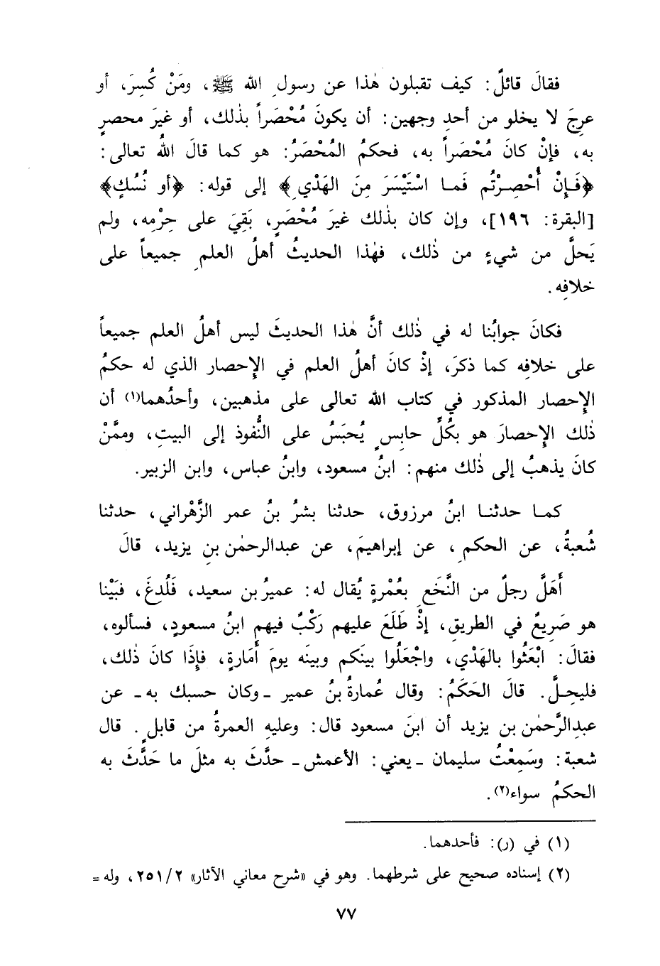 قَالَ شُعْبَةُ وَسَمِعْتُ سُلَيْمَانَ يَعْنِي الْأَعْمَشَ حَدَّثَ بِهِ مِثْلَ مَا حَدَّثَ بِهِ الْحَكَمُ سَوَاءً، -[78]- وَكَمَا حَدَّثَنَا بِهِ مُحَمَّدُ بْنُ زَكَرِيَّا بْنِ يَحْيَى أَبُو شُرَيْحٍ، وَعَبْدُ اللهِ بْنُ مُحَمَّدِ بْنِ أَبِي مَرْيَمَ قَالَا: حَدَّثَنَا الْفِرْيَابِيُّ حَدَّثَنَا سُفْيَانُ عَنِ الْأَعْمَشِ عَنْ إبْرَاهِيمَ عَنْ عَلْقَمَةَ: {فَإِنْ أُحْصِرْتُمْ} [البقرة: 196] قَالَ: " مَنْ حُبِسَ أَوْ مَرِضَ " قَالَ إبْرَاهِيمُ: فَحَدَّثْتُ بِهِ سَعِيدَ بْنَ جُبَيْرٍ فَقَالَ: هَكَذَا قَالَ ابْنُ عَبَّاسٍ "