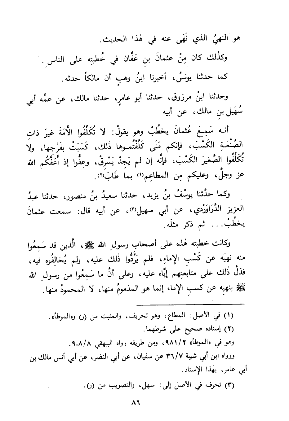 كَمَا حَدَّثَنَا يُونُسُ أَخْبَرَنَا ابْنُ وَهْبٍ أَنَّ مَالِكًا حَدَّثَهُ، وَحَدَّثَنَا ابْنُ مَرْزُوقٍ، حَدَّثَنَا أَبُو عَامِرٍ، حَدَّثَنَا مَالِكٌ عَنْ عَمِّهِ أَبِي سُهَيْلِ بْنِ مَالِكٍ، عَنْ أَبِيهِ أَنَّهُ سَمِعَ عُثْمَانَ يَخْطُبُ وَهُوَ يَقُولُ: " لَا تُكَلِّفُوا الْأَمَةَ غَيْرَ ذَاتِ الصَّنْعَةِ الْكَسْبَ ; فَإِنَّكُمْ مَتَى كَلَّفْتُمُوهَا ذَلِكَ كَسَبَتْ بِفَرْجِهَا , وَلَا تُكَلِّفُوا الصَّغِيرَ الْكَسْبَ ; فَإِنَّهُ إنْ لَمْ يَجِدْ يَسْرِقْ , وَعِفُّوا إذْ أَعَفَّكُمُ اللهُ عَزَّ وَجَلَّ , وَعَلَيْكُمْ مِنَ الْمَطَاعِمِ بِمَا طَابَ " وَكَمَا حَدَّثَنَا يُوسُفُ بْنُ يَزِيدَ حَدَّثَنَا سَعِيدُ بْنُ مَنْصُورٍ حَدَّثَنَا عَبْدُ الْعَزِيزِ الدَّرَاوَرْدِيُّ عَنْ أَبِي سُهَيْلٍ عَنْ أَبِيهِ قَالَ: سَمِعْتُ عُثْمَانَ يَخْطُبُ , ثُمَّ ذَكَرَ مِثْلَهُ وَكَانَتْ خُطْبَتُهُ هَذِهِ عَلَى أَصْحَابِ رَسُولِ اللهِ صَلَّى اللَّهُ عَلَيْهِ وَسَلَّمَ الَّذِينَ قَدْ سَمِعُوا مِنْهُ نَهْيَهُ عَنْ كَسْبِ الْإِمَاءِ فَلَمْ يَرُدُّوا ذَلِكَ عَلَيْهِ، وَلَمْ يُخَالِفُوهُ فِيهِ، فَدَلَّ ذَلِكَ عَلَى مُتَابَعَتِهِمْ إيَّاهُ عَلَيْهِ , وَعَلَى أَنَّ مَا سَمِعُوا مِنْ رَسُولِ اللهِ صَلَّى اللَّهُ عَلَيْهِ وَسَلَّمَ بِنَهْيِهِ عَنْ كَسْبِ الْإِمَاءِ إنَّمَا هُوَ الْمَذْمُومُ مِنْهَا لَا الْمَحْمُودُ مِنْهَا