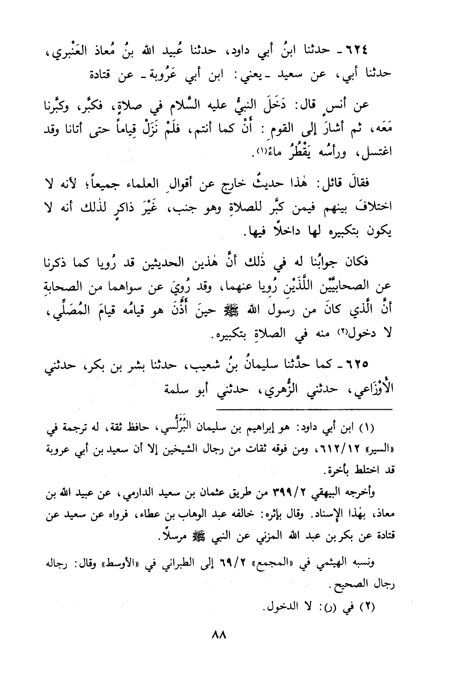624 - حَدَّثَنَا ابْنُ أَبِي دَاوُدَ، حَدَّثَنَا عُبَيْدُ اللهِ بْنُ مُعَاذٍ الْعَنْبَرِيُّ، حَدَّثَنَا أَبِي، عَنْ سَعِيدٍ يَعْنِي: ابْنَ أَبِي عَرُوبَةَ، عَنْ قَتَادَةَ، عَنْ أَنَسٍ قَالَ: " دَخَلَ النَّبِيُّ عَلَيْهِ السَّلَامُ فِي صَلَاةٍ، فَكَبَّرَ وَكَبَّرْنَا مَعَهُ، ثُمَّ أَشَارَ إلَى الْقَوْمِ أَنْ كَمَا أَنْتُمْ فَلَمْ نَزَلْ قِيَامًا حَتَّى أَتَانَا، وَقَدِ اغْتَسَلَ وَرَأْسُهُ يَقْطُرُ مَاءً " فَقَالَ قَائِلٌ: هَذَا حَدِيثٌ خَارِجٌ عَنْ أَقْوَالِ الْعُلَمَاءِ جَمِيعًا؛ لِأَنَّهُ لَا اخْتِلَافَ بَيْنَهُمْ فِيمَنْ كَبَّرَ لِلصَّلَاةِ وَهُوَ جُنُبٌ غَيْرُ ذَاكِرٍ لِذَلِكَ أَنَّهُ لَا يَكُونُ بِتَكْبِيرِهِ لَهَا دَاخِلًا فِيهَا فَكَانَ جَوَابُنَا لَهُ فِي ذَلِكَ أَنَّ هَذَيْنِ الْحَدِيثَيْنِ قَدْ رُوِيَا كَمَا ذَكَرْنَا عَنَ الصَّحَابِيَّيْنِ اللَّذَيْنِ رُوِيَا عَنْهُمَا وَقَدْ رُوِيَ عَنْ سِوَاهُمَا مِنَ الصَّحَابَةِ أَنَّ الَّذِي كَانَ مِنْ رَسُولِ اللهِ صَلَّى اللَّهُ عَلَيْهِ وَسَلَّمَ حِينَ أُذِنَ هُوَ قِيَامُهُ قِيَامَ الْمُصَلِّي لَا دُخُولٌ مِنْهُ فِي الصَّلَاةِ بِتَكْبِيرِهِ