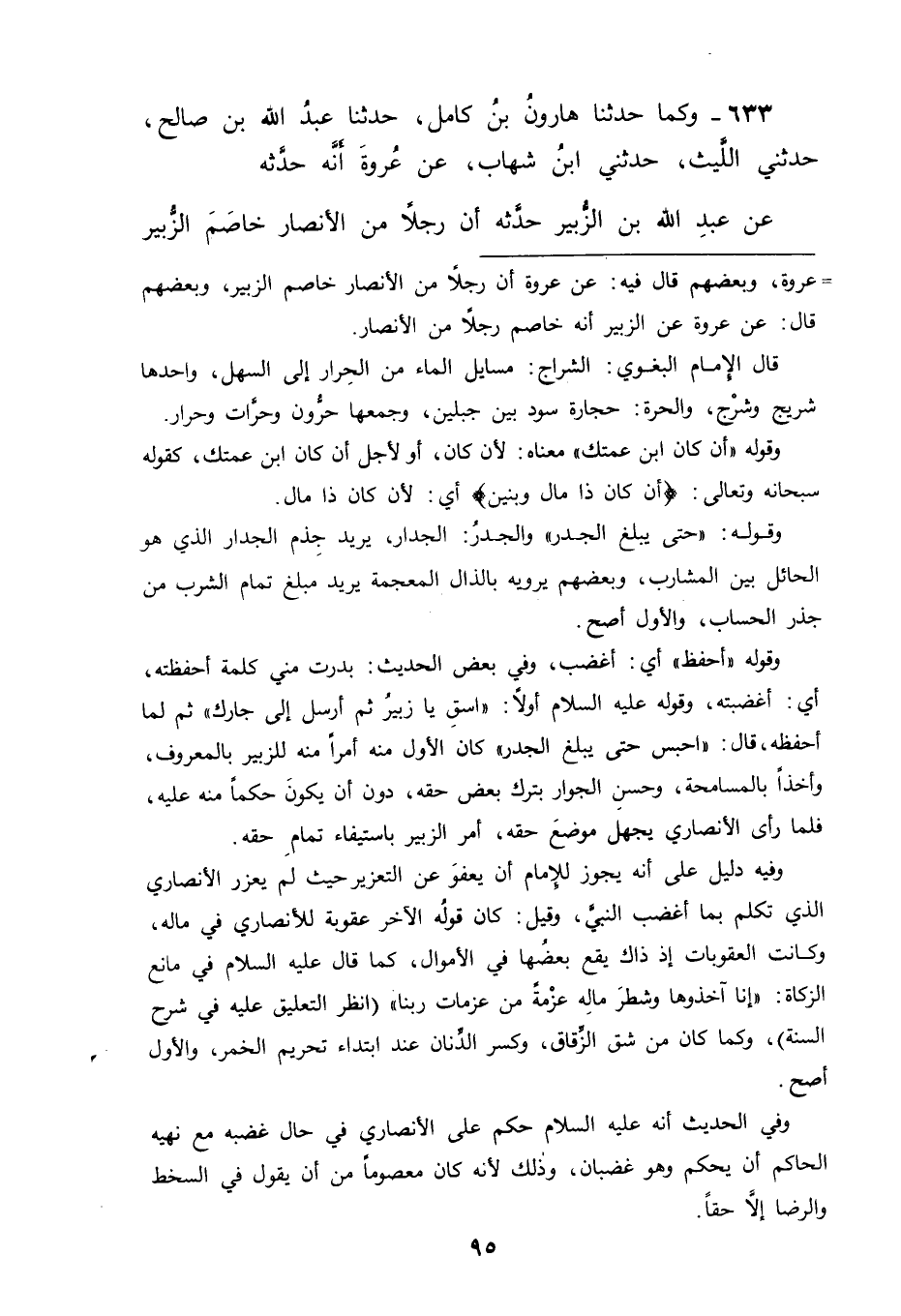 633 - وَكَمَا حَدَّثَنَا هَارُونُ بْنُ كَامِلٍ، حَدَّثَنَا عَبْدُ اللهِ بْنُ صَالِحٍ، حَدَّثَنِي اللَّيْثُ، حَدَّثَنِي ابْنُ شِهَابٍ، عَنْ عُرْوَةَ أَنَّهُ حَدَّثَهُ عَنْ عَبْدِ اللهِ بْنِ الزُّبَيْرِ، حَدَّثَهُ أَنَّ رَجُلًا مِنَ الْأَنْصَارِ خَاصَمَ الزُّبَيْرَ -[96]- إلَى رَسُولِ اللهِ صَلَّى اللَّهُ عَلَيْهِ وَسَلَّمَ فِي شِرَاجِ الْحَرَّةِ الَّتِي يَسْقُونَ بِهَا النَّخْلَ، فَقَالَ لِلْأَنْصَارِيِّ: سَرِّحِ الْمَاءَ يَمُرَّ، فَأَبَى عَلَيْهِ فَاخْتَصَمُوا عِنْدَ رَسُولِ اللهِ صَلَّى اللَّهُ عَلَيْهِ وَسَلَّمَ فَقَالَ رَسُولُ اللهِ صَلَّى اللَّهُ عَلَيْهِ وَسَلَّمَ: " اسْقِ يَا زُبَيْرُ ثُمَّ أَرْسِلْ إلَى جَارِكَ " فَغَضِبَ الْأَنْصَارِيُّ وَقَالَ: يَا رَسُولَ اللهِ , أَنْ كَانَ ابْنَ عَمَّتِكَ؟ فَتَلَوَّنَ وَجْهُ رَسُولِ اللهِ صَلَّى اللَّهُ عَلَيْهِ وَسَلَّمَ ثُمَّ قَالَ: " يَا زُبَيْرُ اسْقِ وَاحْبِسِ الْمَاءَ، ثُمَّ أَرْجِعْ إلَى الْجَدْرِ " قَالَ الزُّبَيْرُ: وَاللهِ مَا أَحْسَبُ هَذِهِ الْآيَةَ نَزَلَتْ إلَّا فِي ذَلِكَ: {فَلَا وَرَبِّكَ لَا يُؤْمِنُونَ} [النساء: 65]