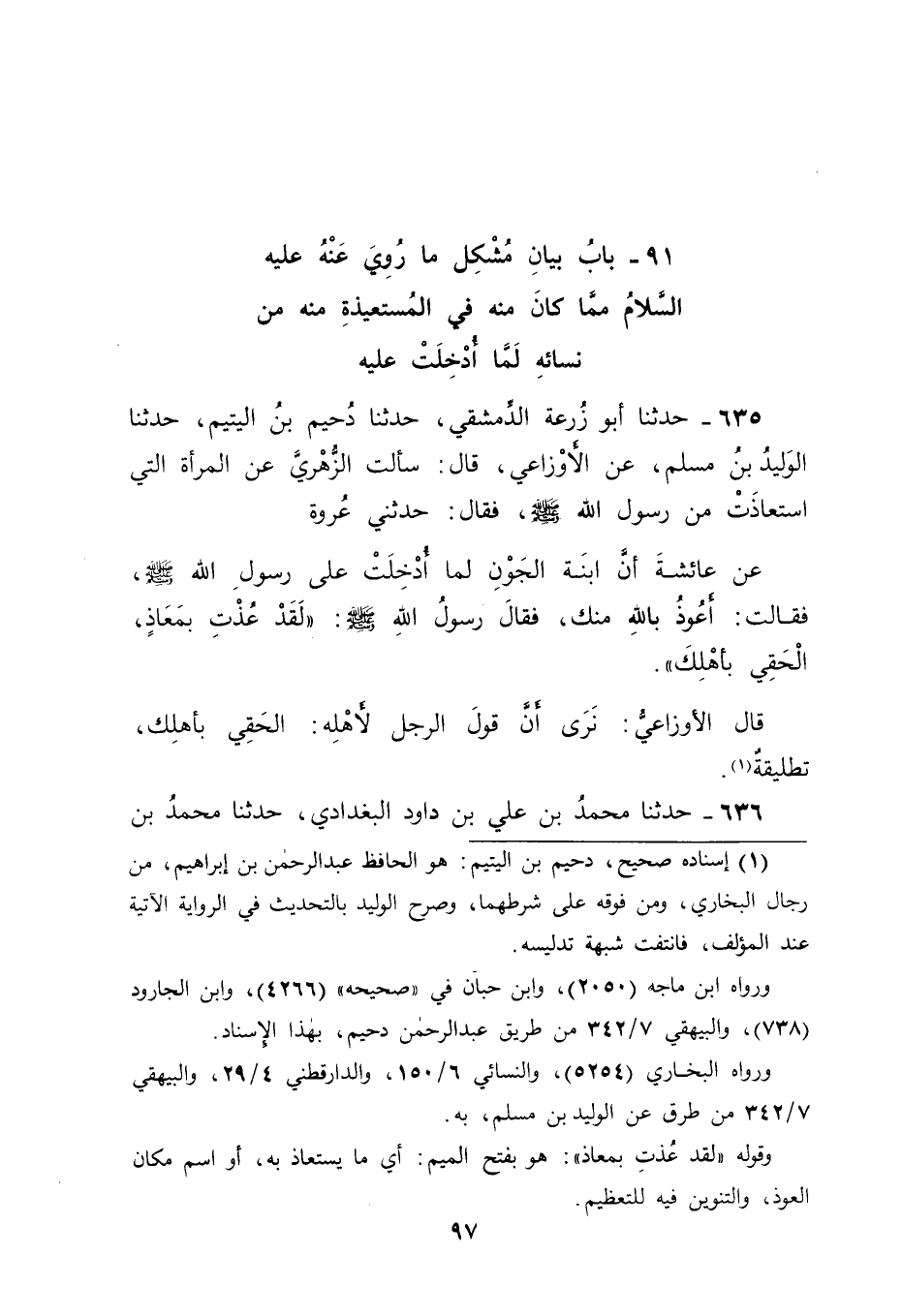 635 - حَدَّثَنَا أَبُو زُرْعَةَ الدِّمَشْقِيُّ، حَدَّثَنَا دُحَيْمُ بْنُ الْيَتِيمِ، حَدَّثَنَا الْوَلِيدُ بْنُ مُسْلِمٍ، عَنِ الْأَوْزَاعِيِّ قَالَ: سَأَلْتُ الزُّهْرِيَّ عَنِ الْمَرْأَةِ الَّتِي اسْتَعَاذَتْ مِنْ رَسُولِ اللهِ صَلَّى اللَّهُ عَلَيْهِ وَسَلَّمَ، فَقَالَ: حَدَّثَنِي عُرْوَةُ، عَنْ عَائِشَةَ أَنَّ ابْنَةَ الْجَوْنِ لَمَّا أُدْخِلَتْ عَلَى رَسُولِ اللهِ صَلَّى اللَّهُ عَلَيْهِ وَسَلَّمَ فَقَالَتْ: أَعُوذُ بِاللهِ مِنْكَ، فَقَالَ رَسُولُ اللهِ صَلَّى اللَّهُ عَلَيْهِ وَسَلَّمَ: " لَقَدْ عُذْتِ بِمَعَاذٍ الْحَقِي بِأَهْلِكَ " قَالَ الْأَوْزَاعِيُّ: نَرَى أَنَّ قَوْلَ الرَّجُلِ لِأَهْلِهِ: الْحَقِي بِأَهْلِكَ تَطْلِيقَةٌ