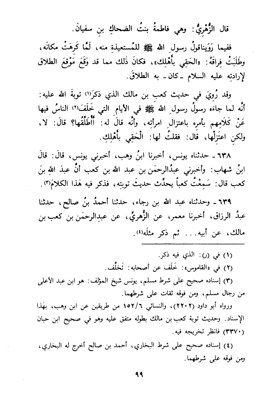 640 - وَحَدَّثَنَاهُ فَهْدٌ حَدَّثَنَا يُوسُفُ بْنُ بُهْلُولٍ الْكُوفِيُّ، حَدَّثَنَا عَبْدُ اللهِ بْنُ إدْرِيسَ، عَنْ مُحَمَّدِ بْنِ إِسْحَاقَ، عَنِ الزُّهْرِيِّ، عَنْ عَبْدِ الرَّحْمَنِ بْنِ عَبْدِ اللهِ بْنِ كَعْبٍ عَنْ أَبِيهِ عَنْ جَدِّهِ كَعْبٍ فَذَكَرَ مِثْلَهُ فَدَلَّ ذَلِكَ أَنَّ قَوْلَ الرَّجُلِ لِزَوْجَتِهِ: الْحَقِي بِأَهْلِكَ، يَكُونُ طَلَاقًا إذَا أَرَادَ بِهِ الطَّلَاقَ، وَلَا يَكُونُ طَلَاقًا إذَا لَمْ يُرِدْ بِهِ الطَّلَاقَ، وَقَدْ رُوِيَ مَا كَانَ مِنْ هَذِهِ الْمَرْأَةِ إلَى رَسُولِ اللهِ صَلَّى اللَّهُ عَلَيْهِ وَسَلَّمَ، وَمَا كَانَ مِنْ رَسُولِ اللهِ صَلَّى اللَّهُ عَلَيْهِ وَسَلَّمَ إلَيْهَا عِنْدَ ذَلِكَ مِنْ وَجْهٍ آخَرَ بِزِيَادَةٍ عَلَى مَا رَوَيْنَا فِي ذَلِكَ فِي هَذَا الْبَابِ