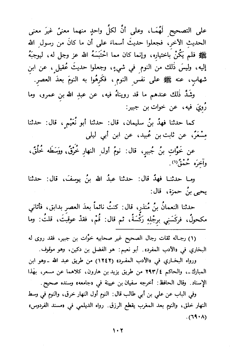 كَمَا حَدَّثَنَا فَهْدُ بْنُ سُلَيْمَانَ قَالَ: حَدَّثَنَا أَبُو نُعَيْمٍ قَالَ: حَدَّثَنَا مِسْعَرٌ عَنْ ثَابِتِ بْنِ عُبَيْدٍ عَنِ ابْنِ أَبِي لَيْلَى عَنْ خَوَّاتِ بْنِ جُبَيْرٍ قَالَ: " نَوْمُ أَوَّلِ النَّهَارِ خُرْقٌ وَوَسَطَهُ خُلُقٌ وَآخِرَهُ حُمْقٌ "