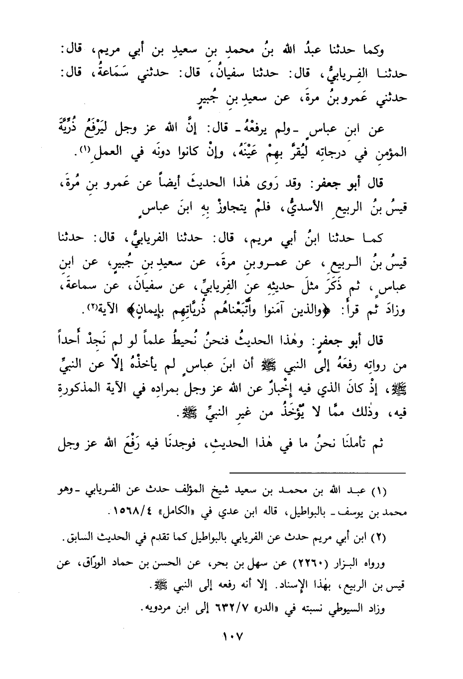 وَكَمَا حَدَّثَنَا عَبْدُ اللهِ بْنُ مُحَمَّدِ بْنِ سَعِيدِ بْنِ أَبِي مَرْيَمَ قَالَ: حَدَّثَنَا الْفِرْيَابِيُّ قَالَ: حَدَّثَنَا سُفْيَانُ قَالَ: حَدَّثَنِي سَمَاعَةُ قَالَ: حَدَّثَنِي عَمْرُو بْنُ مُرَّةَ عَنْ سَعِيدِ بْنِ جُبَيْرٍ عَنِ ابْنِ عَبَّاسٍ وَلَمْ يَرْفَعْهُ قَالَ: " إِنَّ اللهَ عَزَّ وَجَلَّ لَيَرْفَعُ ذُرِّيَّةَ الْمُؤْمِنِ فِي دَرَجَاتِهِ لِيُقِرَّ بِهِمْ عَيْنَهُ وَإِنْ كَانُوا دُونَهُ فِي الْعَمَلِ " قَالَ أَبُو جَعْفَرٍ: وَقَدْ رَوَى هَذَا الْحَدِيثَ أَيْضًا عَنْ عَمْرِو بْنِ مُرَّةَ قَيْسُ بْنُ الرَّبِيعِ الْأَسَدِيُّ فَلَمْ يَتَجَاوَزْ بِهِ ابْنَ عَبَّاسٍ كَمَا حَدَّثَنَا ابْنُ أَبِي مَرْيَمَ قَالَ: حَدَّثَنَا الْفِرْيَابِيُّ قَالَ: حَدَّثَنَا قَيْسُ بْنُ الرَّبِيعِ عَنْ عَمْرِو بْنِ مُرَّةَ عَنْ سَعِيدِ بْنِ جُبَيْرٍ عَنِ ابْنِ عَبَّاسٍ، ثُمَّ ذَكَرَ مِثْلَ حَدِيثِهِ، عَنِ الْفِرْيَابِيِّ عَنْ سُفْيَانَ عَنْ سَمَاعَةَ، وَزَادَ: ثُمَّ قَرَأَ: {وَالَّذِينَ آمَنُوا وَأَتْبَعْنَاهُمْ ذُرِّيَّاتِهِمْ بِإِيمَانٍ} ، الْآيَةَ قَالَ أَبُو جَعْفَرٍ: وَهَذَا الْحَدِيثُ فَنَحْنُ نُحِيطُ عِلْمًا لَوْ لَمْ نَجِدْ أَحَدًا مِنْ رُوَاتِهِ رَفَعَهُ إِلَى النَّبِيِّ صَلَّى اللَّهُ عَلَيْهِ وَسَلَّمَ أَنَّ ابْنَ عَبَّاسٍ لَمْ يَأْخُذْهُ إِلَّا عَنِ النَّبِيِّ صَلَّى اللَّهُ عَلَيْهِ وَسَلَّمَ إِذْ كَانَ الَّذِي فِيهِ إِخْبَارٌ عَنِ اللهِ عَزَّ وَجَلَّ بِمُرَادِهِ فِي الْآيَةِ الْمَذْكُورَةِ فِيهِ، وَذَلِكَ مِمَّا لَا يُؤْخَذُ مِنْ غَيْرِ النَّبِيِّ صَلَّى اللَّهُ عَلَيْهِ وَسَلَّمَ ثُمَّ تَأَمَّلْنَا نَحْنُ مَا فِي هَذَا الْحَدِيثِ فَوَجَدْنَا فِيهِ رَفْعَ اللهِ عَزَّ وَجَلَّ -[108]- ذُرِّيَّةَ الْمُؤْمِنِ الَّذِينَ اتَّبَعُوهُ بِإِيمَانٍ بِالْمُؤْمِنِ الَّذِينَ هُمْ ذُرِّيَّتُهُ لِيُقِرَّ بِهِمْ عَيْنَهُ وَإِلْحَاقَهُ إِيَّاهُمْ بِهِ , وَوَجَدْنَا غَيْرَ النَّبِيِّ صَلَّى اللَّهُ عَلَيْهِ وَسَلَّمَ مِنَ الْمُؤْمِنِينَ قَدْ دَخَلَ فِي ذَلِكَ فَعَقَلْنَا بِذَلِكَ أَنَّ النَّبِيَّ صَلَّى اللَّهُ عَلَيْهِ وَسَلَّمَ أَدْخَلُ فِي ذَلِكَ مِنْهُمْ , وَأَنَّهُ فِي إلْحَاقِ اللهِ عَزَّ وَجَلَّ بِهِ ذُرِّيَّتَهُ الْمُتَّبِعَةَ لَهُ بِالْإِيمَانِ بِهِ لِيُقِرَّ عَيْنَهُ بِذَلِكَ أَوْلَى مِنْ سَائِرِ الْمُؤْمِنِينَ سِوَاهُ , وَإِنَّمَا كَانَ ذَلِكَ لِسَائِرِ الْمُؤْمِنِينَ سِوَاهُ لِيُقِرَّ بِهِ أَعْيُنَهُمْ كَانَ لَهُ فِي ذُرِّيَّتِهِ الْمُتَّبِعَةِ لَهُ بِالْإِيمَانِ أَوْلَى , وَكَانُوا بِذَلِكَ مِنْهُ أَحْرَى , وَاللهَ نَسْأَلُهُ التَّوْفِيقَ