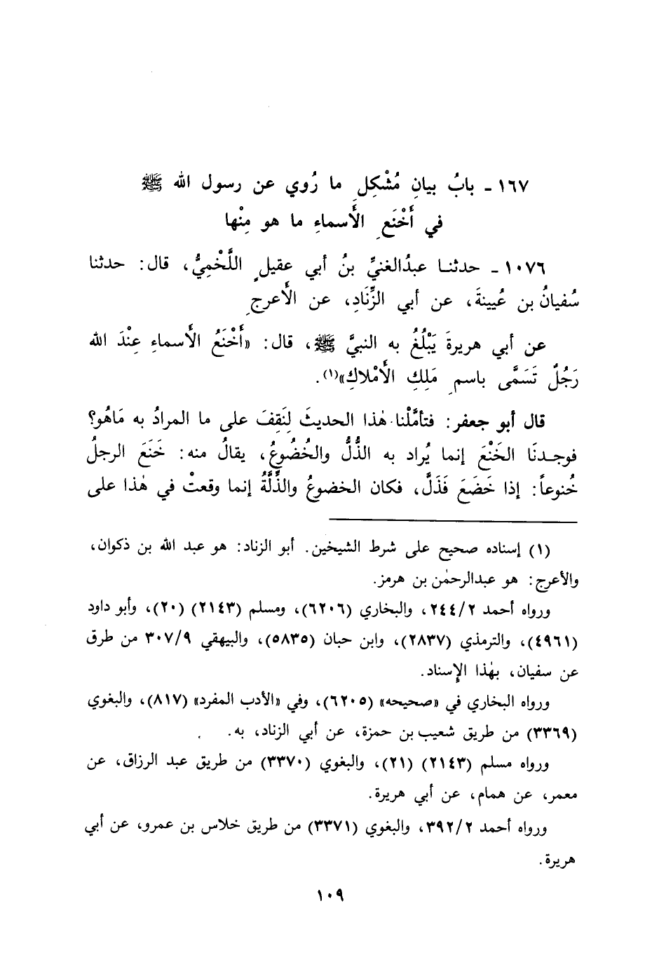 1076 - حَدَّثَنَا عَبْدُ الْغَنِيِّ بْنُ أَبِي عَقِيلٍ اللَّخْمِيُّ، قَالَ: حَدَّثَنَا سُفْيَانُ بْنُ عُيَيْنَةَ، عَنْ أَبِي الزِّنَادِ، عَنِ الْأَعْرَجِ، عَنْ أَبِي هُرَيْرَةَ يَبْلُغُ بِهِ النَّبِيَّ صَلَّى اللَّهُ عَلَيْهِ وَسَلَّمَ قَالَ: " أَخْنَعُ الْأَسْمَاءِ عِنْدَ اللهِ رَجُلٌ تَسَمَّى بِاسْمِ مَلِكِ الْأَمْلَاكِ " قَالَ أَبُو جَعْفَرٍ: فَتَأَمَّلْنَا هَذَا الْحَدِيثَ لِنَقِفَ عَلَى مَا الْمُرَادُ بِهِ مَا هُوَ، فَوَجَدْنَا الْخَنْعَ إِنَّمَا يُرَادُ بِهِ الذُّلُّ وَالْخُضُوعُ , يُقَالُ مِنْهُ: خَنَعَ الرَّجُلُ خُنُوعًا إِذَا خَضَعَ فَذَلَّ، فَكَانَ الْخُضُوعُ وَالذِّلَّةُ إِنَّمَا وَقَعَتْ فِي هَذَا عَلَى -[110]- ذِي الِاسْمِ لَا الِاسْمِ نَفْسِهِ ; لِأَنَّ الِاسْمَ لَا يَلْحَقُهُ ذَمٌّ وَلَا مَدْحٌ وَكَانَ ذَلِكَ كَقَوْلِهِ عَزَّ وَجَلَّ: {سَبِّحِ اسْمَ رَبِّكَ الْأَعْلَى} [الأعلى: 1] فِي مَعْنَى سَبِّحِ اسْمَ رَبِّكَ الْأَعْلَى بِاسْمِهِ، فَكَقَوْلِهِ عَزَّ وَجَلَّ فِي قِصَّةِ نَبِيِّهِ لُوطٍ صَلَّى اللَّهُ عَلَيْهِ وَسَلَّمَ: {وَنَجَّيْنَاهُ مِنَ الْقَرْيَةِ الَّتِي كَانَتْ تَعْمَلُ الْخَبَائِثَ} [الأنبياء: 74] لَيْسَ يُرِيدُ بِذَلِكَ الْقَرْيَةَ نَفْسَهَا، وَإِنَّمَا يُرِيدُ أَهْلَهَا الَّذِينَ كَانُوا يَعْمَلُونَ الْخَبَائِثَ وَكَقَوْلِهِ عَزَّ وَجَلَّ: {وَضَرَبَ اللهُ مَثَلًا قَرْيَةً كَانَتْ آمِنَةً مُطْمَئِنَّةً يَأْتِيهَا رِزْقُهَا رَغَدًا مِنْ كُلِّ مَكَانٍ فَكَفَرَتْ بِأَنْعُمِ اللهِ فَأَذَاقَهَا اللهُ لِبَاسَ الْجُوعِ وَالْخَوْفِ بِمَا كَانُوا يَصْنَعُونَ} [النحل: 112] ، يُرِيدُ: أَهْلَهَا لَا هِيَ نَفْسَهَا ثُمَّ بَيَّنَ عَزَّ وَجَلَّ مُرَادَهُ ذَلِكَ فِيهَا بِقَوْلِهِ: {وَلَقَدْ جَاءَهُمْ رَسُولٌ مِنْهُمْ} [النحل: 113] ، وَكَانَ الْمُرَادُ بِمَلِكِ الْأَمْلَاكِ اللهَ عَزَّ وَجَلَّ، فَكَانَ الْمُسَمَّى بِاسْمٍ مِنْ أَسْمَائِهِ عَزَّ وَجَلَّ مُتَكَبِّرًا فَرَدَّهُ اللهُ عَزَّ وَجَلَّ بِذَلِكَ إِلَى الْخُضُوعِ وَالذِّلَّةِ , إِذْ كَانَ أَكْبَرُ أَسْمَائِهِ عَزَّ وَجَلَّ إِنَّمَا هِيَ صِفَاتُهُ الَّتِي يُبَيِّنُ بِهَا عَزَّ وَجَلَّ عَنْ خَلْقِهِ مِنَ الرَّحْمَةِ وَمِنَ الْعِزَّةِ وَمِنَ الْعَظَمَةِ وَمِنَ الْجَلَالِ , وَمِنْ مَا سِوَى ذَلِكَ عَزَّ وَجَلَّ، فَكَانَ بِمَا سِوَى ذَلِكَ مِنْ أَسْمَائِهِ عَزَّ وَجَلَّ كَاسْمِهِ الْأَعْظَمِ مِمَّا قَدْ قَالَ جَلَّ وَعَزَّ: {هَلْ تَعْلَمُ لَهُ سَمِيًّا} [مريم: 65] فَقَصَرَ بِالْخَلْقِ عَنْ ذَلِكَ , وَتَفَرَّدَ بِهِ تَبَارَكَ وَتَعَالَى وَأَضَافَ أَسْمَاءَهُ إِلَيْهِ فَقَالَ عَزَّ وَجَلَّ {وَلِلَّهِ الْأَسْمَاءُ الْحُسْنَى فَادْعُوهُ بِهَا} [الأعراف: 180] ، وَبِاللهِ التَّوْفِيقُ