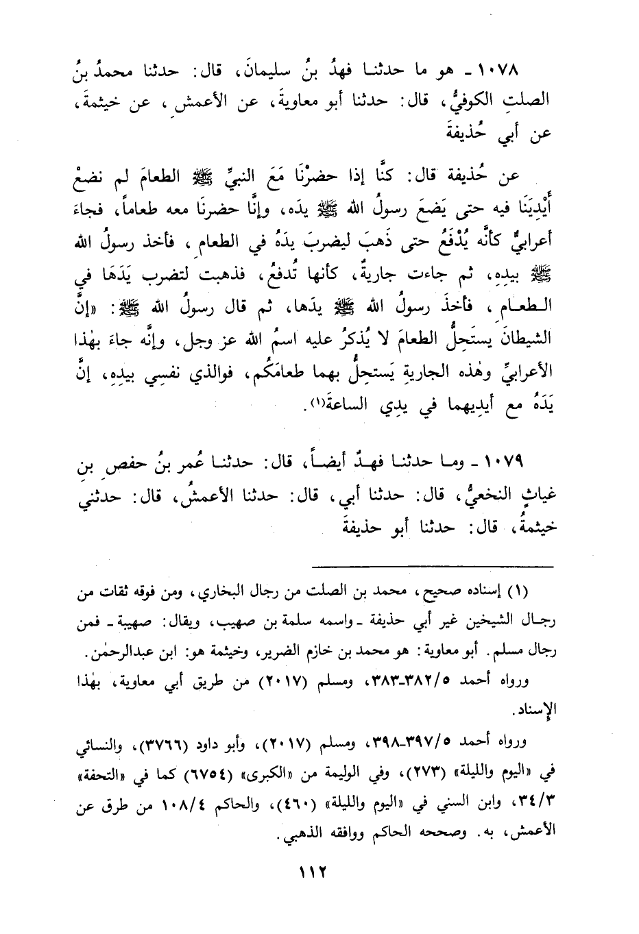 1078 - هُوَ مَا حَدَّثَنَا فَهْدُ بْنُ سُلَيْمَانَ، قَالَ: حَدَّثَنَا مُحَمَّدُ بْنُ الصَّلْتِ الْكُوفِيُّ، قَالَ: حَدَّثَنَا أَبُو مُعَاوِيَةَ، عَنِ الْأَعْمَشِ، عَنْ خَيْثَمَةَ، عَنْ أَبِي حُذَيْفَةَ، عَنْ حُذَيْفَةَ، قَالَ: كُنَّا إِذَا حَضَرْنَا مَعَ النَّبِيِّ صَلَّى اللَّهُ عَلَيْهِ وَسَلَّمَ الطَّعَامَ لَمْ نَضَعْ أَيْدِيَنَا فِيهِ حَتَّى يَضَعَ رَسُولُ اللهِ صَلَّى اللَّهُ عَلَيْهِ وَسَلَّمَ يَدَهُ , وَإِنَّا حَضَرْنَا مَعَهُ طَعَامًا فَجَاءَ أَعْرَابِيٌّ كَأَنَّهُ يُدْفَعُ حَتَّى ذَهَبَ لِيَضْرِبَ يَدَهُ فِي الطَّعَامِ، فَأَخَذَ رَسُولُ اللهِ صَلَّى اللَّهُ عَلَيْهِ وَسَلَّمَ بِيَدِهِ , ثُمَّ جَاءَتْ جَارِيَةٌ كَأَنَّهَا تُدْفعُ فَذَهَبَتْ لِتَضْرِبَ يَدَهَا فِي الطَّعَامِ فَأَخَذَ رَسُولُ اللهِ صَلَّى اللَّهُ عَلَيْهِ وَسَلَّمَ يَدَهَا ثُمَّ قَالَ رَسُولُ اللهِ صَلَّى اللَّهُ عَلَيْهِ وَسَلَّمَ: " إِنَّ الشَّيْطَانَ يَسْتَحِلُّ الطَّعَامَ لَا يُذْكَرُ عَلَيْهِ اسْمُ اللهِ عَزَّ وَجَلَّ , وَإِنَّهُ جَاءَ بِهَذَا الْأَعْرَابِيِّ وَهَذِهِ الْجَارِيَةِ يَسْتَحِلُّ بِهِمَا طَعَامَكُمْ، فَوَالَّذِي نَفْسِي بِيَدِهِ إِنَّ يَدَهُ مَعَ أَيْدِيهِمَا فِي يَدِي السَّاعَةَ "