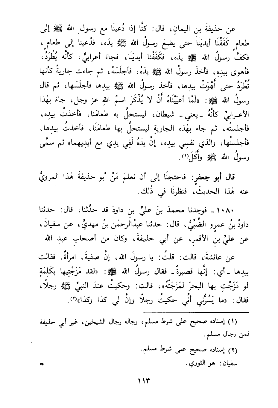 1080 - فَوَجَدْنَا مُحَمَّدَ بْنَ عَلِيِّ بْنِ دَاوُدَ قَدْ حَدَّثَنَا قَالَ: حَدَّثَنَا دَاوُدُ بْنُ عَمْرٍو الضَّبِّيُّ، قَالَ: حَدَّثَنَا عَبْدُ الرَّحْمَنِ بْنُ مَهْدِيٍّ، عَنْ سُفْيَانَ، عَنْ عَلِيِّ بْنِ الْأَقْمَرِ، عَنْ أَبِي حُذَيْفَةَ، وَكَانَ مِنْ أَصْحَابِ عَبْدِ اللهِ عَنْ عَائِشَةَ، قَالَتْ: قُلْتُ: يَا رَسُولَ اللهِ: إِنَّ صَفِيَّةَ امْرَأَةٌ، فَقَالَتْ بِيَدِهَا: أَيْ: إِنَّهَا قَصِيرَةٌ، فَقَالَ رَسُولُ اللهِ صَلَّى اللَّهُ عَلَيْهِ وَسَلَّمَ: " لَقَدْ مَزَجْتِيهَا بِكَلِمَةٍ لَوْ مَزَجْتِ بِهَا الْبَحْرَ لَمَزَجَتْهُ " , قَالَتْ: وَحَكَيْتُ عِنْدَ النَّبِيِّ صَلَّى اللَّهُ عَلَيْهِ وَسَلَّمَ رَجُلًا، فَقَالَ: مَا يَسُرُّنِي أَنِّي حَكَيْتُ رَجُلًا وَإِنَّ لِي كَذَا وَكَذَا -[114]- قَالَ أَبُو جَعْفَرٍ: فَوُقِفْنَا بِذَلِكَ عَلَى أَنَّهُ مِنْ أَصْحَابِ عَبْدِ اللهِ بْنِ مَسْعُودٍ وَكَانَ فِي ذَلِكَ مَا قَدْ دَلَّ عَلَى جَلَالَةِ مِقْدَارِهِ وَعُلُوِّ مَنْزِلَتِهِ , ثُمَّ طَلَبْنَا الْقَبِيلَةَ الَّتِي هُوَ مِنْهَا فَوَجَدْنَا الْبُخَارِيَّ قَدْ ذَكَرَهُ فِي تَارِيخِهِ، قَالَ: وَاسْمُهُ سَلَمَةُ بْنُ صُهَيْبَةَ الْأَرْحَبِيُّ وَأَرْحَبُ مِنْ هَمْدَانَ ثُمَّ تَأَمَّلْنَا قَوْلَ النَّبِيِّ صَلَّى اللَّهُ عَلَيْهِ وَسَلَّمَ: " إِنَّ الشَّيْطَانَ يَسْتَحِلُّ طَعَامَ الْقَوْمِ إِذَا لَمْ يَذْكُرُوا اسْمَ اللهِ عَلَيْهِ ". لِنَقِفَ عَلَى ذَلِكَ الِاسْتِحْلَالِ مَا هُوَ , فَوَجَدْنَا الْحَلَالَ هُوَ الشَّيْءُ الْمُطْلَقُ , وَوَجَدْنَا الْحَرَامَ هُوَ الشَّيْءُ الْمَمْنُوعُ مِنْهُ، وَوَجَدْنَا مَنْ فَعَلَ شَيْئًا مَمْنُوعًا مِنْهُ كَانَ بِذَلِكَ مُطْلِقًا لِنَفْسِهِ مَا فَعَلَهُ مِنْ ذَلِكَ , فَكَانَ بِفِعْلِهِ ذَلِكَ مُسْتَحِلًّا لِإِطْلَاقِهِ لِنَفْسِهِ مَا أَطْلَقَهُ لَهَا مِنْ ذَلِكَ حَتَّى فَعَلَتْهُ , وَمِنْ ذَلِكَ قَوْلُ اللهِ جَلَّ وَعَزَّ فِي الْآيَةِ الَّتِي ذُكِرَ فِيهَا النَّسِيءُ: {يُحِلُّونَهُ عَامًا وَيُحَرِّمُونَهُ عَامًا لِيُوَاطِئُوا عِدَّةَ مَا حَرَّمَ اللهُ فَيُحِلُّوا مَا حَرَّمَ اللهُ} أَيْ: لِيُطْلِقُوا لِأَنْفُسِهِمْ مَا حَرَّمَ اللهُ عَزَّ وَجَلَّ عَلَيْهِمْ مِنْ ذَلِكَ , وَمِنْهُ قَوْلُ النَّاسِ: اسْتَحَلَّ فُلَانٌ دَمِي وَاسْتَحَلَّ فُلَانٌ مَالِي عَلَى مَعْنَى أَطْلَقَ لِنَفْسِهِ دَمِي وَأَطْلَقَ لِنَفْسِهِ مَالِي. ثُمَّ تَأَمَّلْنَا بَعْدَ ذَلِكَ مَا فِي هَذَا الْحَدِيثِ مِنْ قَوْلِهِ صَلَّى اللَّهُ عَلَيْهِ وَسَلَّمَ: " إِنَّ الشَّيْطَانَ يَسْتَحِلُّ طَعَامَ الْقَوْمِ إِذَا لَمْ يَذْكُرُوا اسْمَ اللهِ عَلَيْهِ " فَوَجَدْنَاهُ صَلَّى اللَّهُ عَلَيْهِ وَسَلَّمَ قَدْ رُوِيَ عَنْهُ -[115]- أَمْرُهُ بِالتَّسْمِيَةِ عَلَى الْأَشْيَاءِ عِنْدَ وَضْعِهَا؛ لِيَكُونَ ذَلِكَ مَنْعًا لِلشَّيْطَانِ مِنْهَا