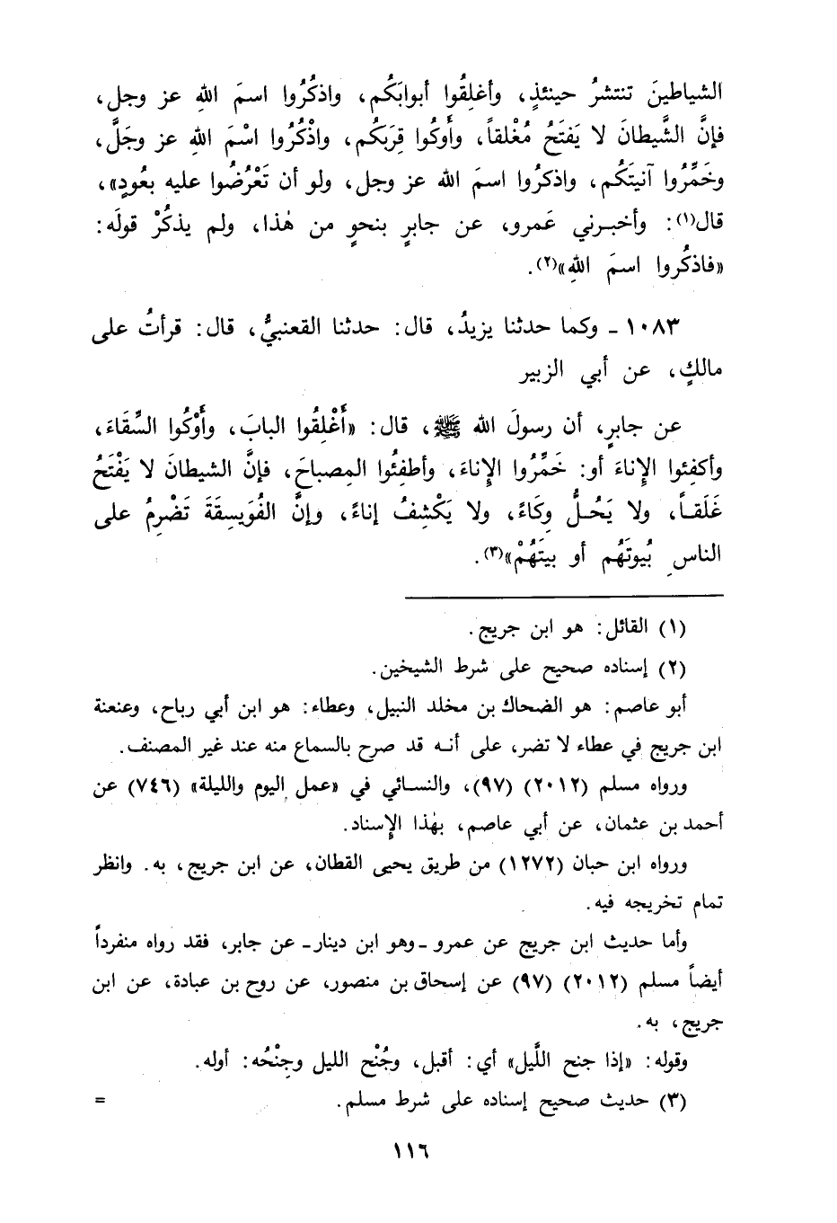 1083 - وَكَمَا حَدَّثَنَا يَزِيدُ، قَالَ: حَدَّثَنَا الْقَعْنَبِيُّ، قَالَ: قَرَأْتُ عَلَى مَالِكٍ، عَنْ أَبِي الزُّبَيْرِ، عَنْ جَابِرٍ، أَنَّ رَسُولَ اللهِ صَلَّى اللَّهُ عَلَيْهِ وَسَلَّمَ قَالَ: " أَغْلِقُوا الْبَابَ وَأَوْكُوا السِّقَاءَ وَأَكْفِئُوا الْإِنَاءَ، أَوْ: خَمِّرُوا الْإِنَاءَ، وَأَطْفِئُوا الْمِصْبَاحَ فَإِنَّ الشَّيْطَانَ لَا يَفْتَحُ غَلَقًا وَلَا يَحُلُّ وِكَاءً وَلَا يَكْشِفُ إنَاءً , وَإِنَّ الْفُوَيْسِقَةَ تَضْرِمُ عَلَى النَّاسِ بُيُوتَهُمْ أَوْ بَيْتَهُمْ " -[117]- قَالَ أَبُو جَعْفَرٍ: فَاحْتُمِلَ أَنْ تَكُونَ التَّسْمِيَةُ عَلَى الطَّعَامِ عِنْدَ وَضْعِهِ مِنْ وَاضِعِهِ أَوْ عِنْدَ تَغْطِيَتِهِ بِمَا يُغَطَّى بِهِ هِيَ التَّسْمِيَةُ الْمَانِعَةُ لِلشَّيْطَانِ مِنْهُ بَعْدَ ذَلِكَ أَبَدًا. فَوَجَدْنَاهُ صَلَّى اللَّهُ عَلَيْهِ وَسَلَّمَ قَدْ رُوِيَ عَنْهُ فِي هَذَا الْحَدِيثِ الَّذِي رَوَيْنَاهُ فِي صَدْرِ هَذَا الْبَابِ قَوْلُهُ: " إِنَّ الشَّيْطَانَ يَسْتَحِلُّ طَعَامَ الْقَوْمِ إِذَا لَمْ يَذْكُرُوا اسْمَ اللهِ عَلَيْهِ عِنْدَ أَكْلِهِمْ إِيَّاهُ " , فَعَقَلْنَا بِذَلِكَ أَنَّ التَّسْمِيَةَ عِنْدَ تَخْمِيرِهِ أَوْ عِنْدَ إِيعَائِهِ إِنَّمَا تَحْفَظُهُ مَا كَانَ مُوكًى أَوْ مَا كَانَ مُوعًى حَتَّى يُحَاوِلَ أَهْلُهُ أَكْلَهُ , فَإِذَا حَاوَلُوا ذَلِكَ احْتَاجُوا إِلَى تَسْمِيَةِ اللهِ. ثُمَّ طَلَبْنَا مَا الَّذِي يَنْبَغِي لَهُمْ إِذَا ذَهَبَتْ عَنْهُمُ التَّسْمِيَةُ أَنْ يَكُونَ مِنْهُمْ عِنْدَ مُحَاوَلَتِهِمْ أَكْلَهُ مَا الَّذِي يَنْبَغِي أَنْ يَفْعَلُوهُ حَتَّى لَا يَنْتَفِعَ الشَّيْطَانُ بِمَا أَكَلَ مِنْهُ قَبْلَ ذَلِكَ وَحَتَّى يَكُونَ ذَلِكَ سَبَبًا يَمْنَعُهُ مِنْ بَقِيَّتِهِ
