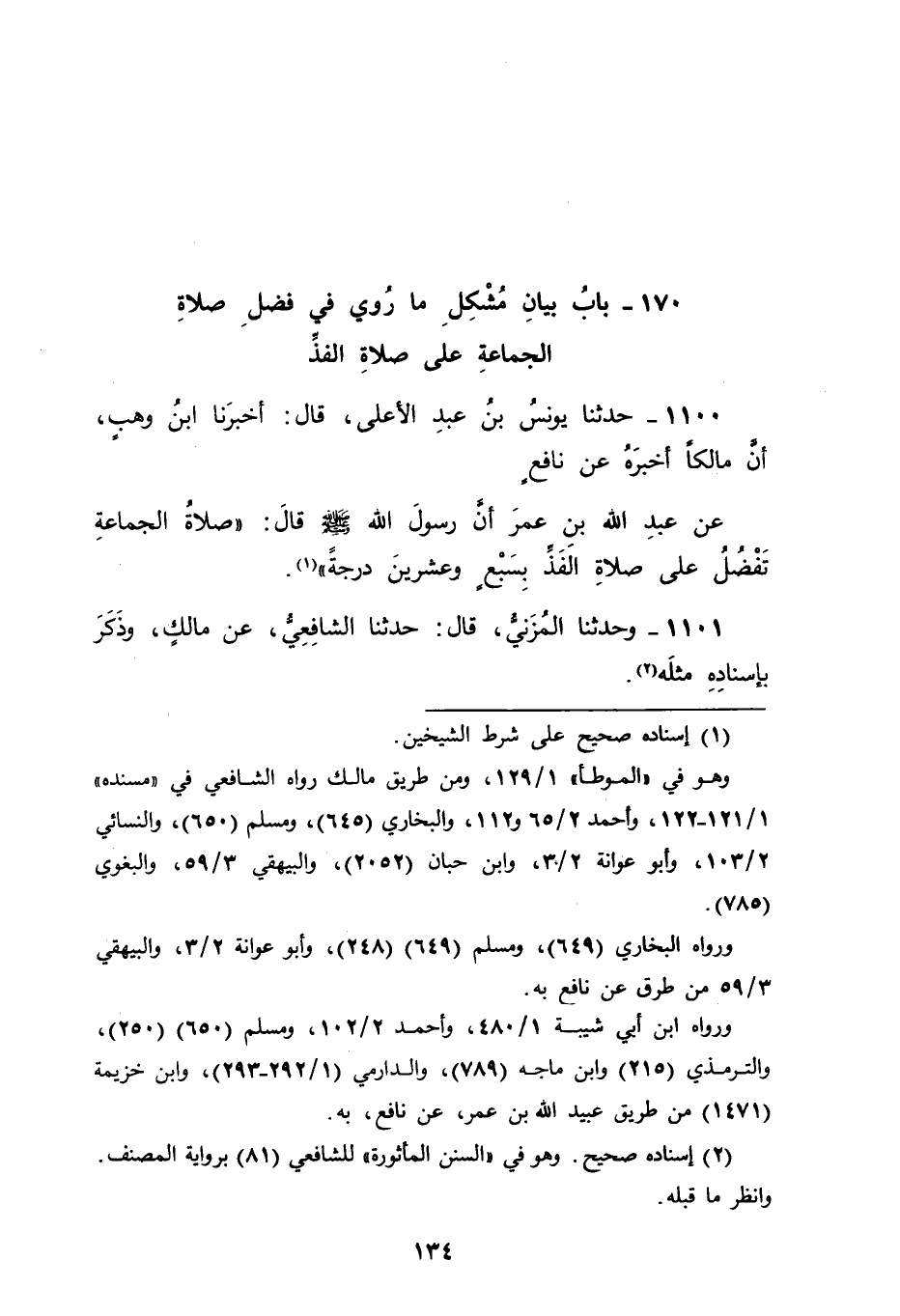 1100 - حَدَّثَنَا يُونُسُ بْنُ عَبْدِ الْأَعْلَى، قَالَ: أَخْبَرَنَا ابْنُ وَهْبٍ، أَنَّ مَالِكًا، أَخْبَرَهُ عَنْ نَافِعٍ، عَنْ عَبْدِ اللهِ بْنِ عُمَرَ، أَنَّ رَسُولَ اللهِ صَلَّى اللَّهُ عَلَيْهِ وَسَلَّمَ قَالَ: " صَلَاةُ الْجَمَاعَةِ تَفْضُلُ عَلَى صَلَاةِ الْفَذِّ بِسَبْعٍ وَعِشْرِينَ دَرَجَةً "