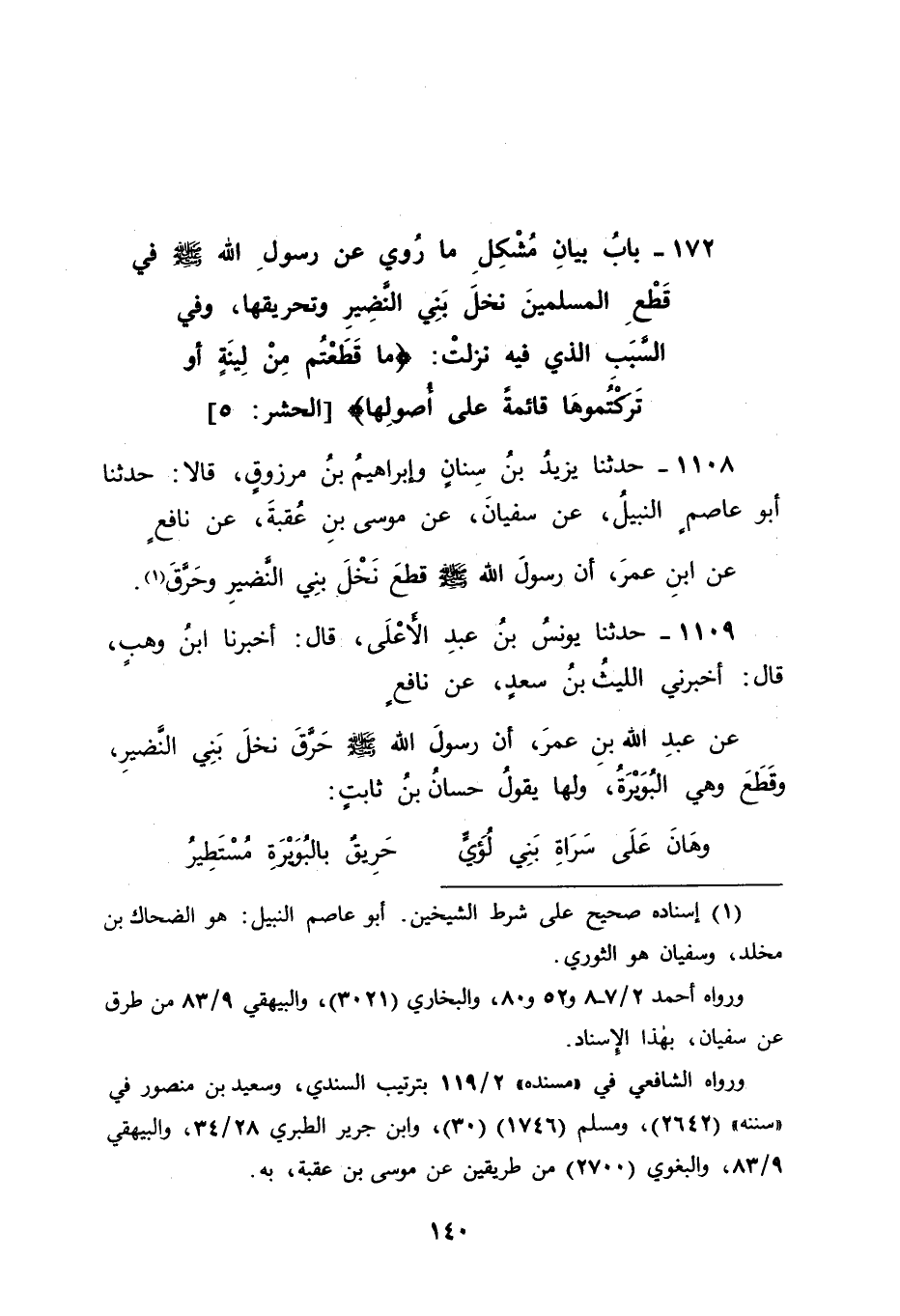 1109 - حَدَّثَنَا يُونُسُ بْنُ عَبْدِ الْأَعْلَى، قَالَ: أَخْبَرَنَا ابْنُ وَهْبٍ، قَالَ: أَخْبَرَنِي اللَّيْثُ بْنُ سَعْدٍ، عَنْ نَافِعٍ، عَنْ عَبْدِ اللهِ بْنِ عُمَرَ، " أَنَّ رَسُولَ اللهِ صَلَّى اللَّهُ عَلَيْهِ وَسَلَّمَ حَرَقَ نَخْلَ بَنِي النَّضِيرِ وَقَطَعَ، وَهِيَ الْبُوَيْرَةُ " وَلَهَا يَقُولُ حَسَّانُ بْنُ ثَابِتٍ: