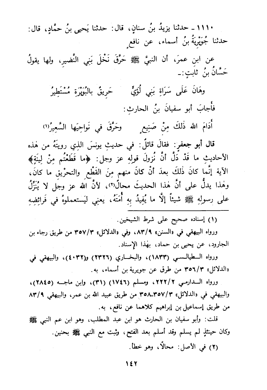 1110 - حَدَّثَنَا يَزِيدُ بْنُ سِنَانٍ، قَالَ: حَدَّثَنَا يَحْيَى بْنُ حَمَّادٍ، قَالَ: حَدَّثَنَا جُوَيْرِيَةُ بْنُ أَسْمَاءَ، عَنْ نَافِعٍ، عَنِ ابْنِ عُمَرَ، " أَنَّ النَّبِيَّ صَلَّى اللَّهُ عَلَيْهِ وَسَلَّمَ حَرَّقَ نَخْلَ بَنِي النَّضِيرِ " وَلَهَا يَقُولُ حَسَّانُ بْنُ ثَابِتٍ: