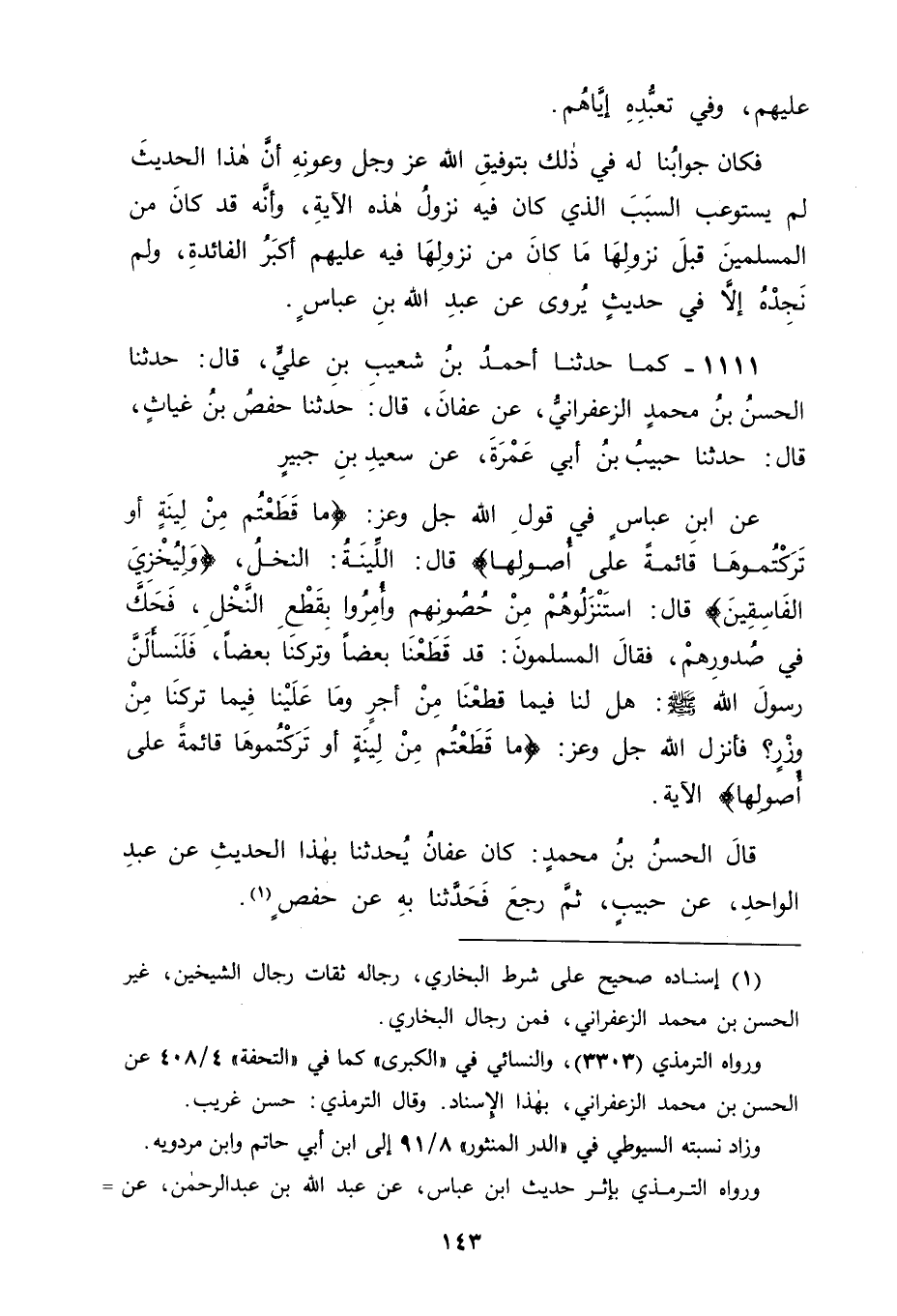 1111 - كَمَا حَدَّثَنَا أَحْمَدُ بْنُ شُعَيْبِ بْنِ عَلِيٍّ، قَالَ: حَدَّثَنَا الْحَسَنُ بْنُ مُحَمَّدٍ الزَّعْفَرَانِيُّ، عَنْ عَفَّانَ، قَالَ: حَدَّثَنَا حَفْصُ بْنُ غِيَاثٍ، قَالَ: حَدَّثَنَا حَبِيبُ بْنُ أَبِي عَمْرَةَ، عَنْ سَعِيدِ بْنِ جُبَيْرٍ، عَنِ ابْنِ عَبَّاسٍ، فِي قَوْلِ اللهِ جَلَّ وَعَزَّ: {مَا قَطَعْتُمْ مِنْ لِينَةٍ أَوْ تَرَكْتُمُوهَا قَائِمَةً عَلَى أُصُولِهَا} [الحشر: 5] قَالَ: " اللِّينَةُ النَّخْلُ وَلِيُخْزِيَ الْفَاسِقِينَ قَالَ: اسْتَنْزَلُوهُمْ مِنْ حُصُونِهِمْ وَأُمِرُوا بِقَطْعِ النَّخْلِ فَحَكَّ فِي صُدُورِهِمْ، فَقَالَ الْمُسْلِمُونَ: قَدْ قَطَعْنَا بَعْضًا وَتَرَكْنَا بَعْضًا فَلَنَسْأَلَنَّ رَسُولَ اللهِ صَلَّى اللَّهُ عَلَيْهِ وَسَلَّمَ، هَلْ لَنَا فِيمَا قَطَعْنَا مِنْ أَجْرٍ وَمَا عَلَيْنَا فِيمَا تَرَكْنَا مِنْ وِزْرٍ؟ فَأَنْزَلَ جَلَّ وَعَزَّ: {مَا قَطَعْتُمْ مِنْ لِينَةٍ أَوْ تَرَكْتُمُوهَا قَائِمَةً عَلَى أُصُولِهَا} [الحشر: 5] الْآيَةَ " قَالَ الْحَسَنُ بْنُ مُحَمَّدٍ: كَانَ عَفَّانُ يُحَدِّثُنَا بِهَذَا الْحَدِيثِ عَنْ عَبْدِ الْوَاحِدِ، عَنْ حَبِيبٍ ثُمَّ رَجَعَ فَحَدَّثَنَا بِهِ عَنْ حَفْصٍ. -[144]- قَالَ أَبُو جَعْفَرٍ: فَعَقَلْنَا بِذَلِكَ أَنَّ هَذِهِ الْآيَةَ أَنْزَلَهَا اللهُ عَزَّ وَجَلَّ عَلَى رَسُولِ اللهِ صَلَّى اللَّهُ عَلَيْهِ وَسَلَّمَ لِيَعْلَمَ بِهَا الْمُسْلِمُونَ أَنَّ الَّذِي كَانَ مِنْ قَطْعِهِمْ لَمَّا قَطَعُوا مِنْ نَخْلِ بَنِي النَّضِيرِ وَتَحْرِيقِهَا مُبَاحٌ لَهُمْ لَا إِثْمَ عَلَيْهِمْ فِيهِ , وَأَنَّ الَّذِي تَرَكُوهُ مِنْهَا فَلَمْ يَقْطَعُوهُ وَلَمْ يُحَرِّقُوهُ مُبَاحٌ لَهُمْ لَا إِثْمَ عَلَيْهِمْ فِيهِ , فَبَانَ بِذَلِكَ مَوْضِعُ الْفَائِدَةِ فِي نُزُولِ هَذِهِ الْآيَةِ. وَقَالَ قَائِلٌ آخَرُ: قَدْ رُوِيَ عَنْ أَبِي بَكْرٍ الصِّدِّيقِ رَضِيَ اللهُ عَنْهُ فِيمَا كَانَ تَقَدَّمَ بِهِ إِلَى أُمَرَاءِ الْأَجْنَادِ لَمَّا وَجَّهَهُمْ إِلَى الشَّامِ مَا يَدُلُّ عَلَى خِلَافِ مَا فِي هَذِهِ الْأَحَادِيثِ عَنِ ابْنِ عُمَرَ وَابْنِ عَبَّاسٍ