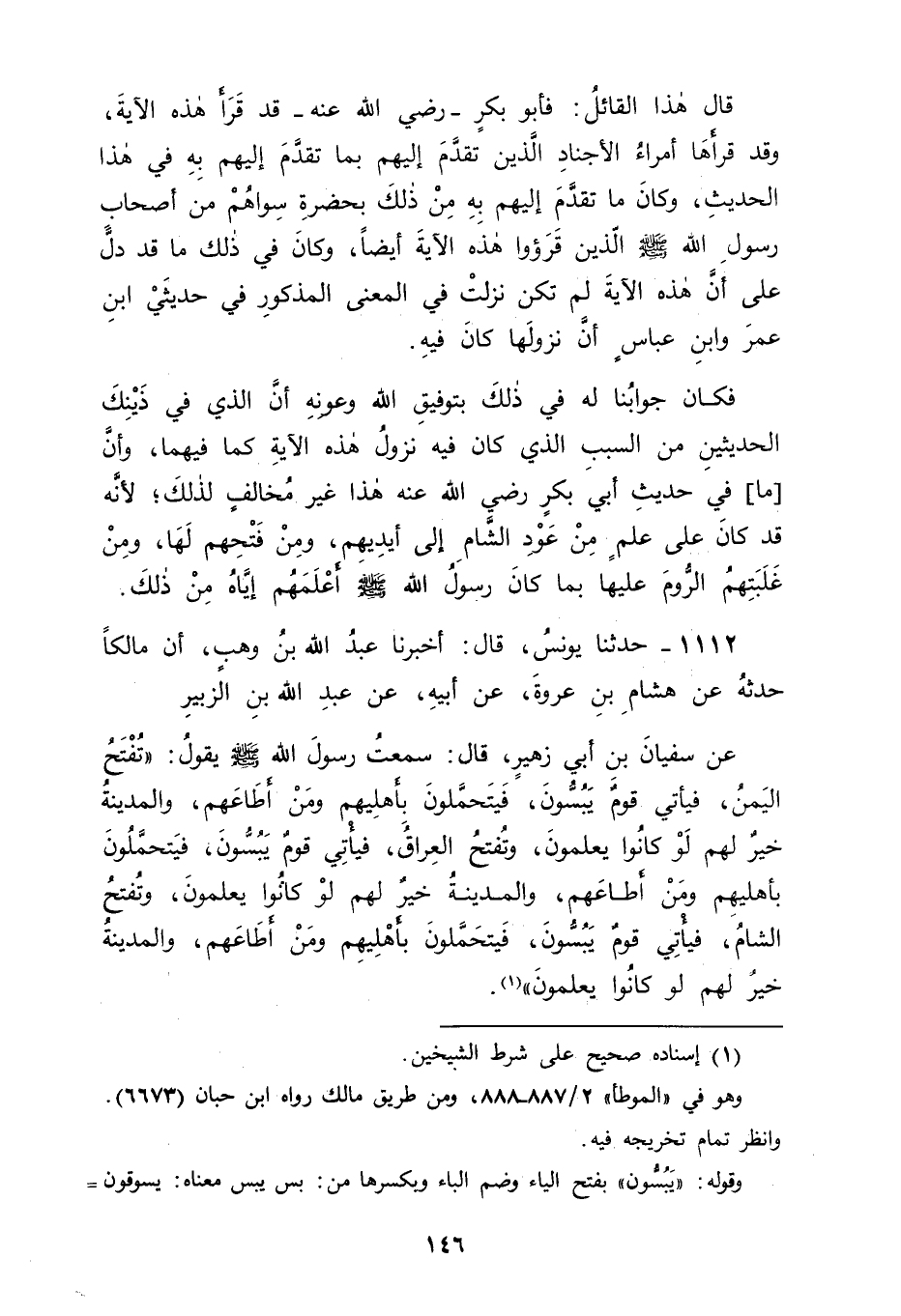 1112 - حَدَّثَنَا يُونُسُ، قَالَ: أَخْبَرَنَا عَبْدُ اللهِ بْنُ وَهْبٍ، أَنَّ مَالِكًا، حَدَّثَهُ عَنْ هِشَامِ بْنِ عُرْوَةَ، عَنْ أَبِيهِ، عَنْ عَبْدِ اللهِ بْنِ الزُّبَيْرِ، عَنْ سُفْيَانَ بْنِ أَبِي زُهَيْرٍ، قَالَ: سَمِعْتُ رَسُولَ اللهِ صَلَّى اللَّهُ عَلَيْهِ وَسَلَّمَ يَقُولُ: " تُفْتَحُ الْيَمَنُ فَيَأْتِي قَوْمٌ يَبُسُّونَ فَيَتَحَمَّلُونَ بِأَهْلِيهِمْ وَمَنْ أَطَاعَهُمْ، وَالْمَدِينَةُ خَيْرٌ لَهُمْ لَوْ كَانُوا يَعْلَمُونَ , وَتُفْتَحُ الْعِرَاقُ فَيَأْتِي قَوْمٌ يَبُسُّونَ فَيَتَحَمَّلُونَ بِأَهْلِيهِمْ وَمَنْ أَطَاعَهُمْ، وَالْمَدِينَةُ خَيْرٌ لَهُمْ لَوْ كَانُوا يَعْلَمُونَ، وَتُفْتَحُ الشَّامُ فَيَأْتِي قَوْمٌ يَبُسُّونَ فَيَتَحَمَّلُونَ بِأَهْلِيهِمْ وَمَنْ أَطَاعَهُمْ، وَالْمَدِينَةُ خَيْرٌ لَهُمْ لَوْ كَانُوا يَعْلَمُونَ " -[147]-