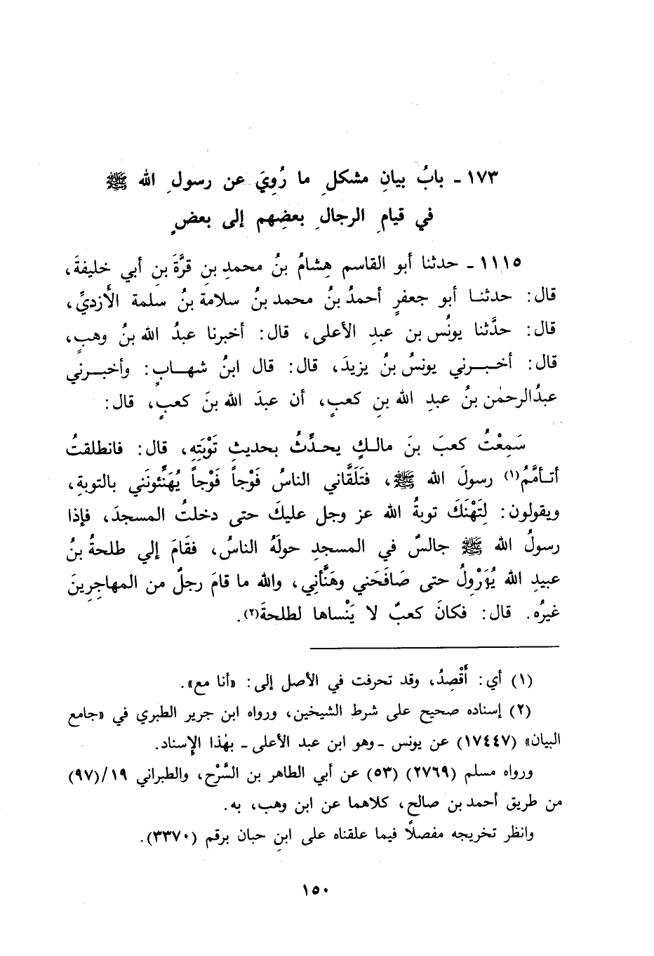 1115 - حَدَّثَنَا أَبُو الْقَاسِمِ هِشَامُ بْنُ مُحَمَّدِ بْنِ قُرَّةَ بْنِ أَبِي خَلِيفَةَ قَالَ: حَدَّثَنَا أَبُو جَعْفَرٍ أَحْمَدُ بْنُ مُحَمَّدِ بْنِ سَلَامَةَ بْنِ سَلَمَةَ الْأَزْدِيُّ قَالَ: حَدَّثَنَا يُونُسُ بْنُ عَبْدِ الْأَعْلَى، قَالَ: ثَنَا عَبْدُ اللهِ بْنُ وَهْبٍ، قَالَ: أَخْبَرَنِي يُونُسُ بْنُ يَزِيدَ، قَالَ: قَالَ ابْنُ شِهَابٍ: وَأَخْبَرَنِي عَبْدُ الرَّحْمَنِ بْنُ عَبْدِ اللهِ بْنِ كَعْبٍ، أَنَّ عَبْدَ اللهِ بْنَ كَعْبٍ، قَالَ: سَمِعْتُ كَعْبَ بْنَ مَالِكٍ، يُحَدِّثُ بِحَدِيثِ تَوْبَتِهِ، قَالَ: فَانْطَلَقْتُ أَتَأَمَّمُ رَسُولَ اللهِ صَلَّى اللَّهُ عَلَيْهِ وَسَلَّمَ فَتَلَقَّانِي النَّاسُ فَوْجًا فَوْجًا يُهَنِّئُونَنِي بِالتَّوْبَةِ , وَيَقُولُونَ: لِتَهْنَكَ تَوْبَةُ اللهِ عَزَّ وَجَلَّ عَلَيْكَ، حَتَّى دَخَلْتُ الْمَسْجِدَ فَإِذَا رَسُولُ اللهِ صَلَّى اللَّهُ عَلَيْهِ وَسَلَّمَ جَالِسٌ فِي الْمَسْجِدِ حَوْلَهُ النَّاسُ فَقَامَ إلَيَّ طَلْحَةُ بْنُ عُبَيْدِ اللهِ يُهَرْوِلُ حَتَّى صَافَحَنِي وَهَنَّأَنِي، وَاللهِ مَا قَامَ رَجُلٌ مِنَ الْمُهَاجِرِينَ غَيْرُهُ، قَالَ: فَكَانَ كَعْبٌ لَا يَنْسَاهَا لِطَلْحَةَ -[151]-