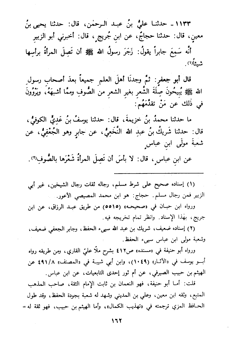 1133 - حَدَّثَنَا عَلِيُّ بْنُ عَبْدِ الرَّحْمَنِ، قَالَ: حَدَّثَنَا يَحْيَى بْنُ مَعِينٍ، قَالَ: حَدَّثَنَا حَجَّاجٌ، عَنِ ابْنِ جُرَيْجٍ، قَالَ: أَخْبَرَنِي أَبُو الزُّبَيْرِ، أَنَّهُ سَمِعَ جَابِرًا، يَقُولُ: " زَجَرَ رَسُولُ اللهِ صَلَّى اللَّهُ عَلَيْهِ وَسَلَّمَ أَنْ تَصِلَ الْمَرْأَةُ بِرَأْسِهَا شَيْئًا " قَالَ أَبُو جَعْفَرٍ: ثُمَّ وَجَدْنَا أَهْلَ الْعِلْمِ جَمِيعًا بَعْدَ أَصْحَابِ رَسُولِ اللهِ صَلَّى اللَّهُ عَلَيْهِ وَسَلَّمَ يُبِيحُونَ صِلَةَ الشَّعْرِ بِغَيْرِ الشَّعْرِ مِنَ الصُّوفِ , وَمِمَّا أَشْبَهَهُ وَيَرْوُونَ فِي ذَلِكَ عَنْ مَنْ تَقَدَّمَهُمْ